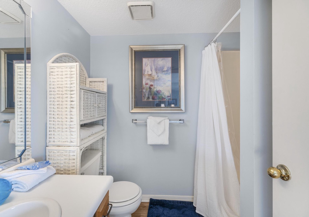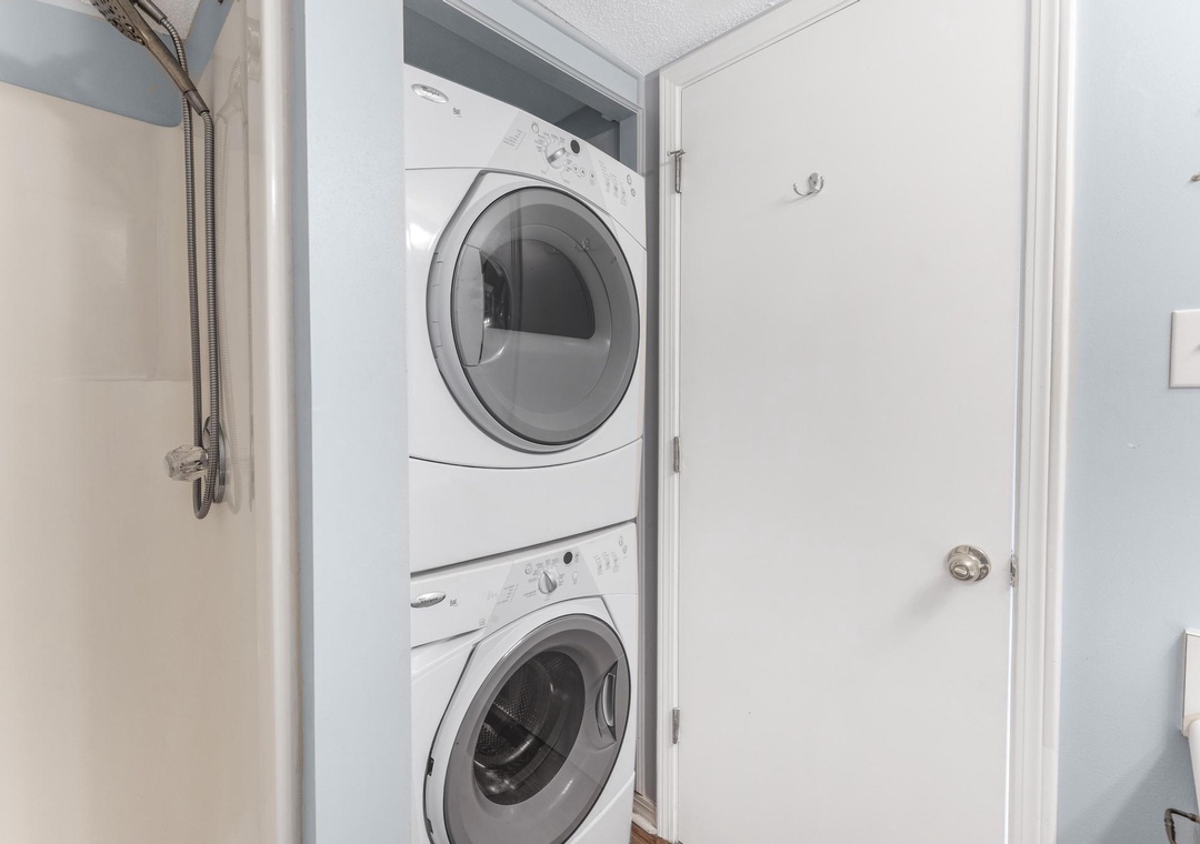 Bathrooms: In addition to the en-suite, the shared bathroom includes a walk-in shower and a stackable washer/dryer combo for added convenience during your stay.