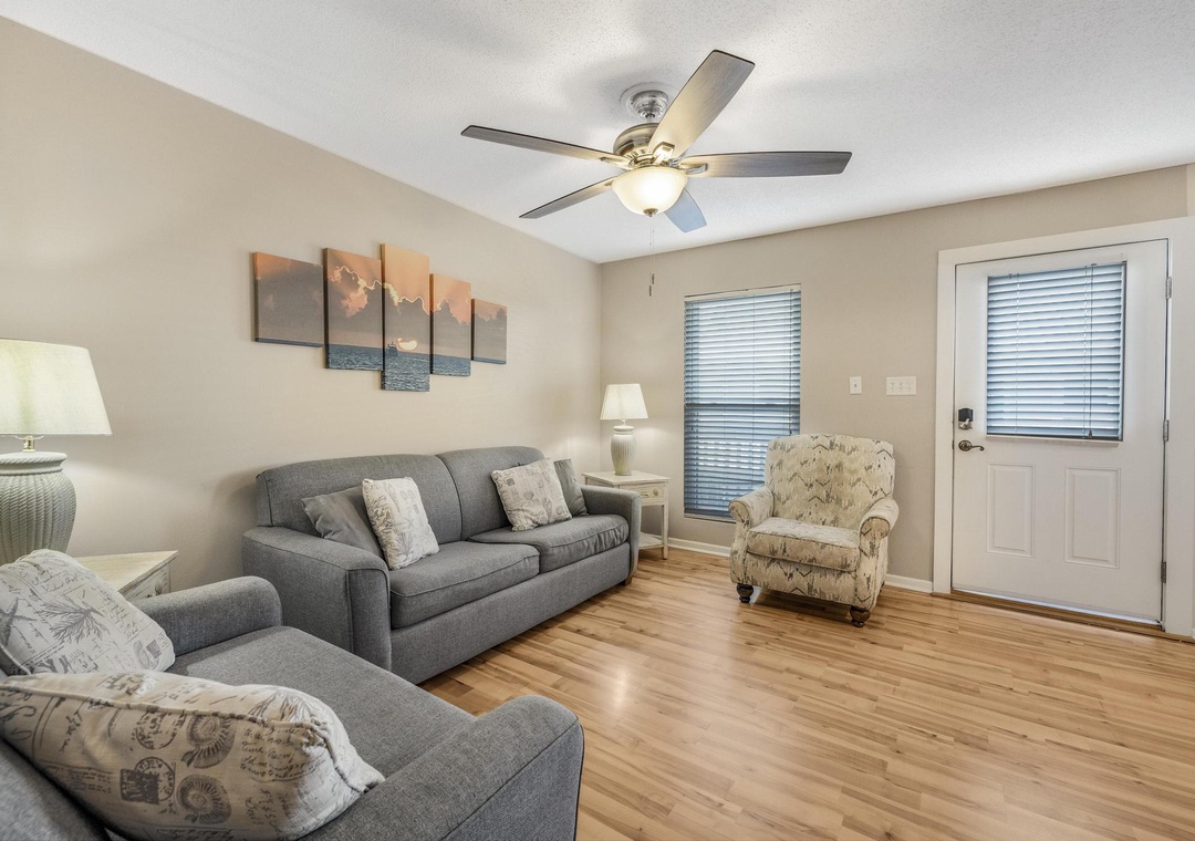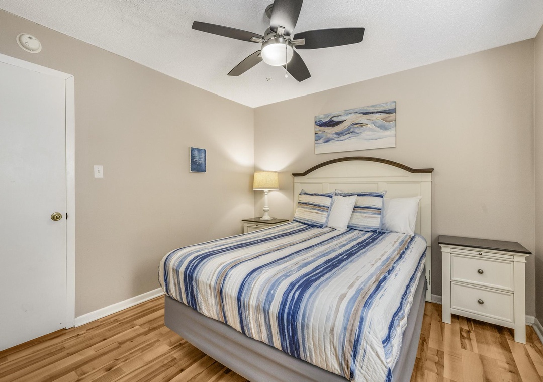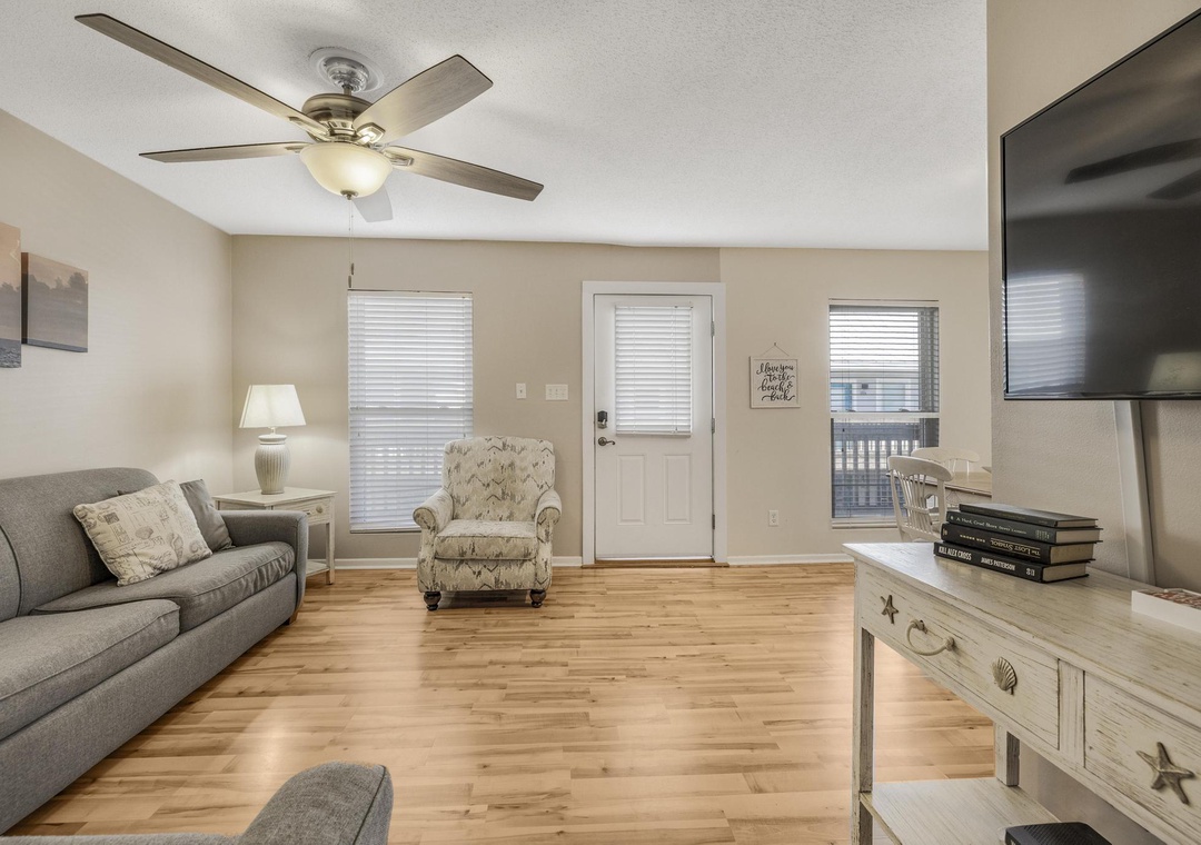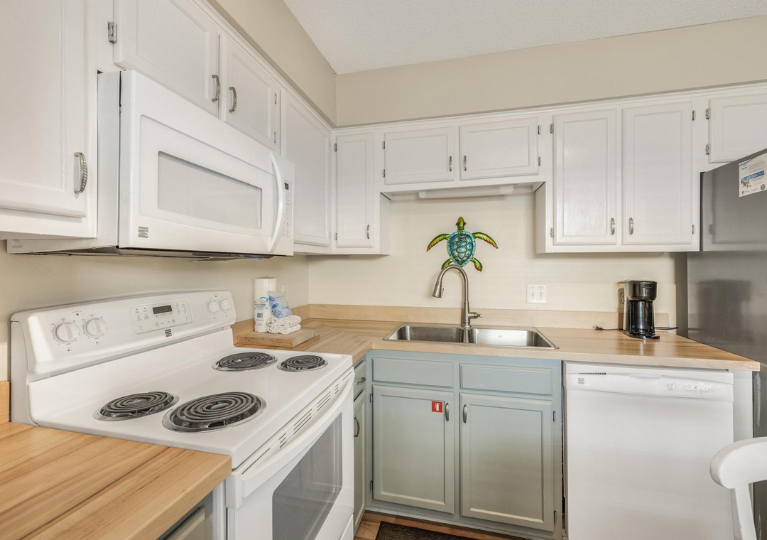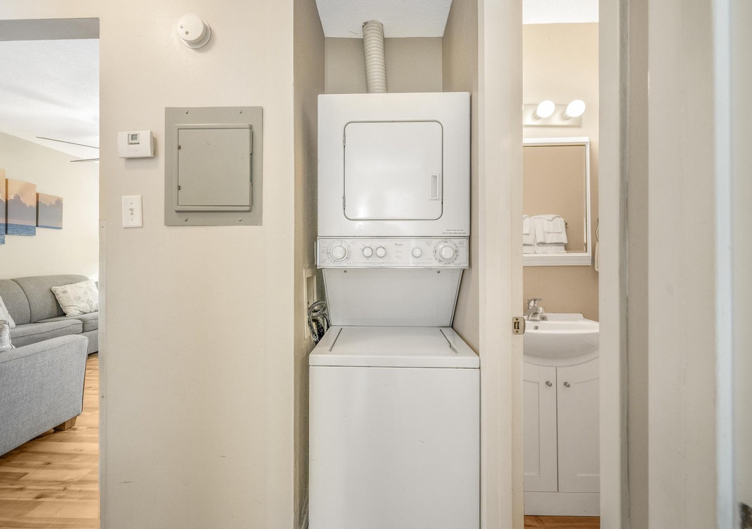 This charming third-floor, two-bedroom, one-bath condo offers a relaxing retreat right on the beachside. Featuring two comfortable queen beds and a sleeper sofa, it comfortably accommodates up to six guests. The unit is thoughtfully designed with a fully equipped kitchen, including new countertops, making it easy to prepare meals with fresh local ingredients. A washer and dryer combo adds extra convenience for longer stays, while the full bath with a tub and shower combo ensures a refreshing way to unwind after a day in the sun.