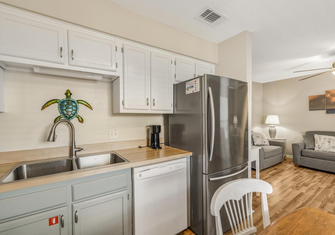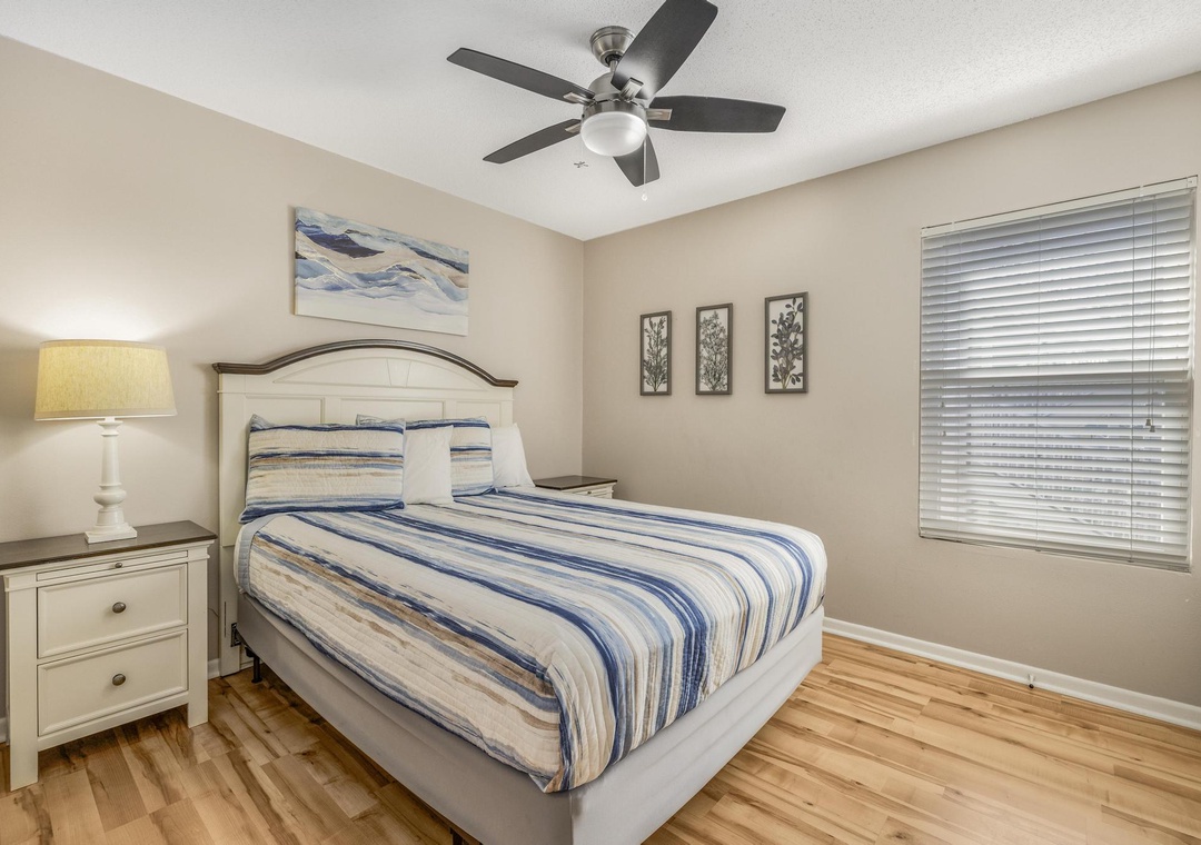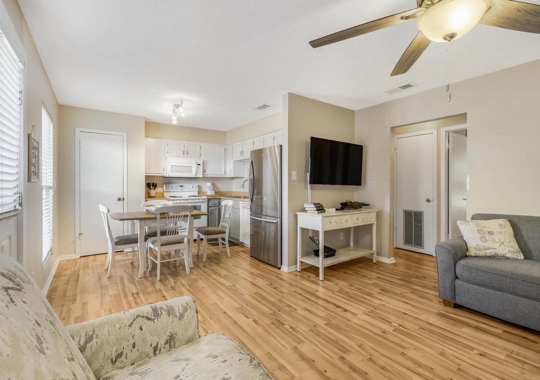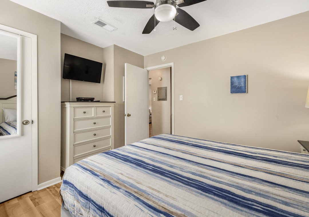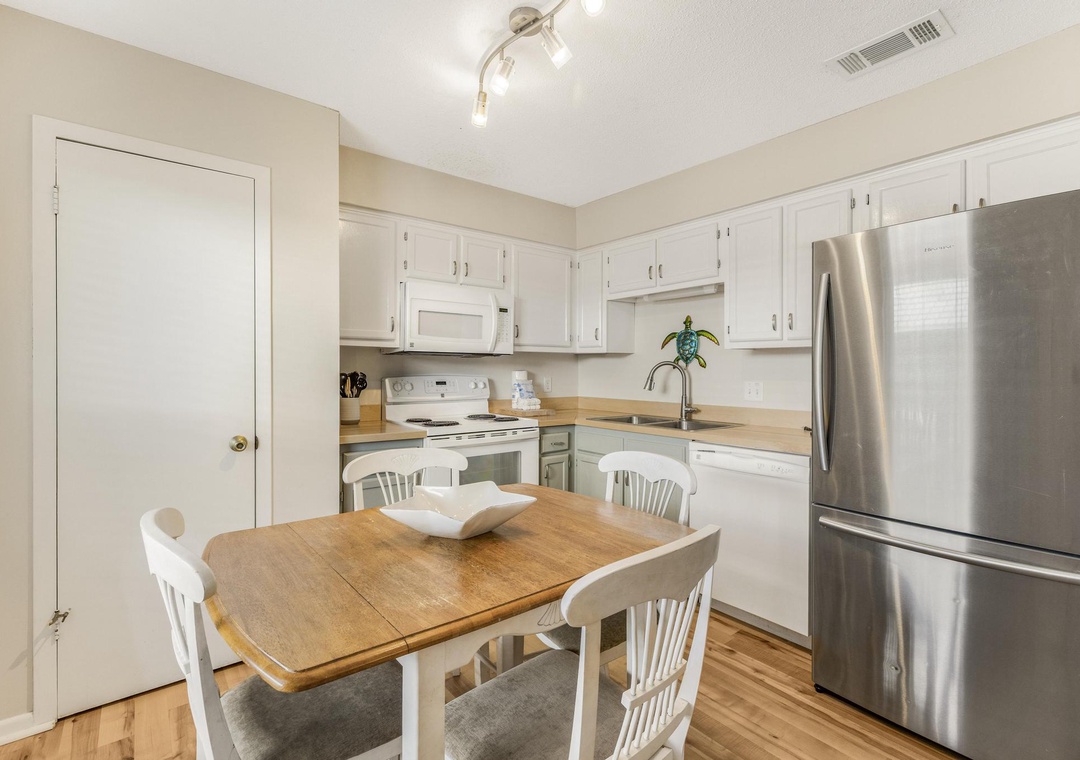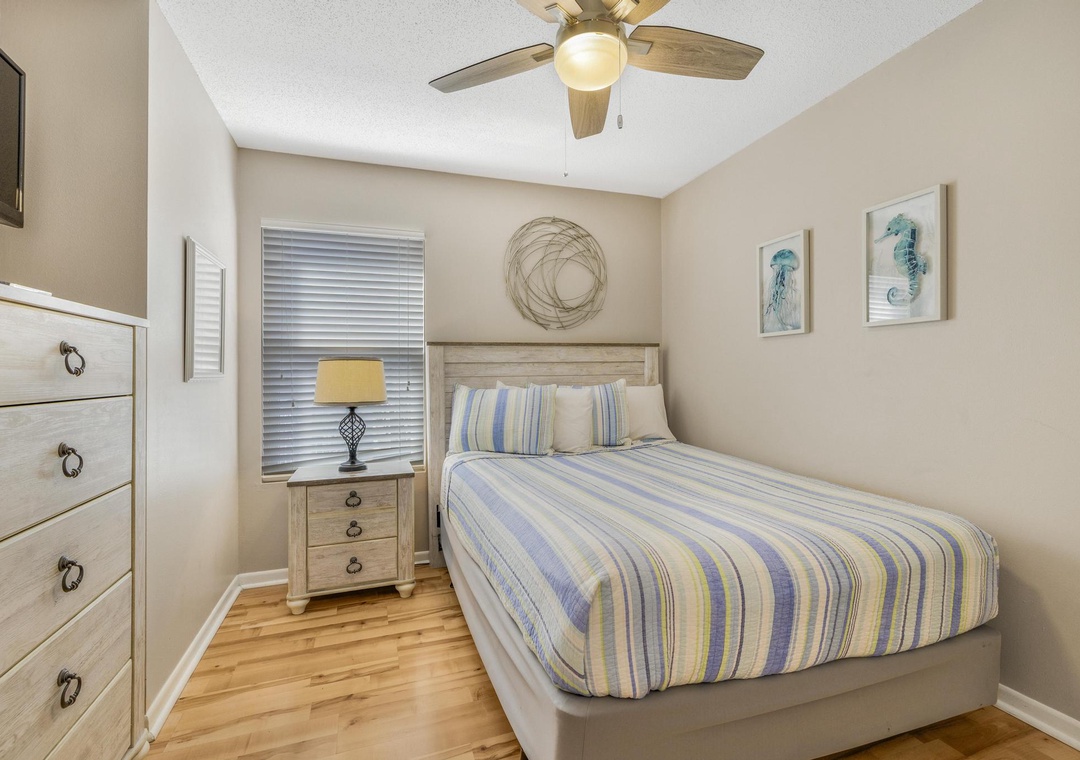 This charming third-floor, two-bedroom, one-bath condo offers a relaxing retreat right on the beachside. Featuring two comfortable queen beds and a sleeper sofa, it comfortably accommodates up to six guests. The unit is thoughtfully designed with a fully equipped kitchen, including new countertops, making it easy to prepare meals with fresh local ingredients. A washer and dryer combo adds extra convenience for longer stays, while the full bath with a tub and shower combo ensures a refreshing way to unwind after a day in the sun.