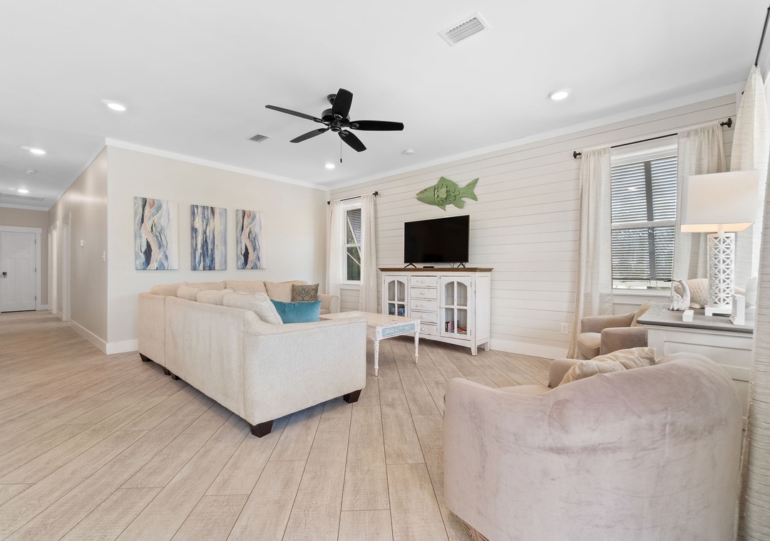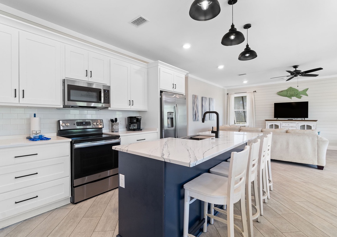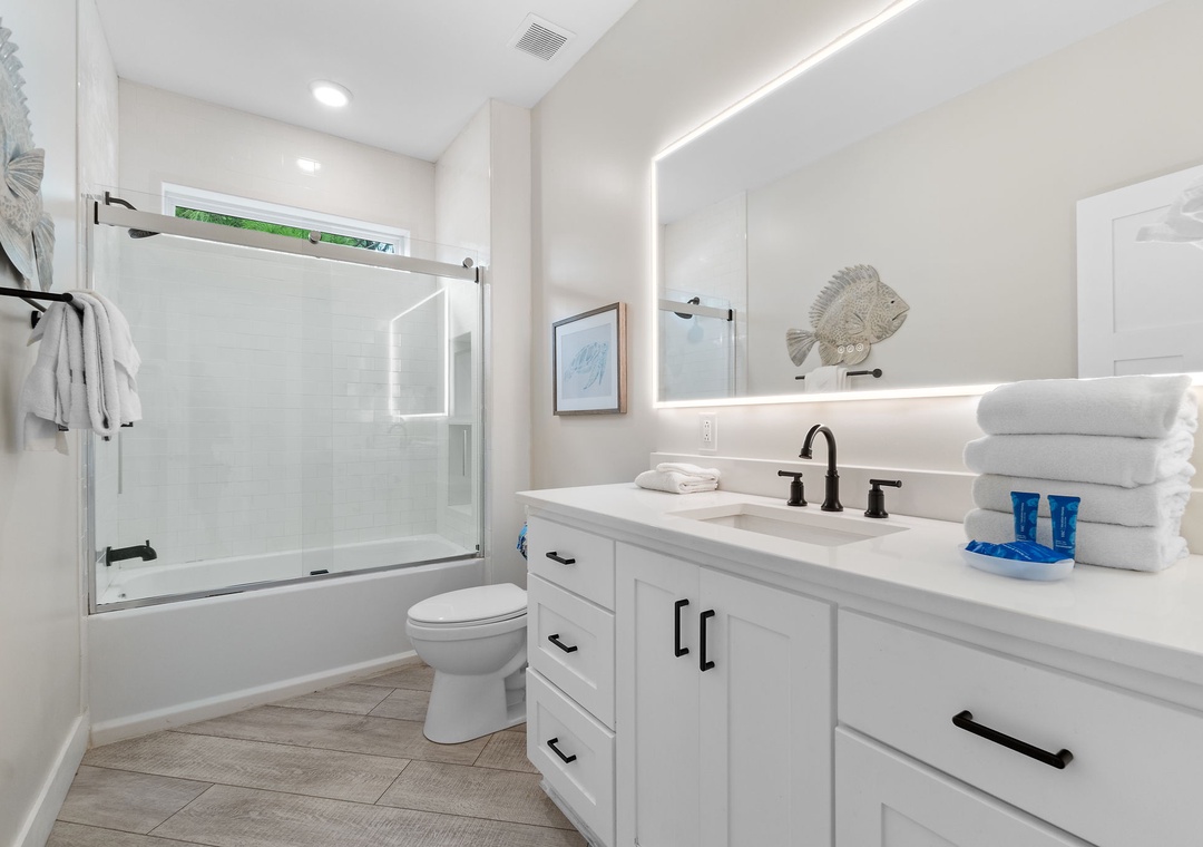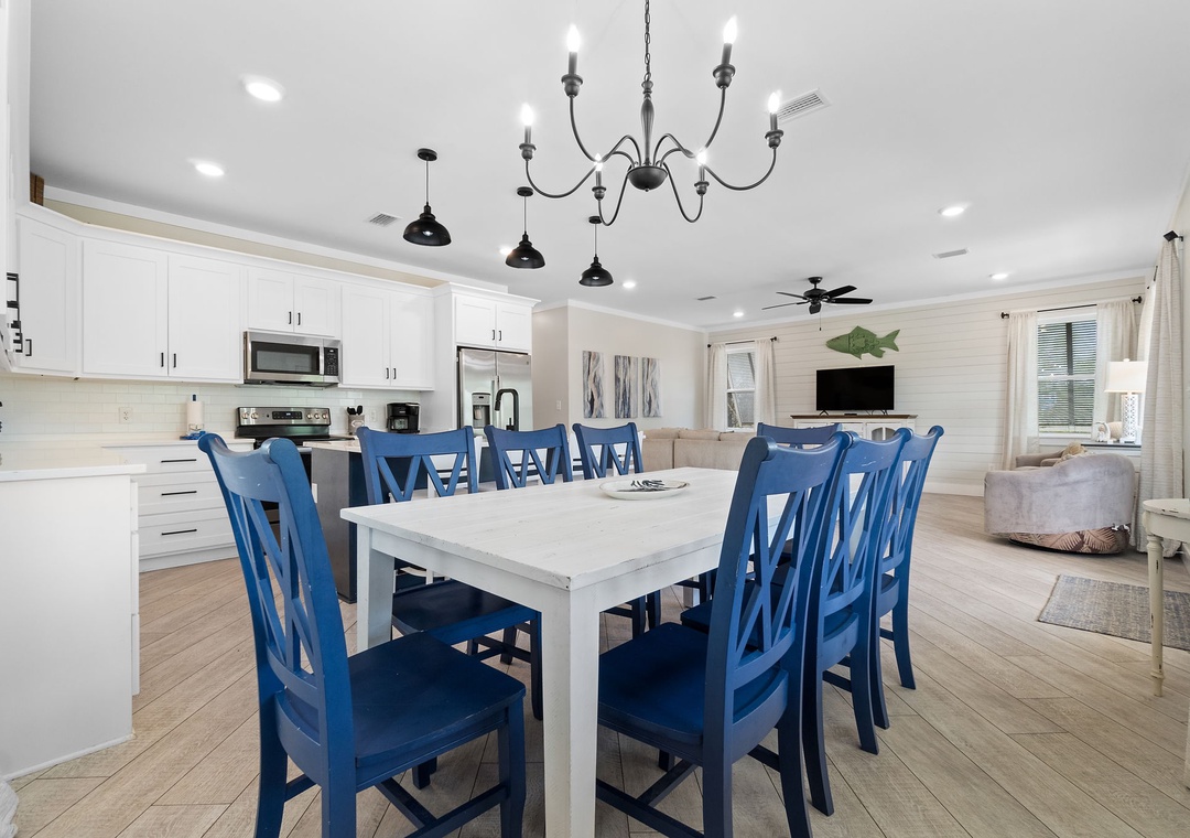 This four-bedroom, two and a half bath home has an open layout, so it feels spacious and inviting. The dining room table offers seating for eight with additional seating at the kitchen island. Also, you will find a washer and dryer for your convenience. There are two bedrooms each with a king size bed, one with an en-suite bathroom featuring a tub/shower combo. The third bedroom features a queen size bed and a double futon. The hallway bathroom has a large walk in shower and double vanity. The fourth bedroom is perfect for the kiddos with full over full bunk bed; it even has a half bath next door. This house is pet-friendly home, so you never have to leave part of your family behind. You may bring up to two dogs up to 20 pounds each.