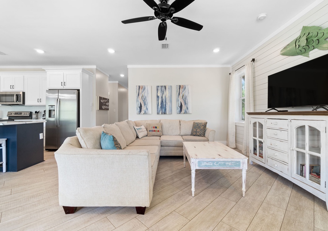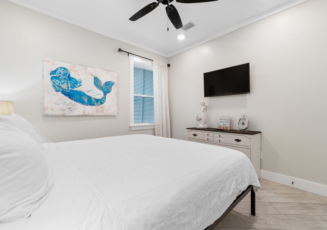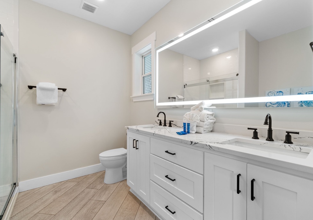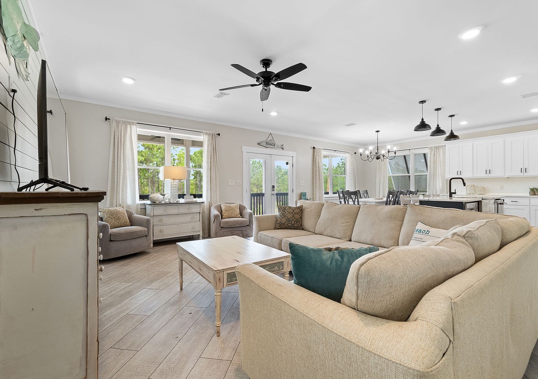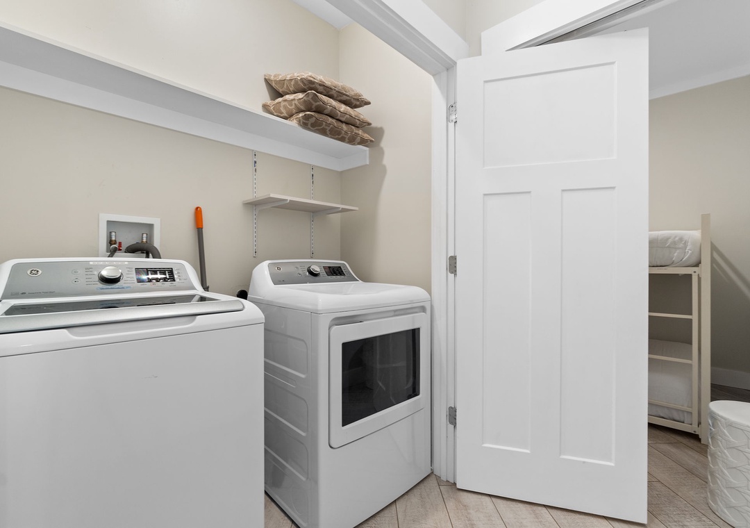 This four-bedroom, two and a half bath home has an open layout, so it feels spacious and inviting. The dining room table offers seating for eight with additional seating at the kitchen island. Also, you will find a washer and dryer for your convenience. There are two bedrooms each with a king size bed, one with an en-suite bathroom featuring a tub/shower combo. The third bedroom features a queen size bed and a double futon. The hallway bathroom has a large walk in shower and double vanity. The fourth bedroom is perfect for the kiddos with full over full bunk bed; it even has a half bath next door. This house is pet-friendly home, so you never have to leave part of your family behind. You may bring up to two dogs up to 20 pounds each.