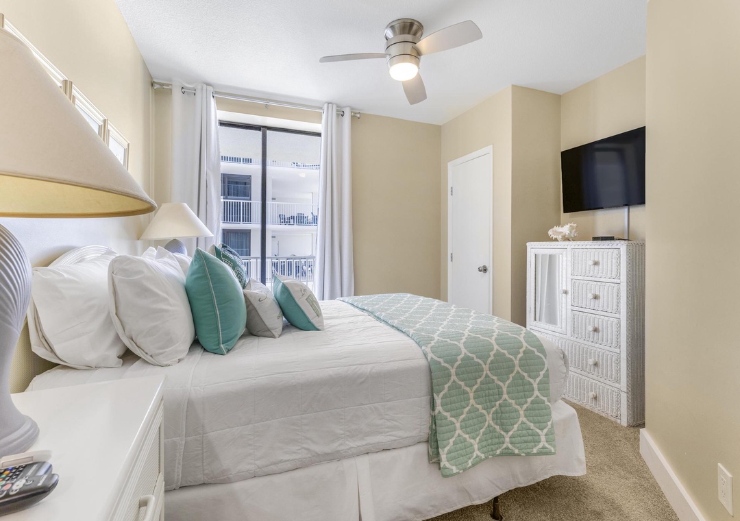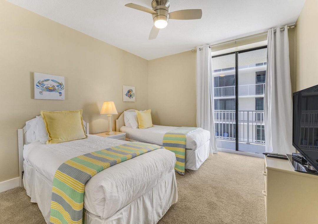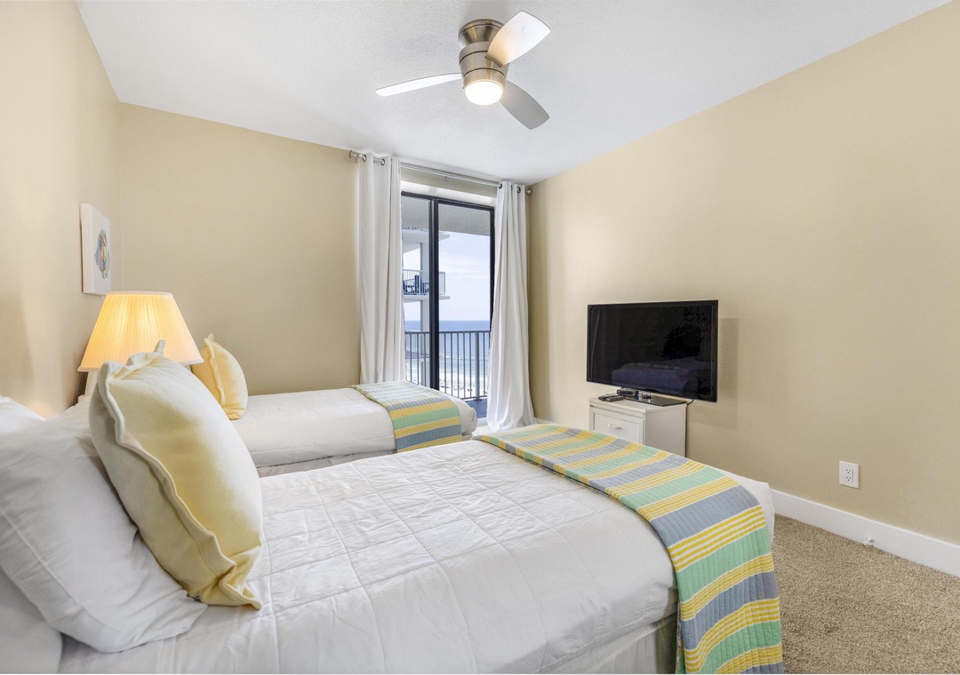 The main bedroom features a king bed with a flat screen TV and access to the balcony. The ensuite main bathroom features a large vanity with a shower/tub combo. The second bedroom features a queen bed with a flat screen TV, and the second bathroom has a shower/tub combo. The third bedroom features two twin beds, accompanied by a flat-screen TV.