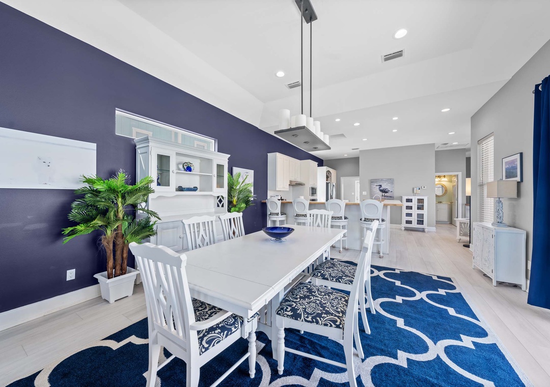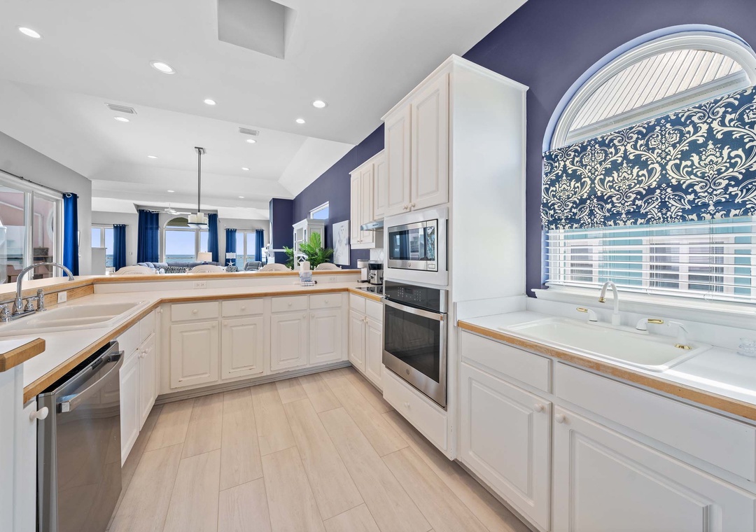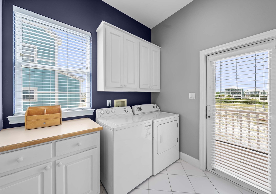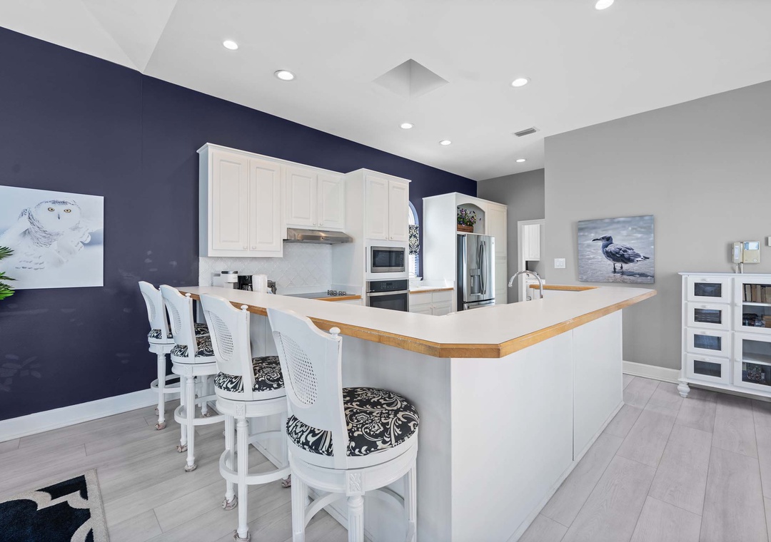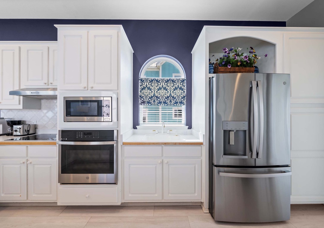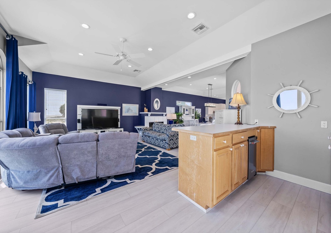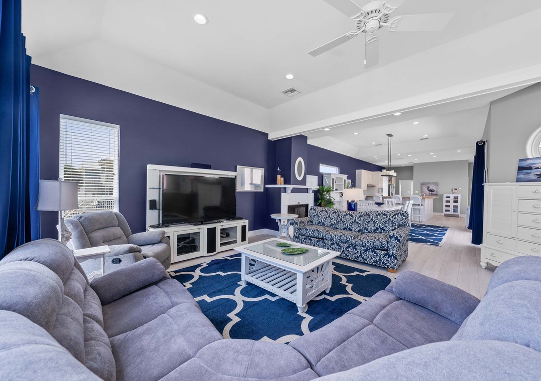 Inside, the open-concept layout features a spacious living room with plush seating and a large flat-screen TV—great for movie nights or game days. The fully equipped kitchen includes modern GE Profile appliances and everything you need to cook up your favorite meals. A washer and dryer are also conveniently located on the main floor.