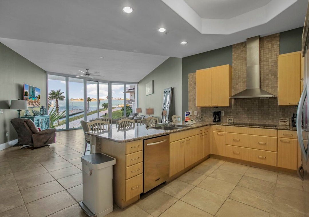 This spacious waterfront condo sits on the ground floor of the magnificent Caribe Resort. A three bedroom and three-bathroom condo with an open concept kitchen and living space. The well-equipped kitchen is stocked with pots/pans/utensils ready to whip up a local seafood dish. The dazzling kitchen features stainless steel appliances with wet bar including an ice maker. Plenty of room for the entire family to enjoy a meal around the dining table for six with additional seating at kitchen bar. The pleasant living space has breathtaking views of the bay sweeping in from the private balcony. Out on the private balcony enjoy your morning coffee or sunset cocktail.
