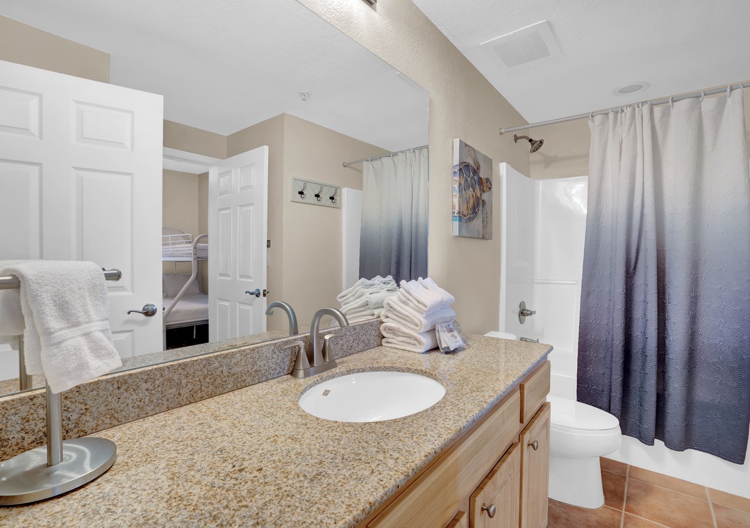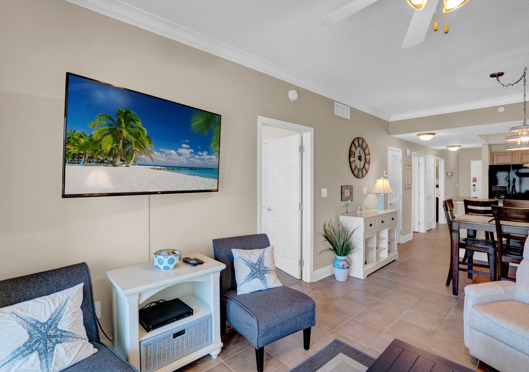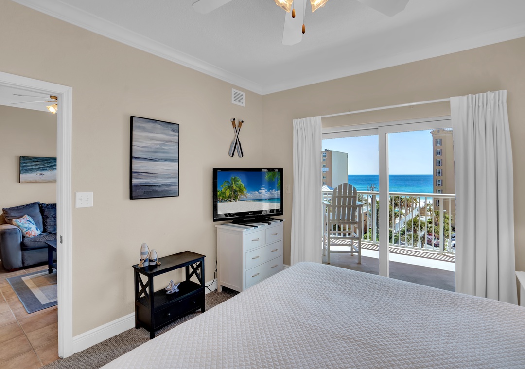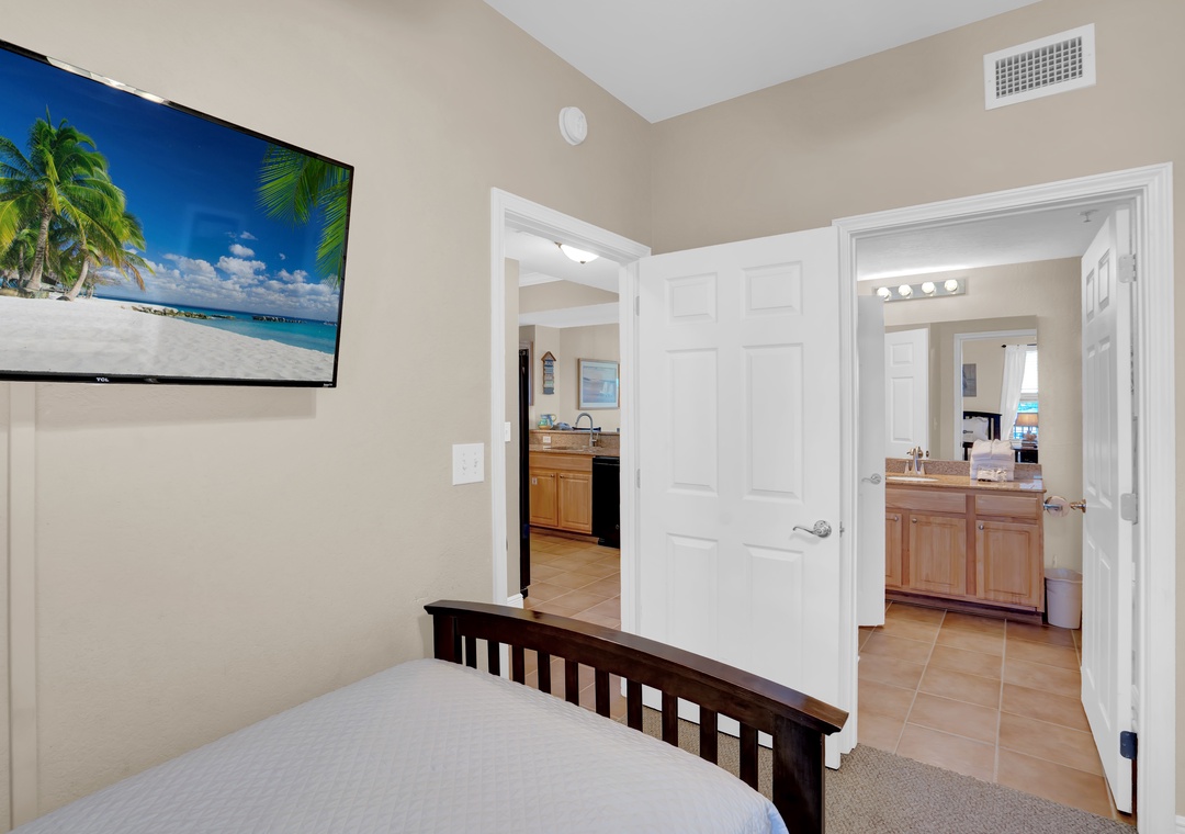 The primary bedroom features a king bed, flat-screen TV, balcony access, and an ensuite bath with double vanities and a shower/tub combo. The second bedroom is ideal for kids or additional guests, offering a twin-over-full bunk bed plus a separate twin bed, flat-screen TV, and walk-in closet. With comfortable sleeping arrangements for up to 8 guests, this condo is ideal for families or groups.