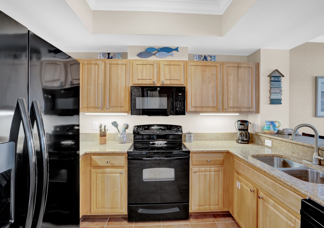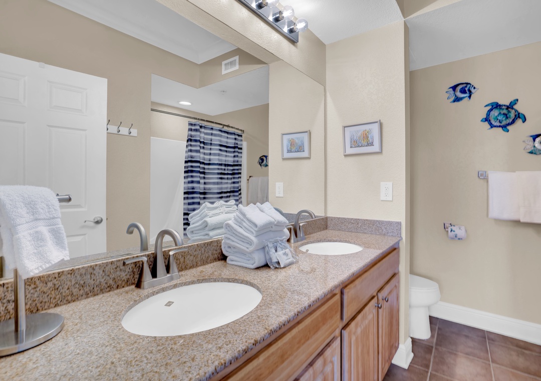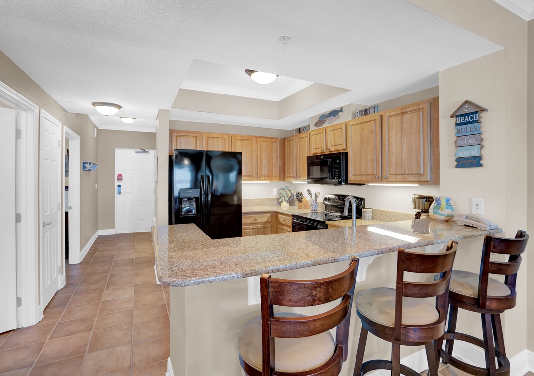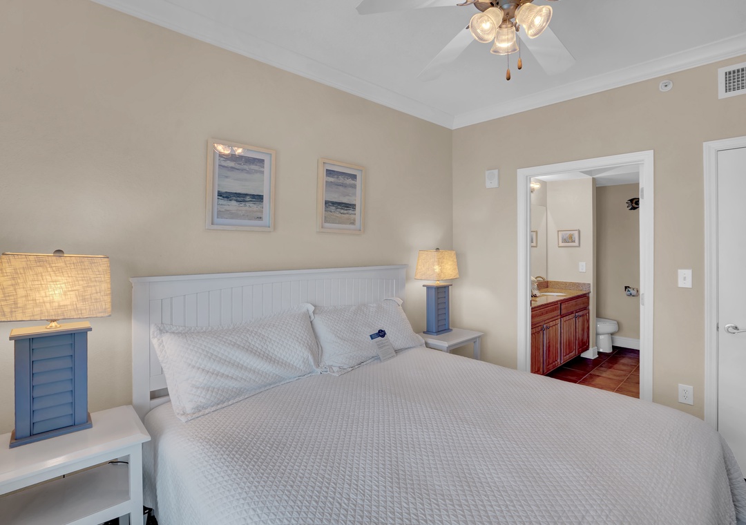 The primary bedroom features a king bed, flat-screen TV, balcony access, and an ensuite bath with double vanities and a shower/tub combo. The second bedroom is ideal for kids or additional guests, offering a twin-over-full bunk bed plus a separate twin bed, flat-screen TV, and walk-in closet. With comfortable sleeping arrangements for up to 8 guests, this condo is ideal for families or groups.