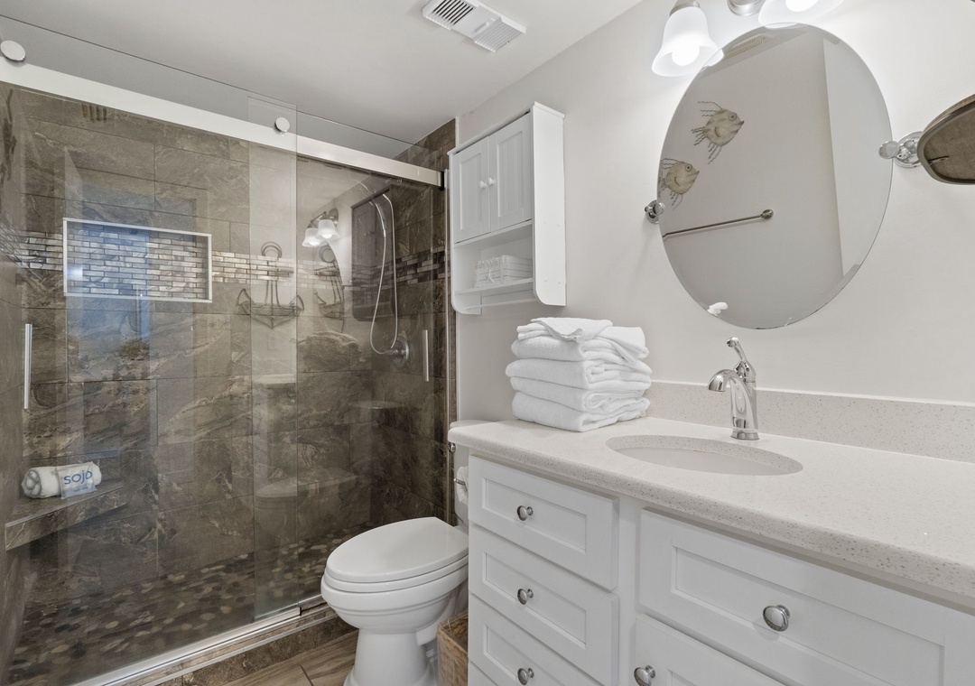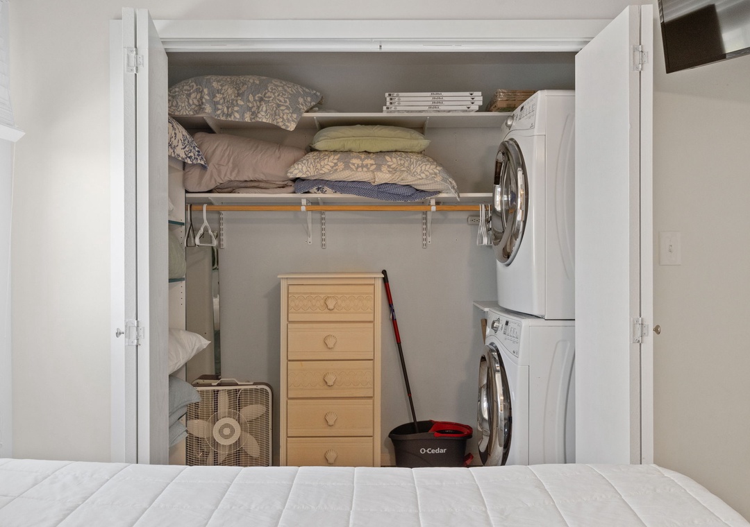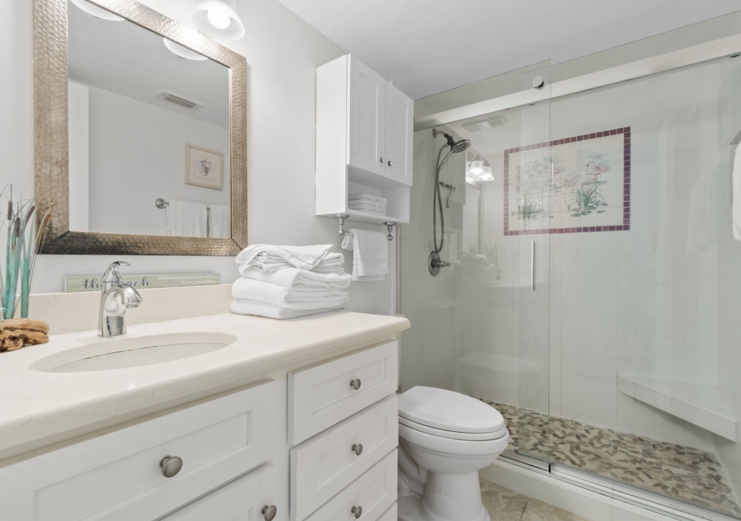 The main bedroom features a king-size bed with views of the gulf. The main bathroom has a walk-in shower. The second bedroom features a queen-size bed and bathroom with additional walk-in shower. Third bedroom has a queen-size bed and bunkbed with twin over double. The third bathroom has a shower/tub combo. There is a washer/dryer for your convenience in the closet of third bedroom.