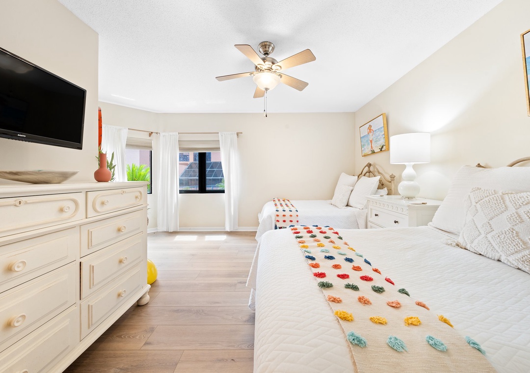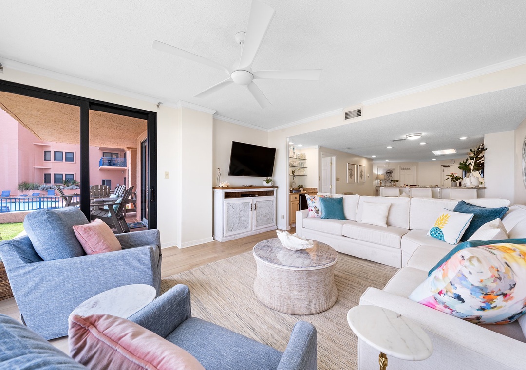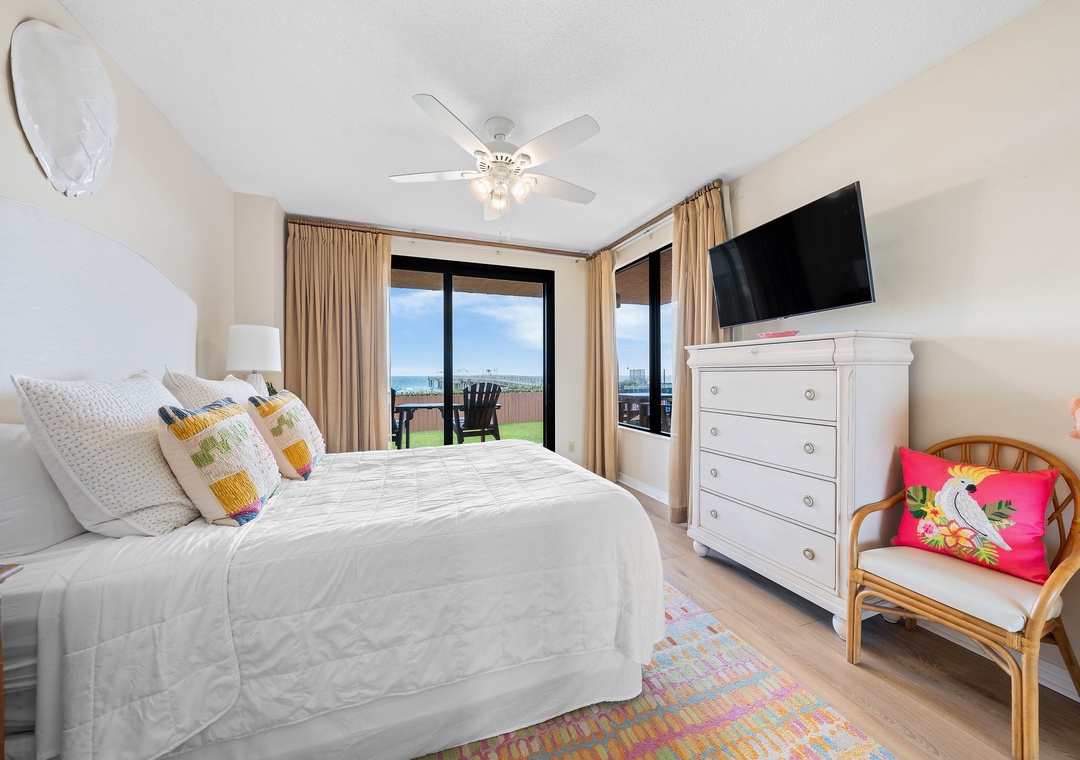 Walk into this one-of-a-kind large ground floor three-bedroom unit. The well-equipped kitchen has plenty of room to whip up a local seafood dish. Kick back and relax in the comfortable living space with sectional sofa and flat screen TV. Enjoy a meal around the dining table with seating for six or enjoy the breakfast bar seating for three. Natural light flows into the large main bedroom with balcony access featuring a king-size bed. The en-suite main bathroom has a double vanity and walk in shower. Second bedroom has two double-size beds and a twin bunk bed along with flat screen tv. The hallway bathroom features a large walk-in shower. The third bedroom has balcony access with a queen-size bed en-suite bathroom featuring a shower/tub combo. The private balcony showcases the white sandy beaches and overlook the outdoor pool area.