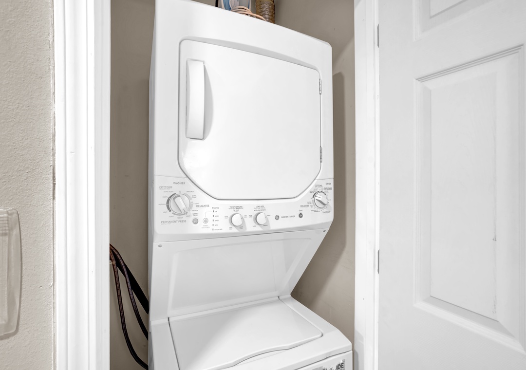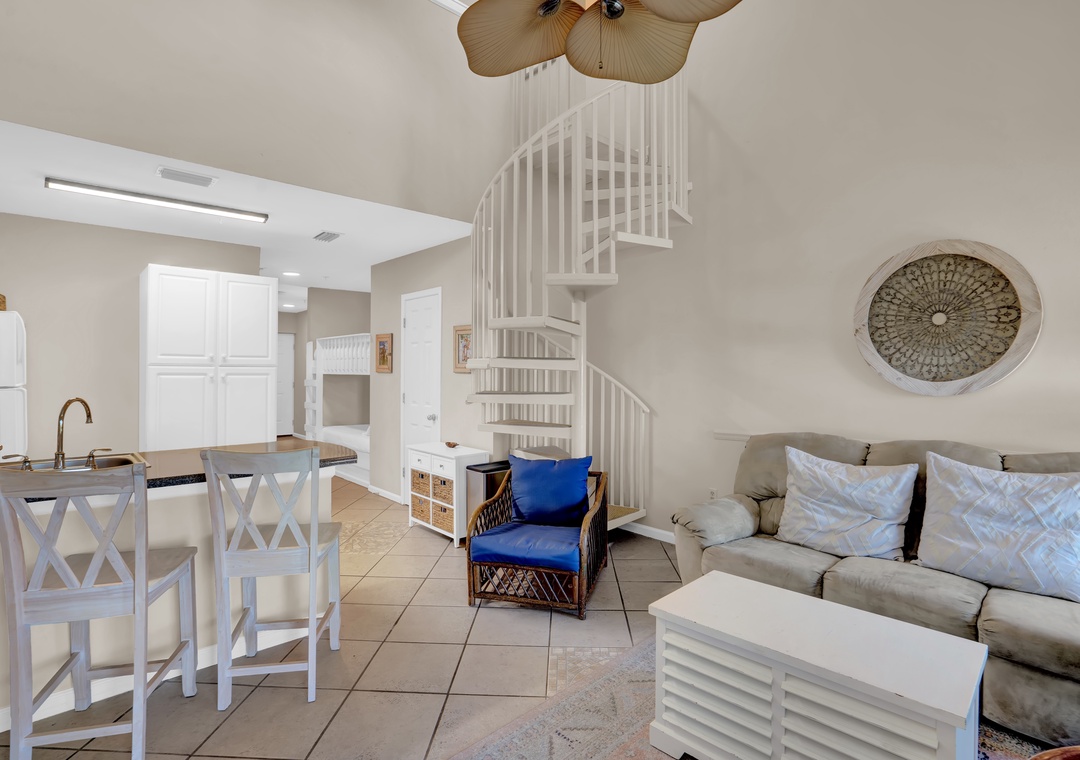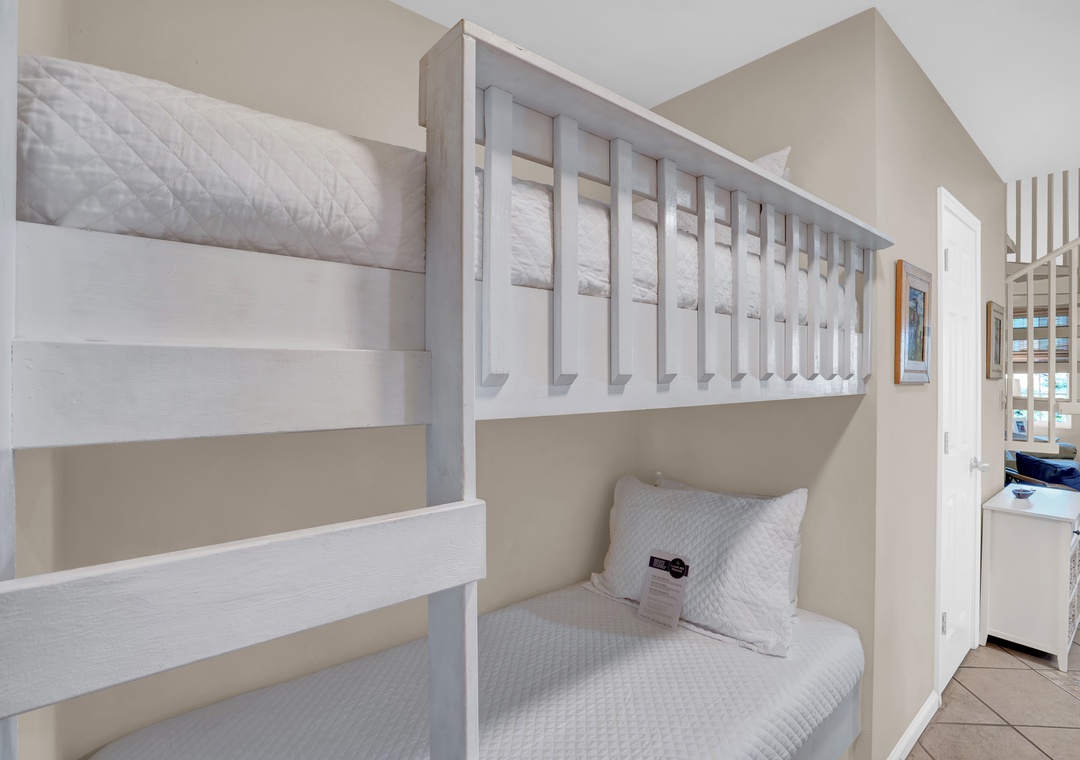 Inside, enjoy a cozy primary bedroom with a queen bed and private bath, plus a loft bedroom with another queen bed — both equipped with flat-screen TVs. A twin bunk in the hallway provides additional sleeping space for kids or extra guests. The fully equipped kitchen and tile flooring make cooking and cleanup easy, while the stackable washer and dryer add convenience for longer stays.