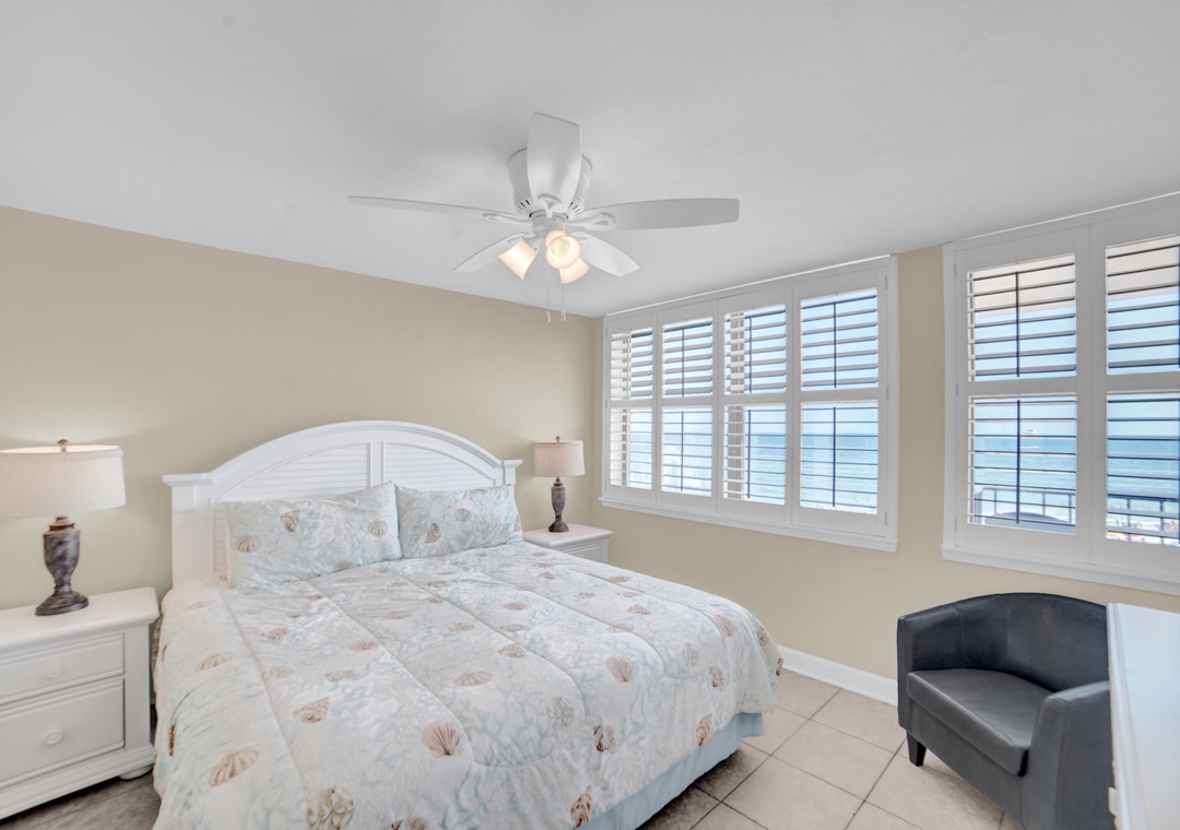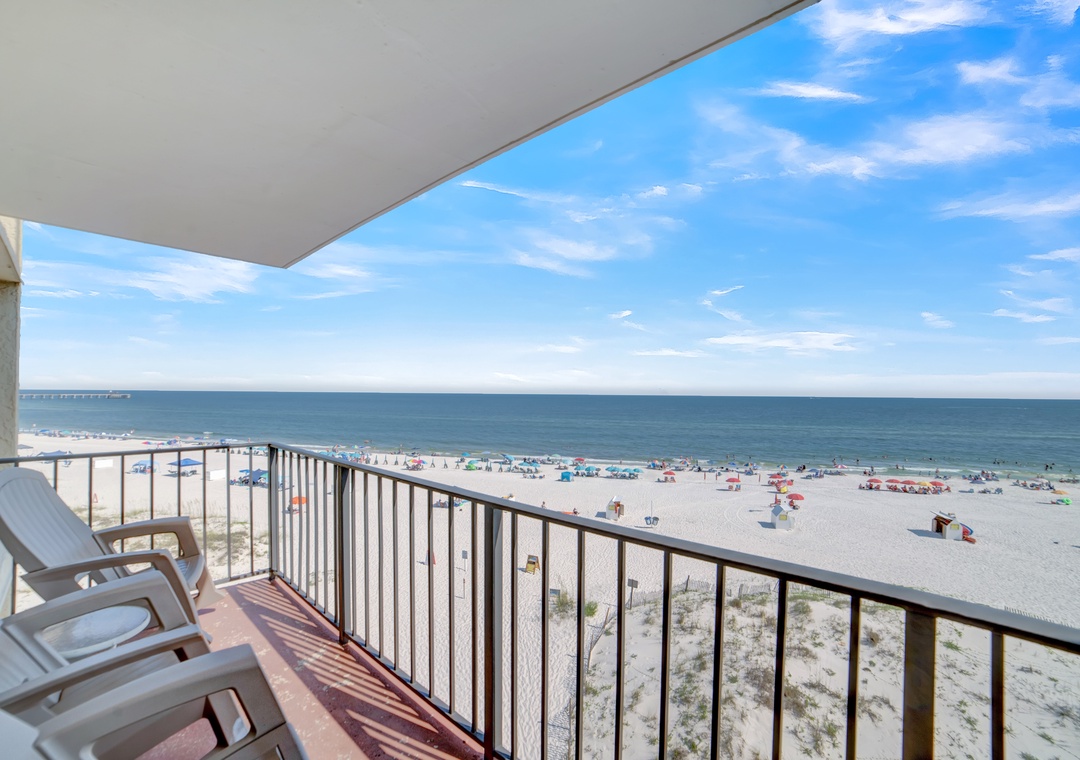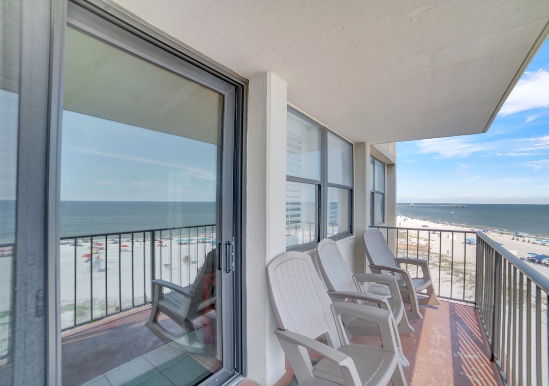 The spacious private deck features four large rocking chairs—ideal for relaxing while enjoying the sweeping Gulf views. Inside, you'll find a comfortable layout with a king bed in the primary bedroom (with en-suite bath), two twin beds in the second bedroom, and a full bed in the third. You're just a short beach stroll from the Gulf State Fishing Pier or popular local spots like The Hangout, Sea & Suds, and Pink Pony Pub.