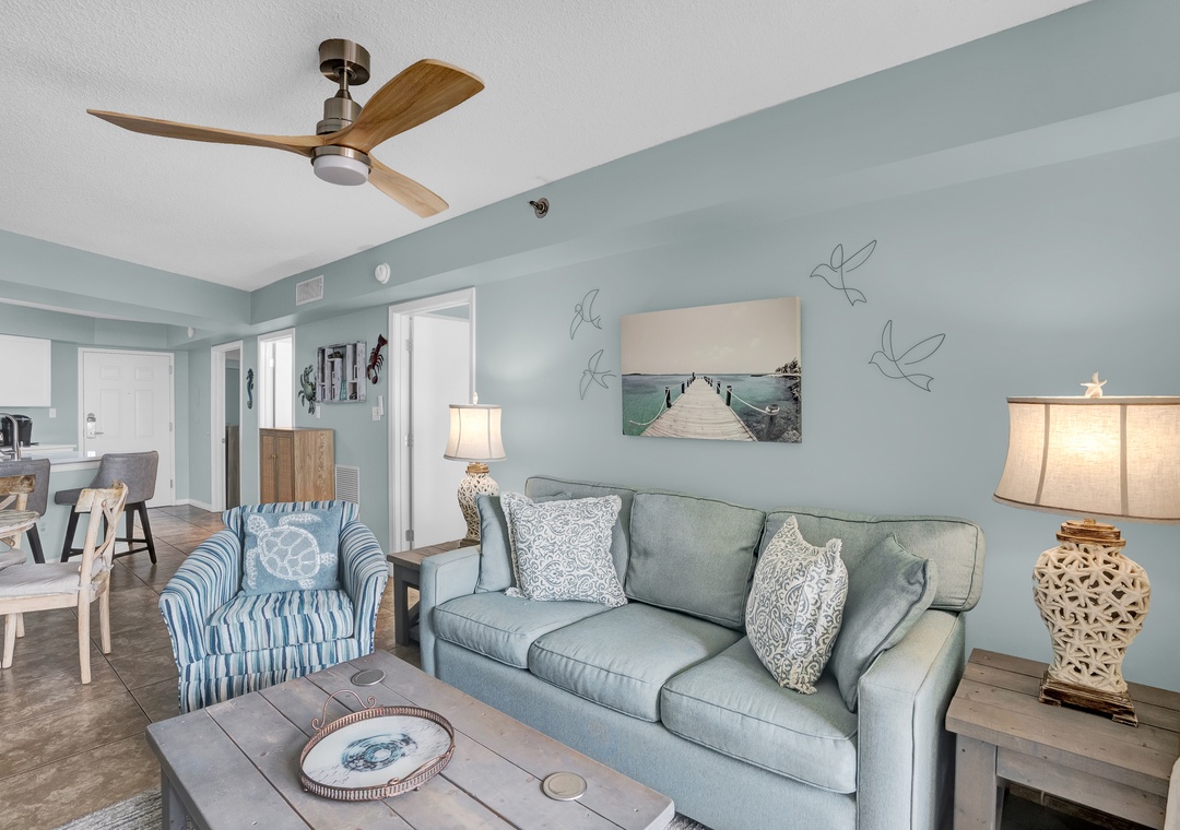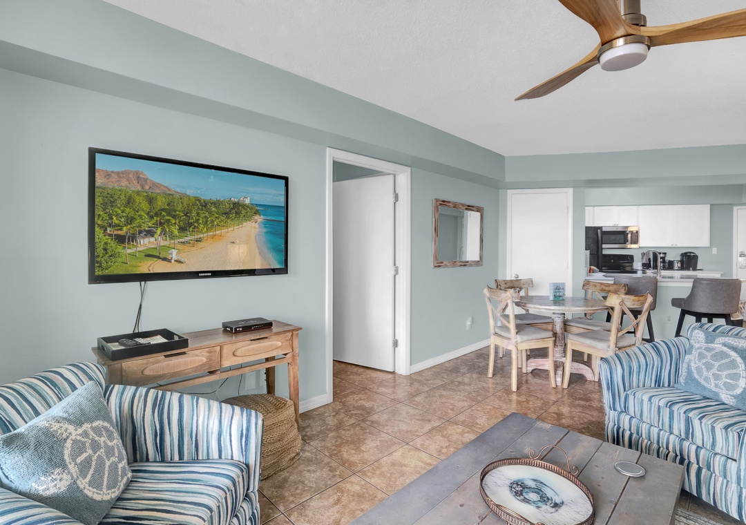 Designed for comfort and convenience, Harbor Place 109 features two spacious bedrooms with plush king beds, ensuring restful nights after sun-soaked beach days. A third bedroom, outfitted with cozy twin bunk beds, is ideal for younger guests or additional visitors, while a sofa sleeper in the living room extends the accommodation to host up to eight guests. A fully equipped kitchen allows for effortless meal preparation, while in-unit laundry and complimentary WiFi add to the ease of your stay. With its warm décor, inviting ambiance, and unbeatable location, this condo is a perfect coastal escape for families or groups looking to create lasting beachside memories.