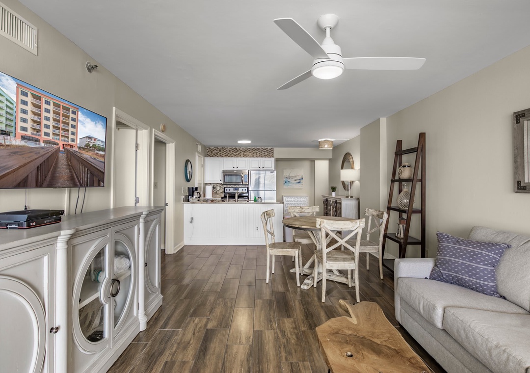 An open concept living space with light flowing in from the balcony welcomes you in. The living space is gorgeously decorated and features a sleeper sofa with flat screen TV. The dining table comfortably seats four ready for a family meal to be enjoyed. The well-equipped kitchen is stocked with pots, pans and utensils to make meal times easy. You'll experience serene décor and breathtaking views from the balcony and main bedroom making Harbour Place 413 your vacation home away from home.