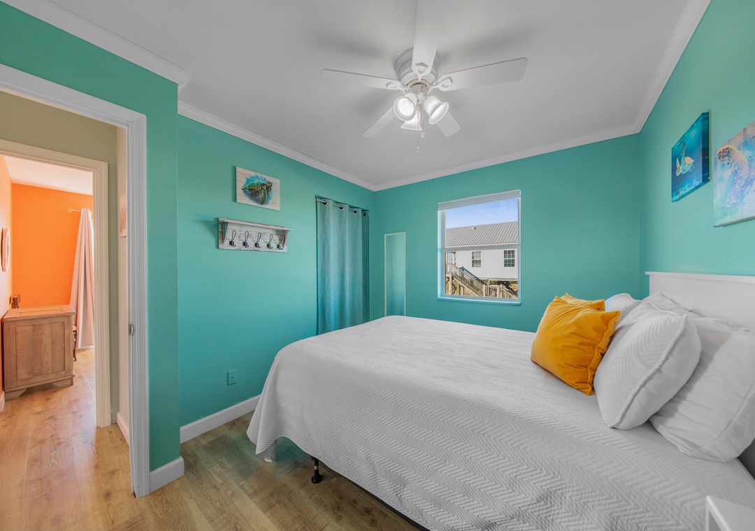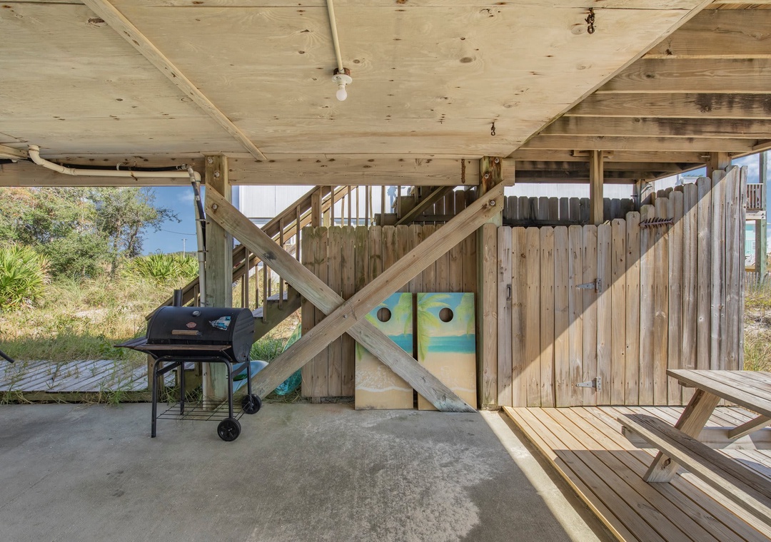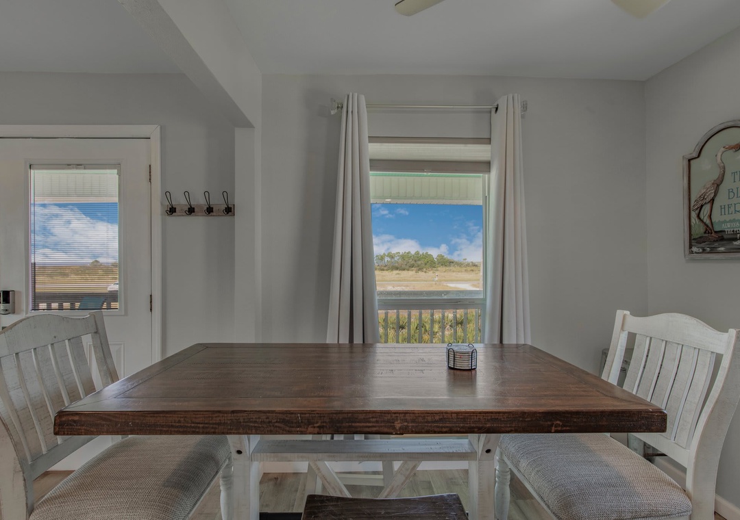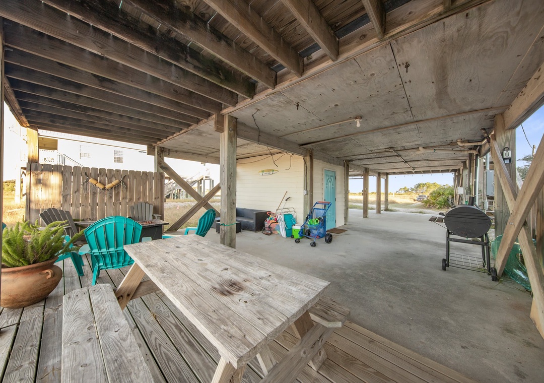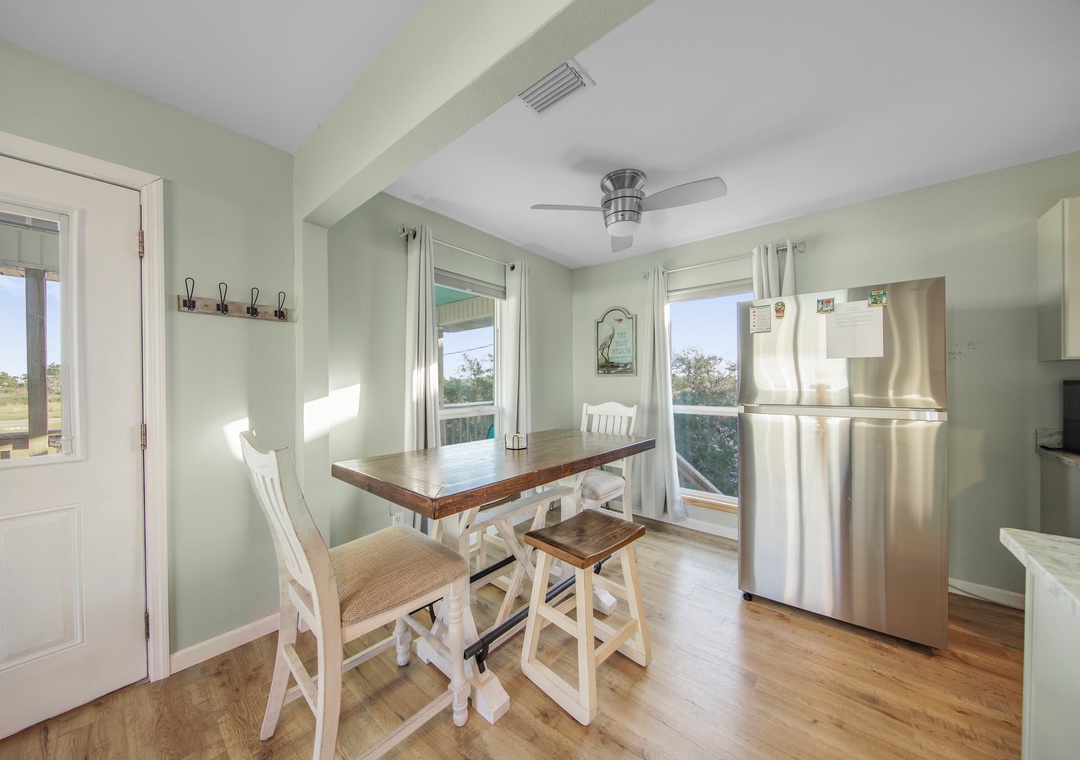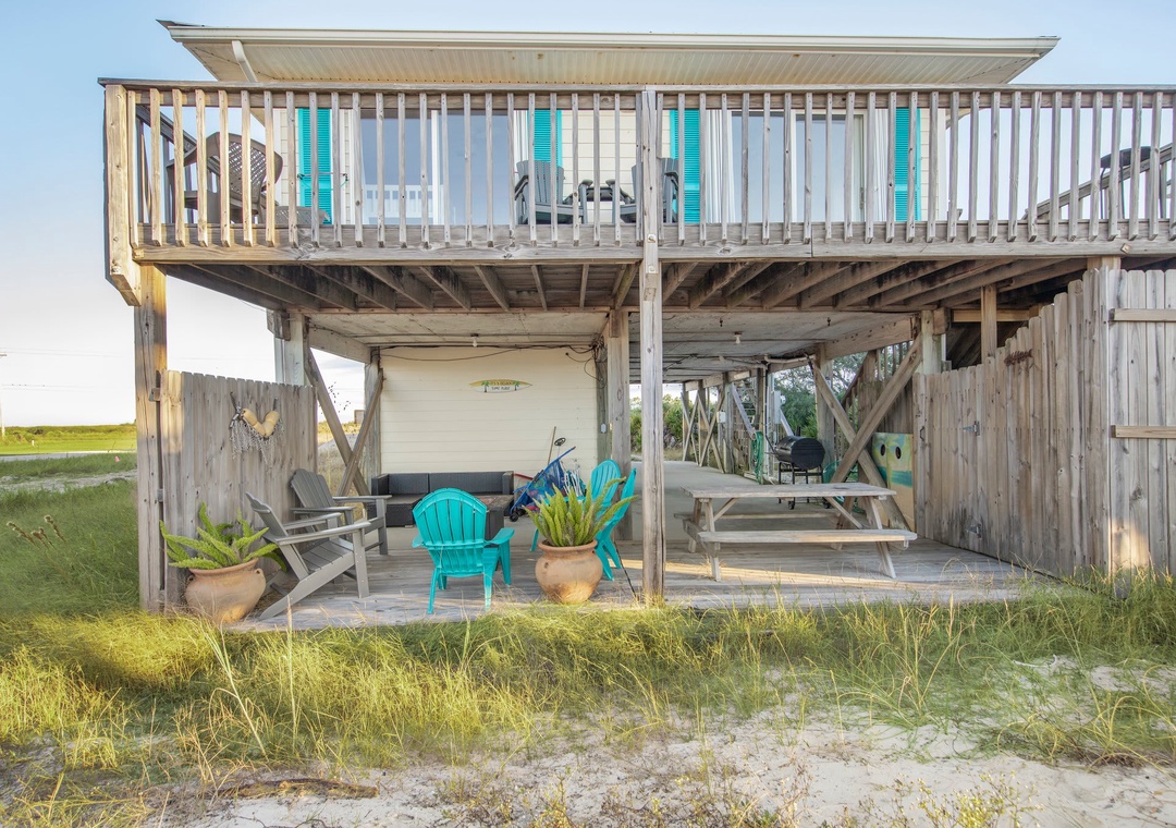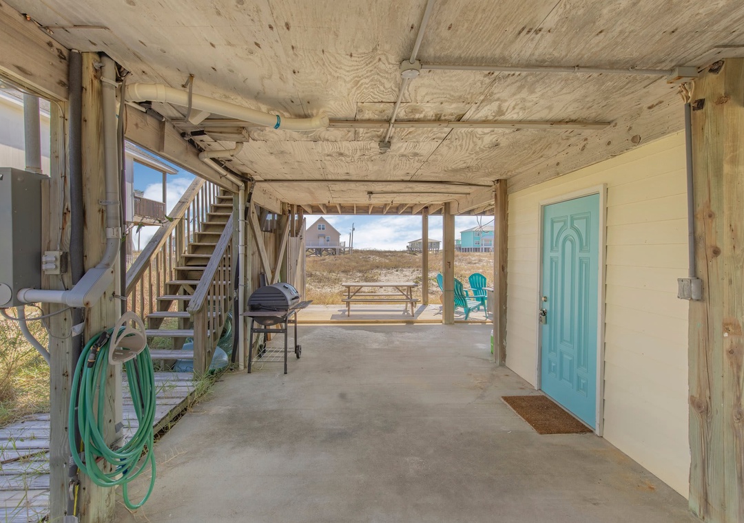 Walk up the stairs to the front of the house where you will have views of the bay from the balcony. Inside you will find a comfortable living space with flat screen TV. The dazzling well-equipped kitchen is stocked with pots/pans/utensils to whip up a local seafood dish. There is a washer and dryer off the kitchen for your convenience. The main bedroom features a king-size bed with access to the balcony on the backside of the house. The main bathroom inside features a shower/tub combo. The second bedroom features a queen-size bed. The third bedroom is perfect for the kiddos with a double-size bunkbed with twin-size trundle. Under the carport you will find the second bathroom featuring an outdoor shower and toilet, perfect for after a day on the beach.