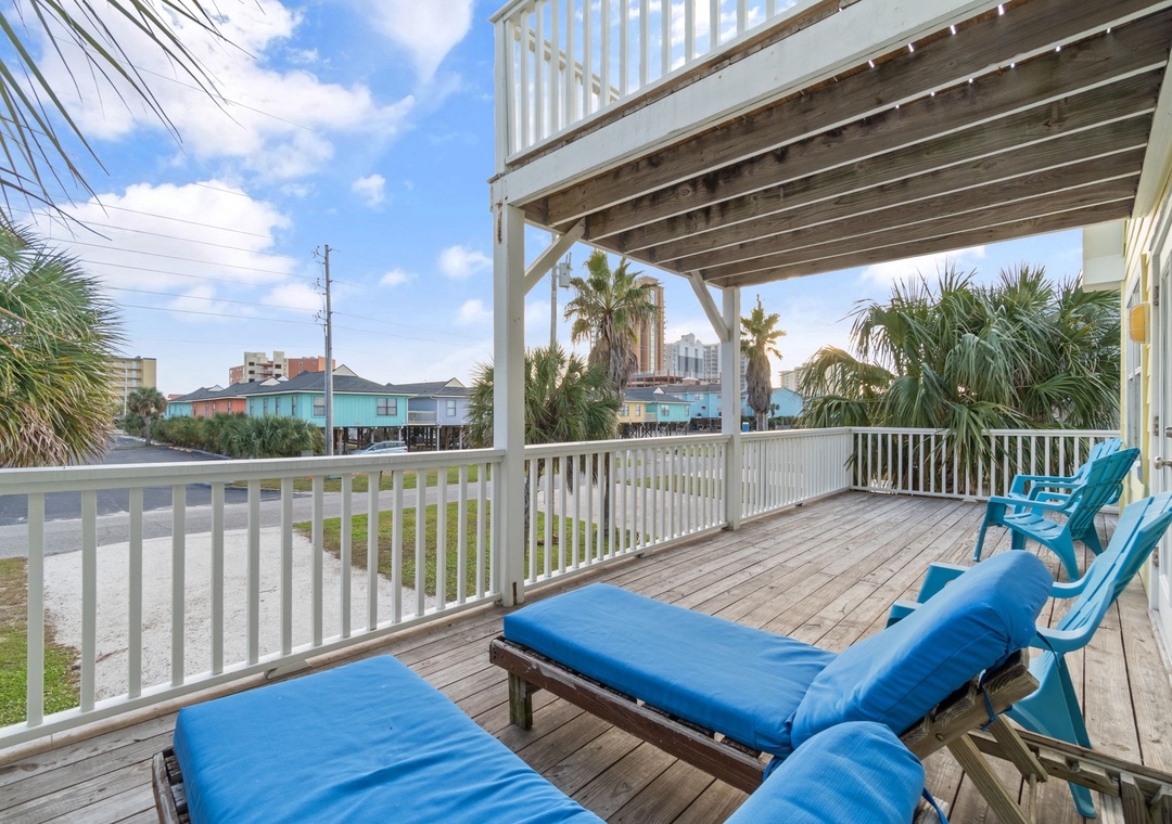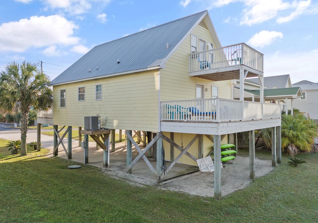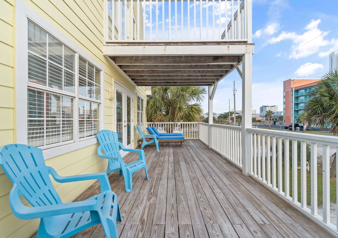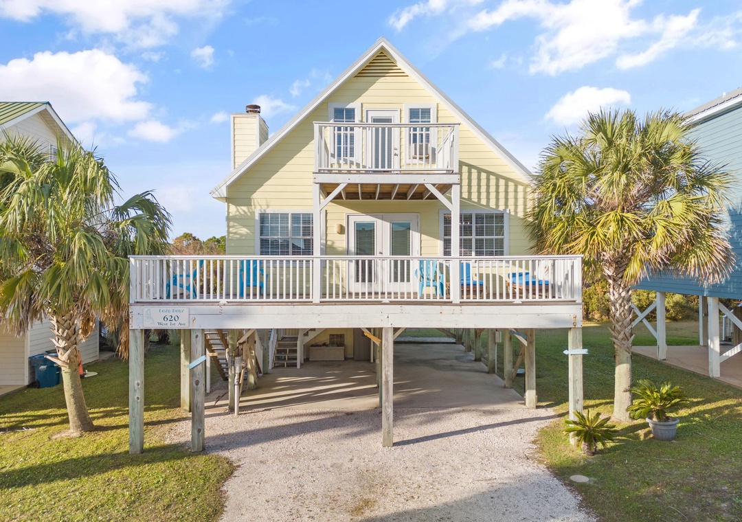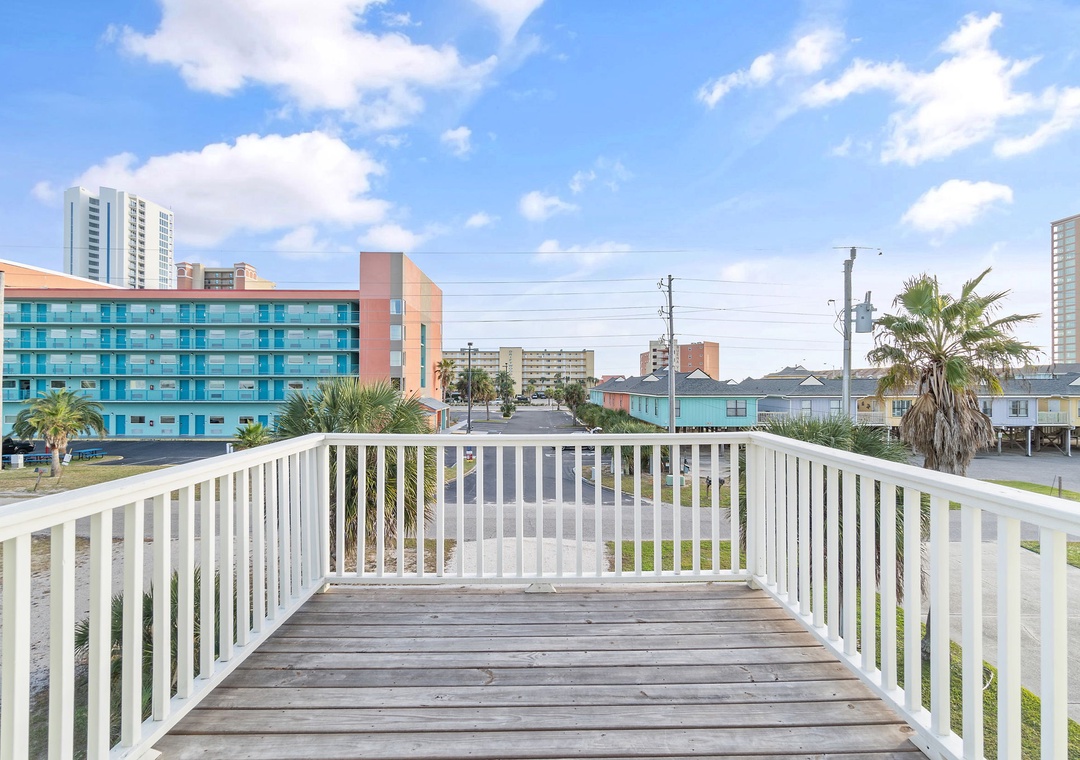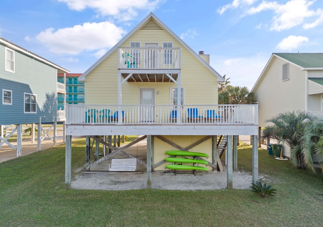 Walk up the stairs to find the front balcony and step inside to the main living area. The kitchen is well-equipped with pots/pans/utensils to whip up a homecooked meal around the dining table that comfortably seats six. Inside the living area is a flat screen TV with 2 sleeper sofas. Off the living space is a half bathroom with a washer and dryer for your convenience. The main bedroom features a king-size bed with flat screen TV. The main bathroom features a shower/tub combo. Upstairs is an additional king-size bedroom with private balcony. The top floor bathroom features a shower/tub combo. Third bedroom has a twin-size bunkbed with twin trundle and additional twin-size daybed.