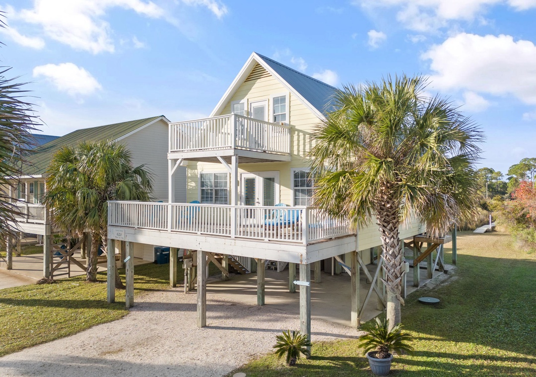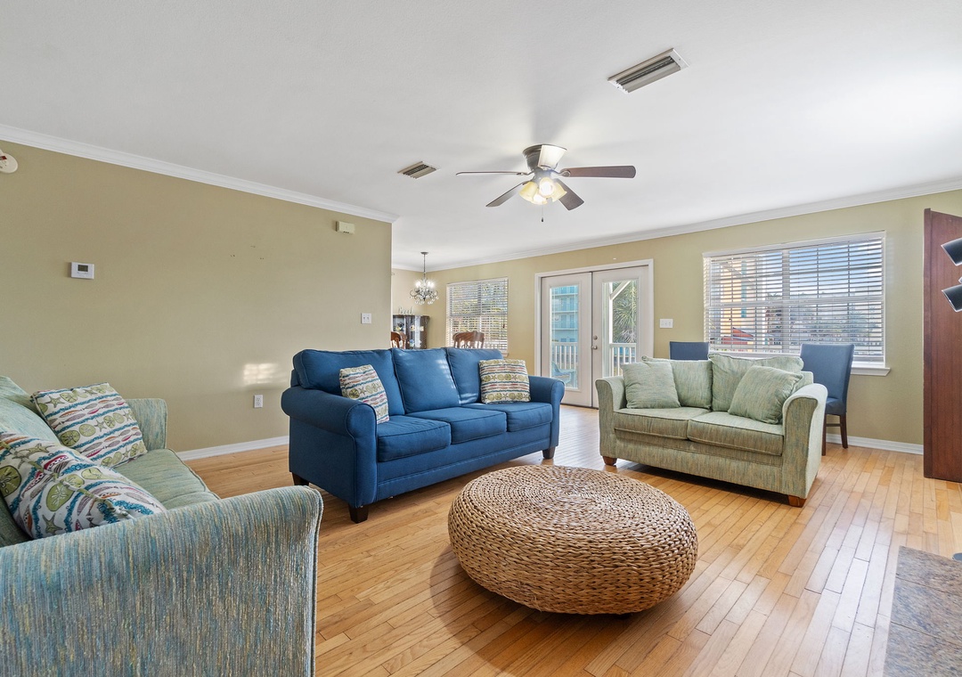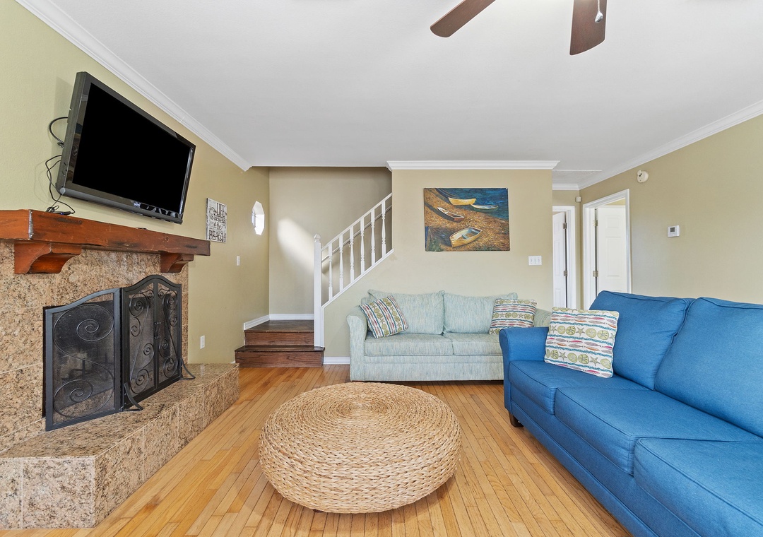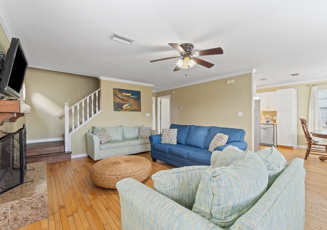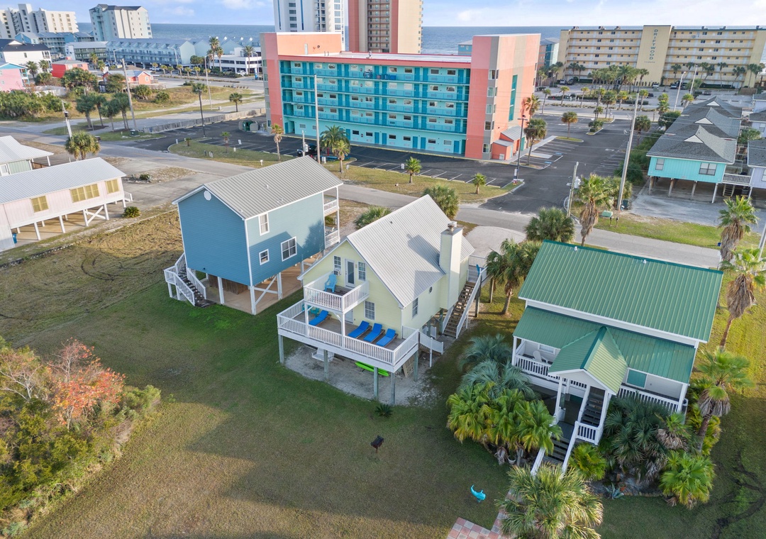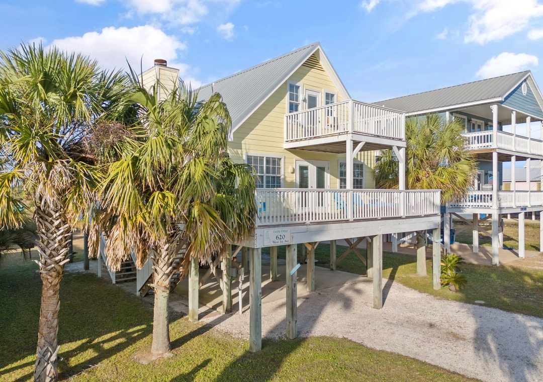 Walk up the stairs to find the front balcony and step inside to the main living area. The kitchen is well-equipped with pots/pans/utensils to whip up a homecooked meal around the dining table that comfortably seats six. Inside the living area is a flat screen TV with 2 sleeper sofas. Off the living space is a half bathroom with a washer and dryer for your convenience. The main bedroom features a king-size bed with flat screen TV. The main bathroom features a shower/tub combo. Upstairs is an additional king-size bedroom with private balcony. The top floor bathroom features a shower/tub combo. Third bedroom has a twin-size bunkbed with twin trundle and additional twin-size daybed.