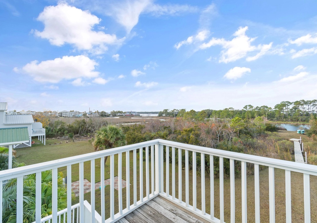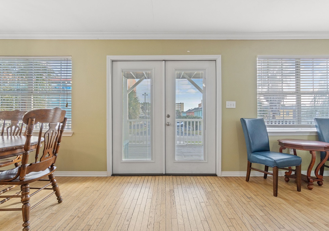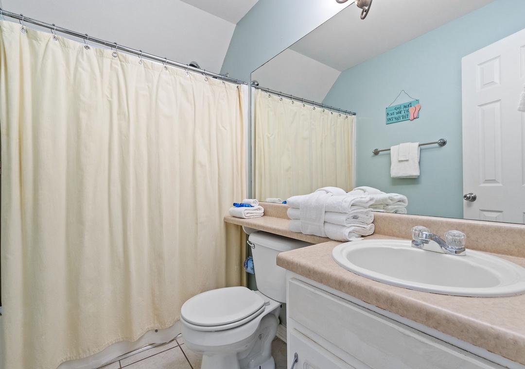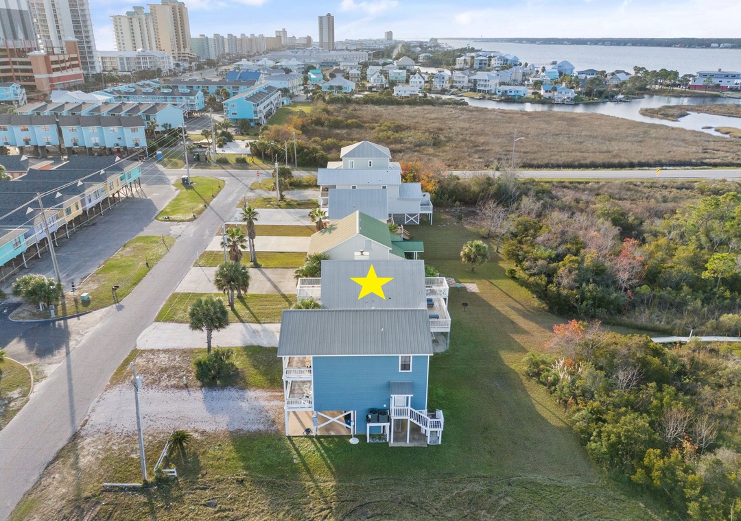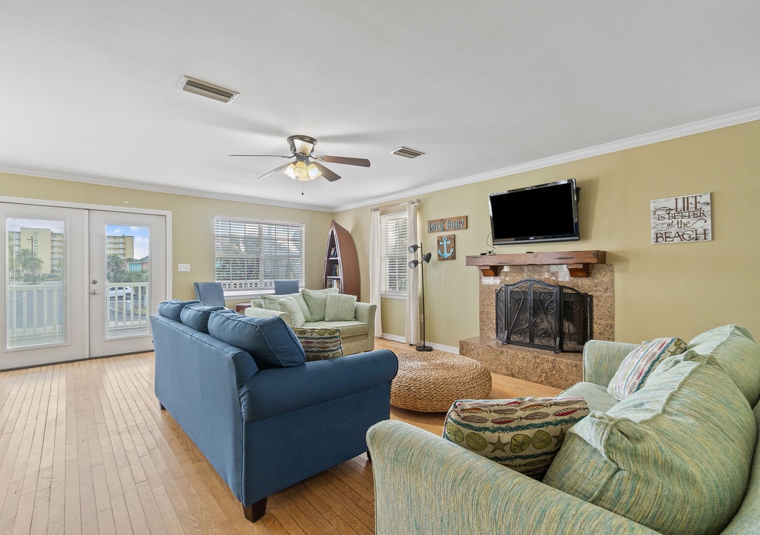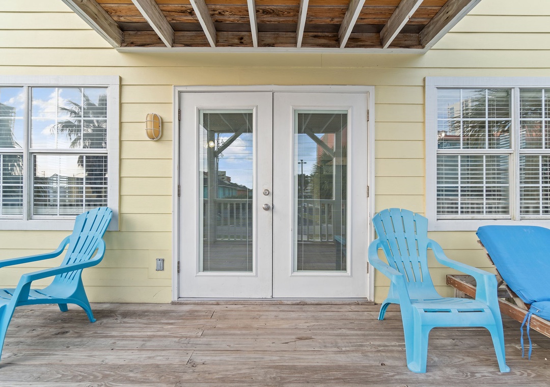 Walk up the stairs to find the front balcony and step inside to the main living area. The kitchen is well-equipped with pots/pans/utensils to whip up a homecooked meal around the dining table that comfortably seats six. Inside the living area is a flat screen TV with 2 sleeper sofas. Off the living space is a half bathroom with a washer and dryer for your convenience. The main bedroom features a king-size bed with flat screen TV. The main bathroom features a shower/tub combo. Upstairs is an additional king-size bedroom with private balcony. The top floor bathroom features a shower/tub combo. Third bedroom has a twin-size bunkbed with twin trundle and additional twin-size daybed.