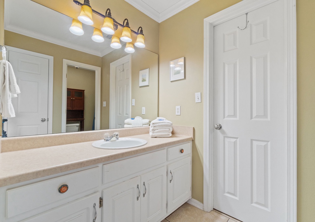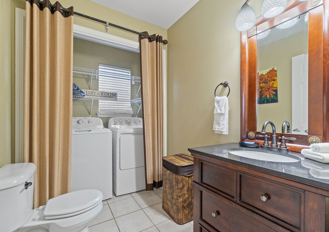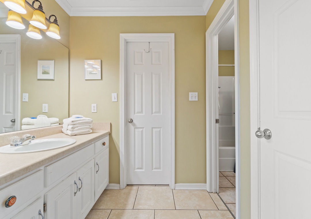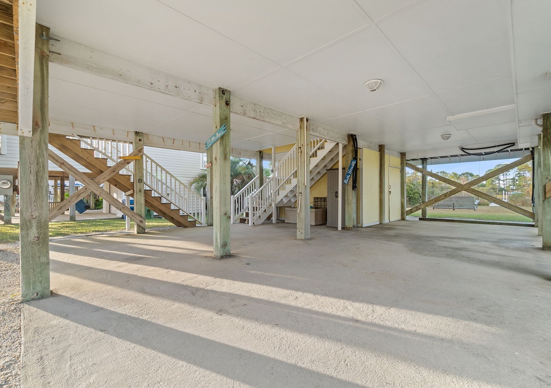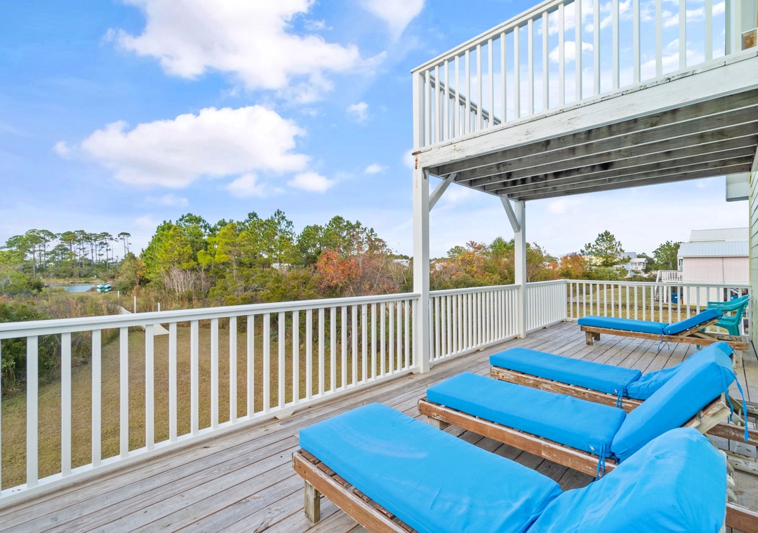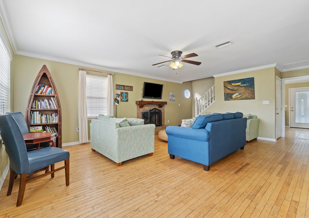 Walk up the stairs to find the front balcony and step inside to the main living area. The kitchen is well-equipped with pots/pans/utensils to whip up a homecooked meal around the dining table that comfortably seats six. Inside the living area is a flat screen TV with 2 sleeper sofas. Off the living space is a half bathroom with a washer and dryer for your convenience. The main bedroom features a king-size bed with flat screen TV. The main bathroom features a shower/tub combo. Upstairs is an additional king-size bedroom with private balcony. The top floor bathroom features a shower/tub combo. Third bedroom has a twin-size bunkbed with twin trundle and additional twin-size daybed.