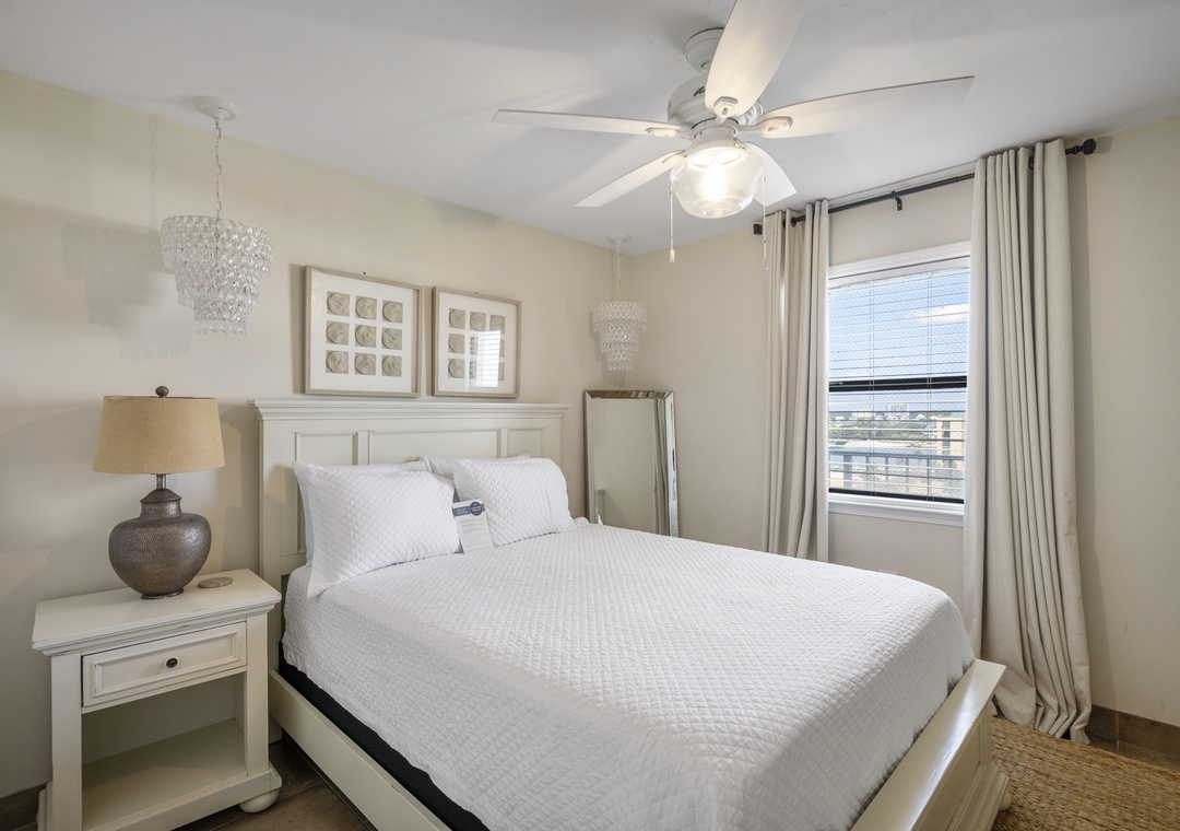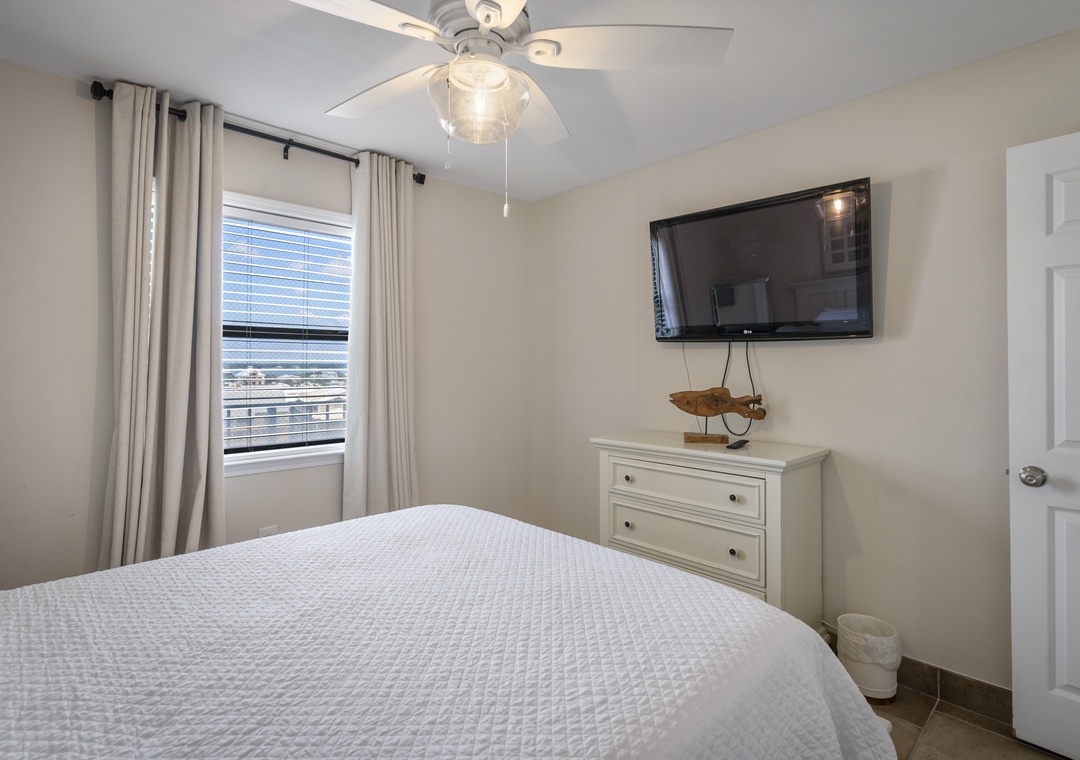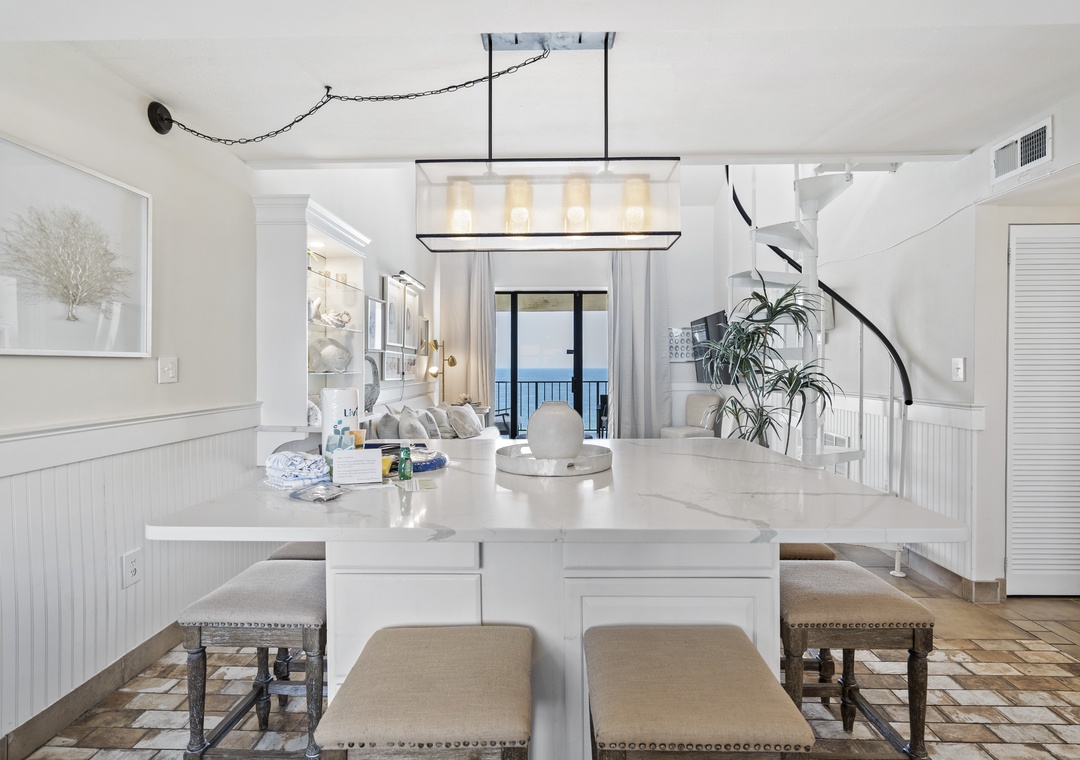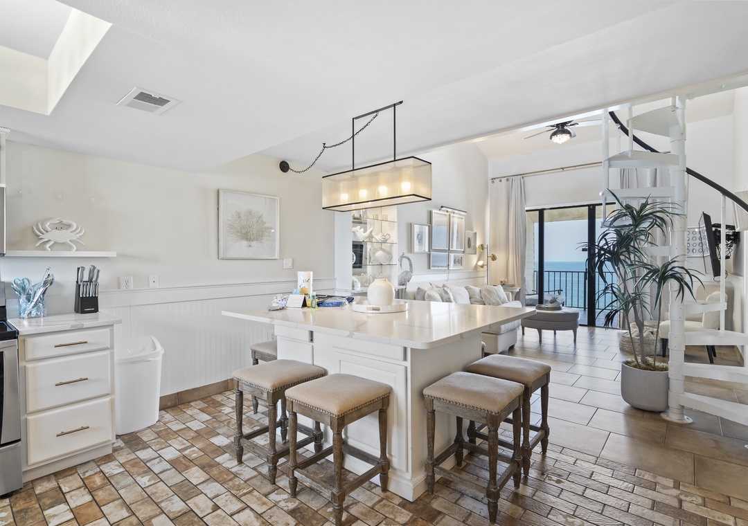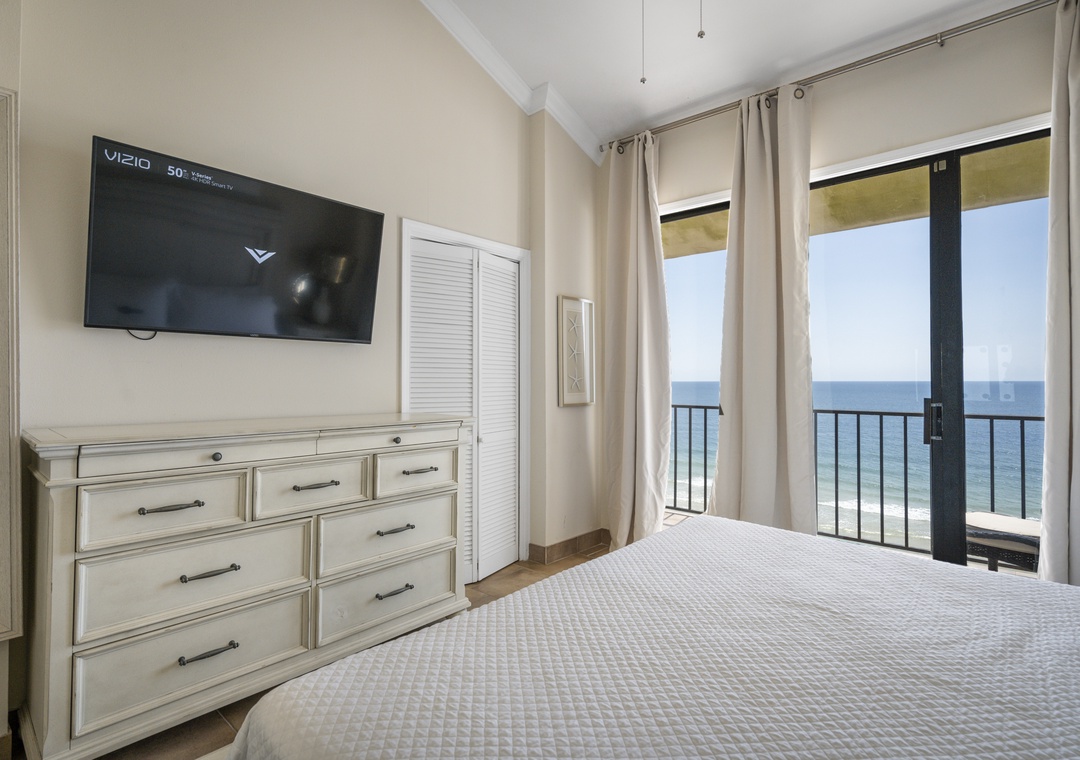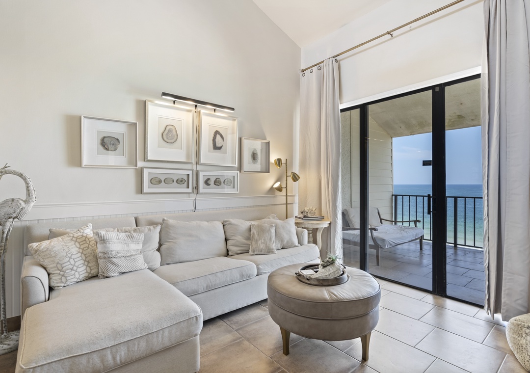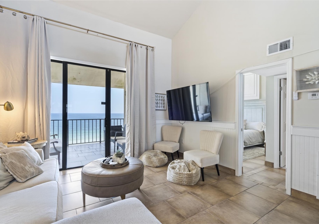 As you enter, you'll immediately notice the open-concept design with soaring ceilings and tile flooring throughout. The spacious living area opens directly to a private balcony, where you'll take in panoramic Gulf views and the soothing sounds of the ocean. The living room includes a full-size sleeper sofa and flat-screen TV — perfect for relaxing after a sun-soaked day.