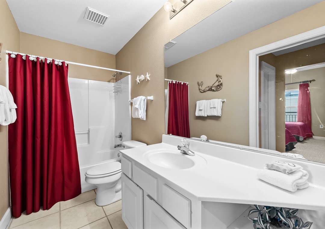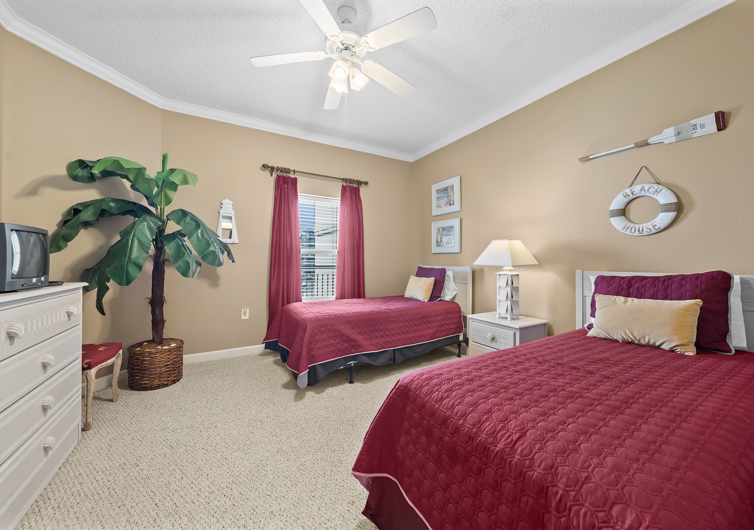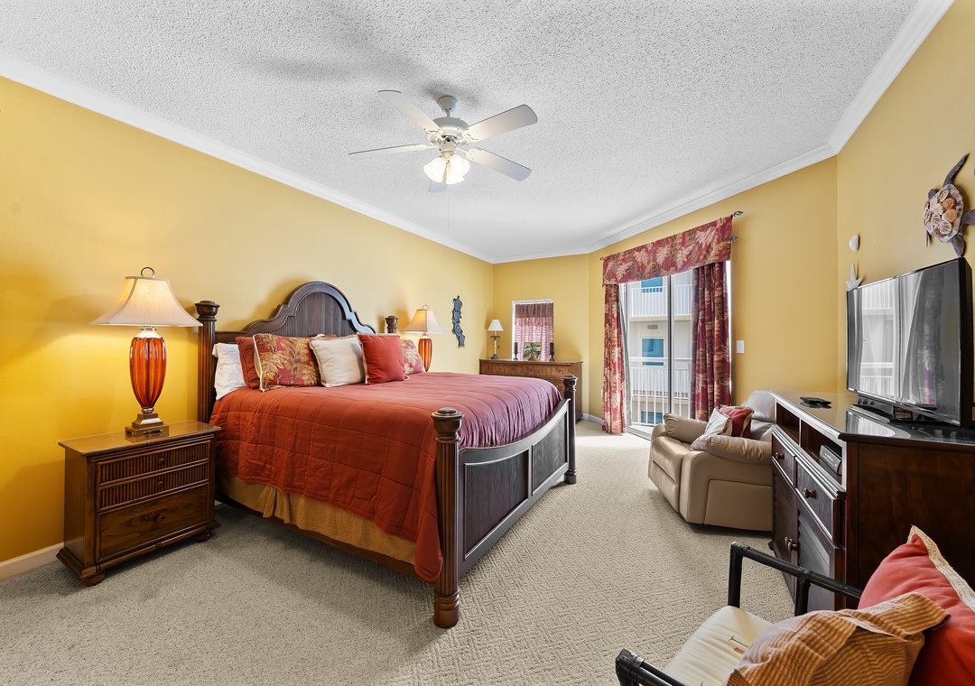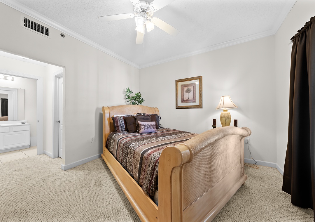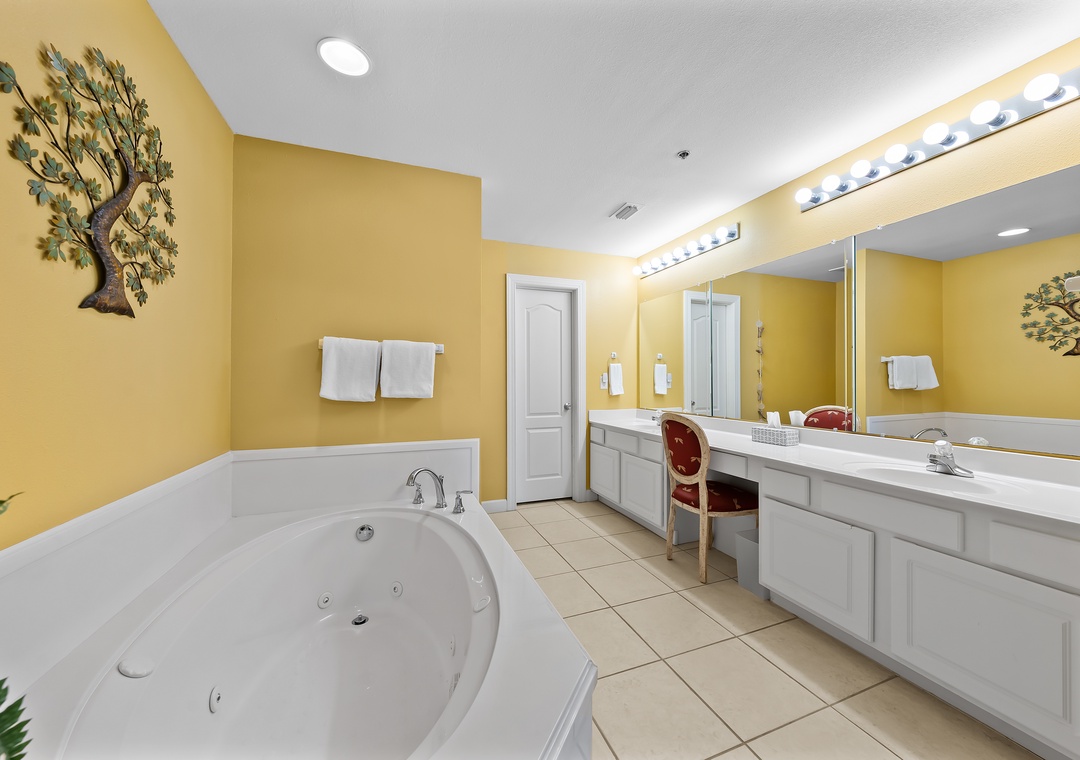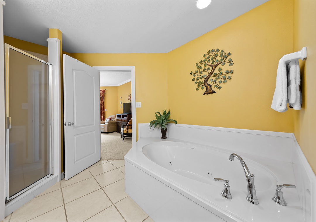 Retreat to the peaceful main bedroom, furnished with a king bed and access to the private balcony for moments of tranquility. The ensuite main bathroom boasts a spacious double vanity, a walk-in shower, and a luxurious soaking tub. The second bedroom features two twin beds, accompanied by an ensuite bathroom with a shower/tub combo. Meanwhile, the third bedroom offers a queen bed, with the third bathroom also featuring a convenient shower/tub combo.