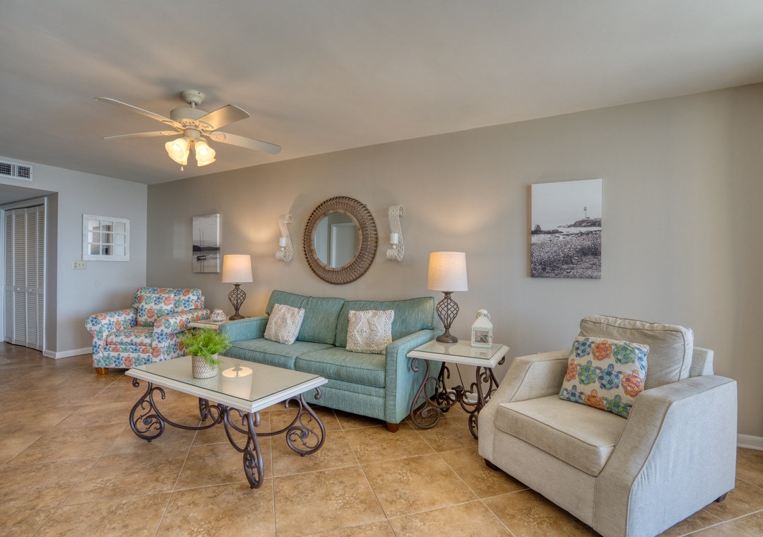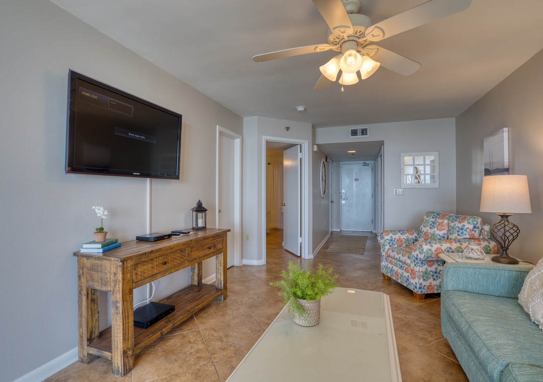 The Primary bedroom features a plush King bed and a flat-screen TV for winding down after a day of beach fun. The living room offers a flat-screen TV, comfortable seating, and a sofa sleeper, bringing total sleeping accommodations to 4 guests.