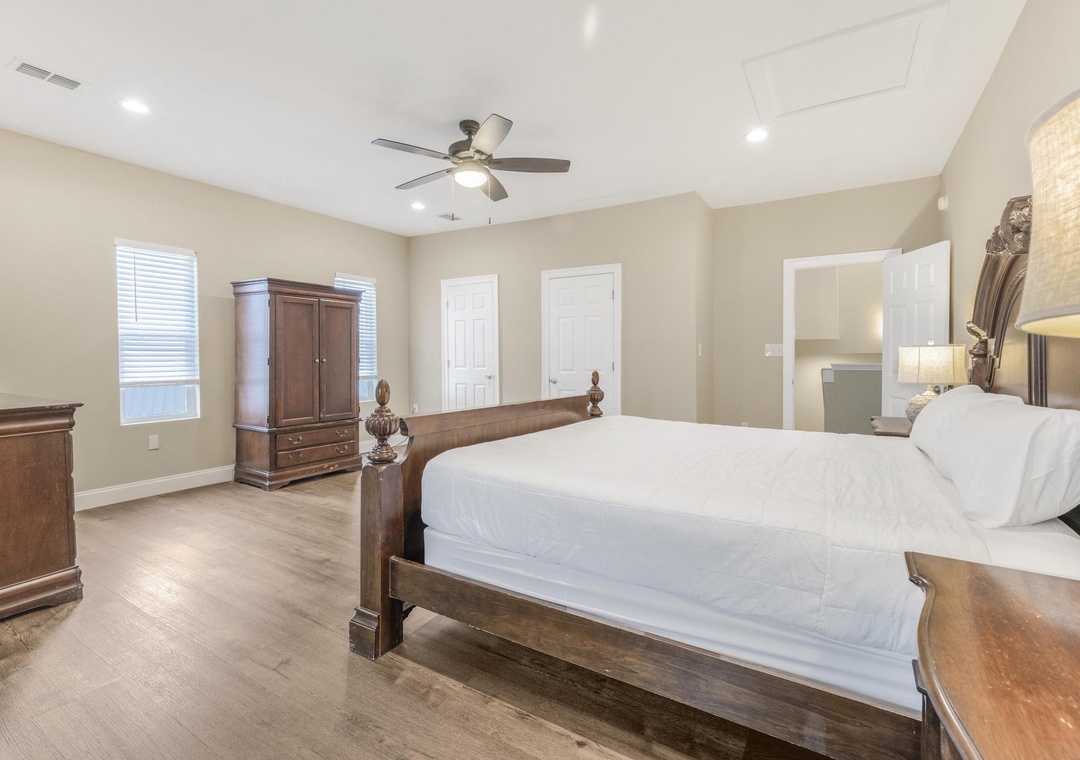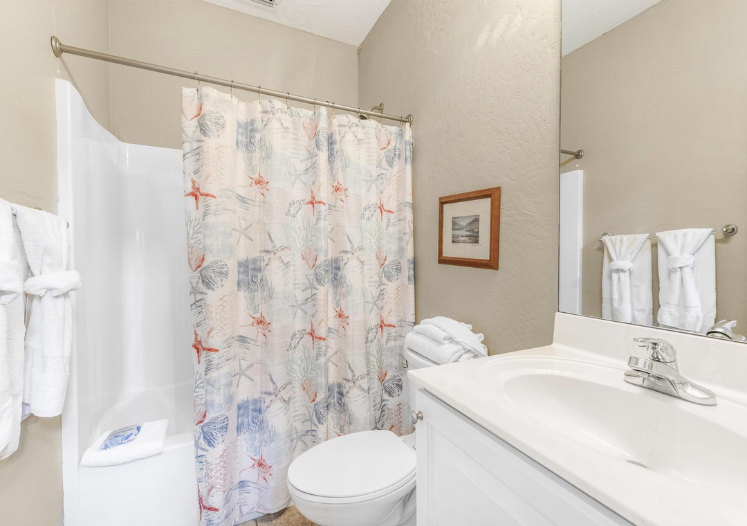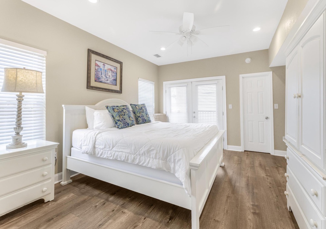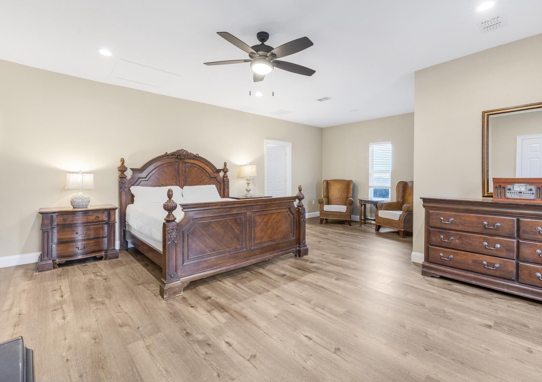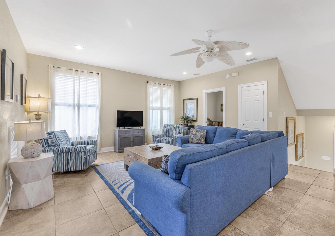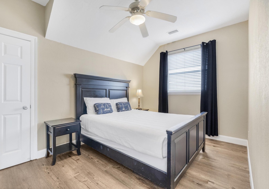 The two primary suites have king beds with ensuite bathrooms featuring jetted tubs and walk-in showers. The additional bedrooms have a variety of sleeping options. Bedroom three has a twin daybed, bedroom four has a queen bed, bedroom five has three twin-over-twin bunk beds and bedroom six has a queen bed. There are also two guest bathrooms; one with a walk-in shower and the other has a tub/shower combo.