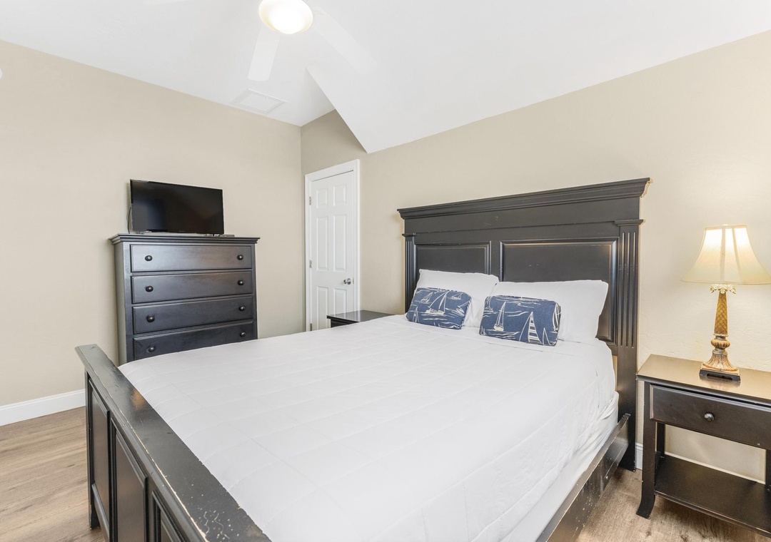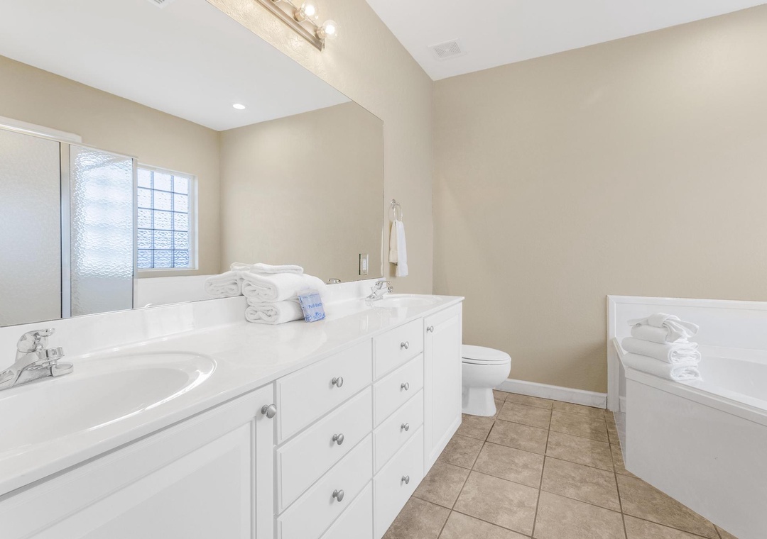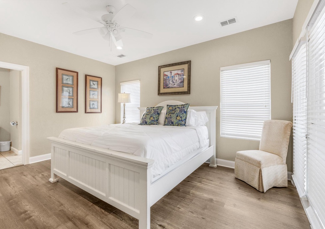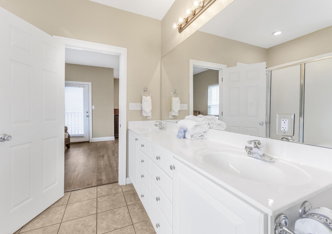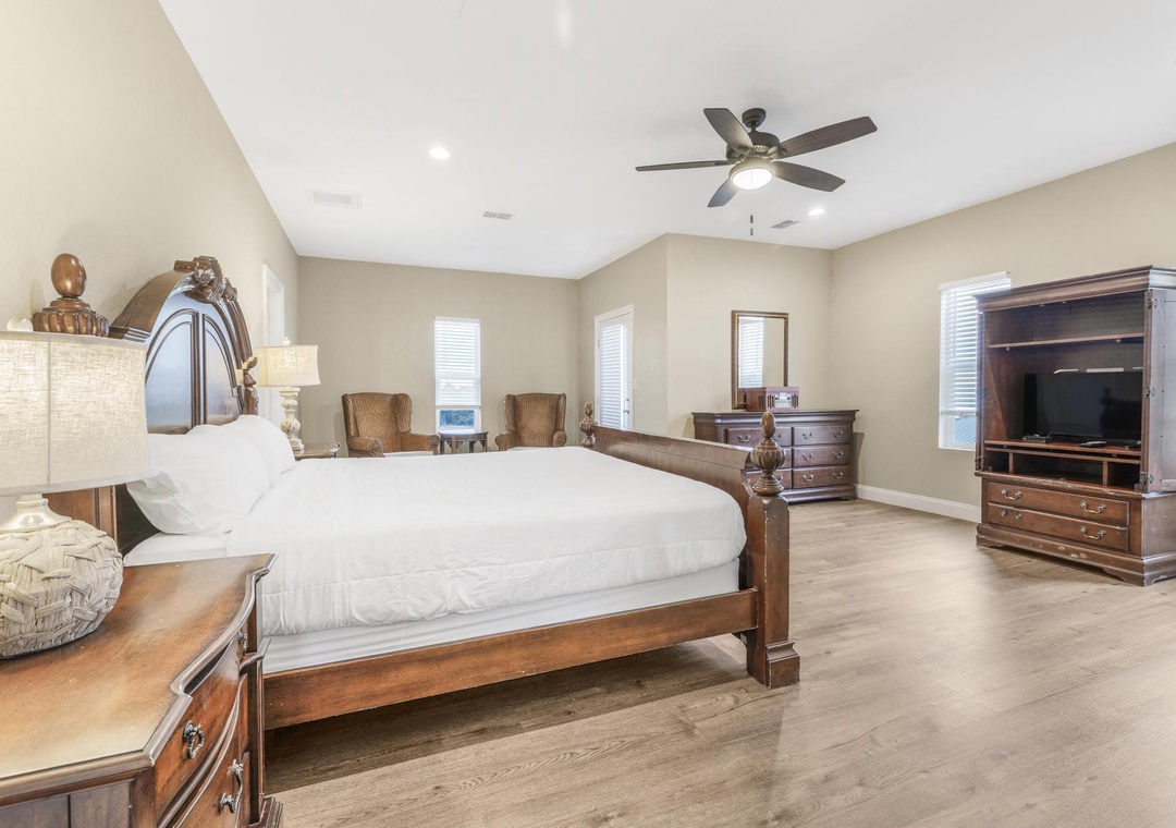 The two primary suites have king beds with ensuite bathrooms featuring jetted tubs and walk-in showers. The additional bedrooms have a variety of sleeping options. Bedroom three has a twin daybed, bedroom four has a queen bed, bedroom five has three twin-over-twin bunk beds and bedroom six has a queen bed. There are also two guest bathrooms; one with a walk-in shower and the other has a tub/shower combo.