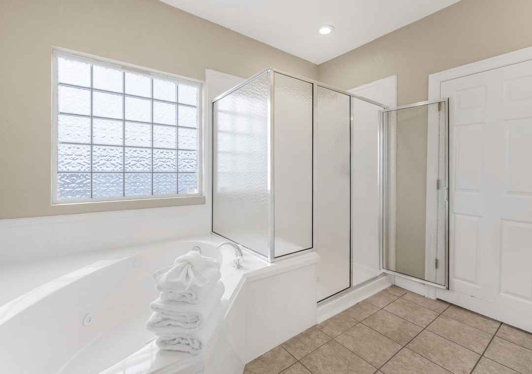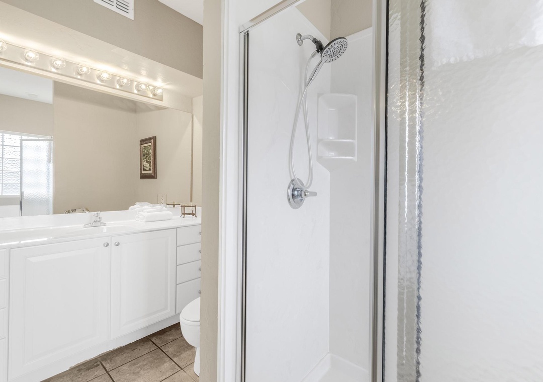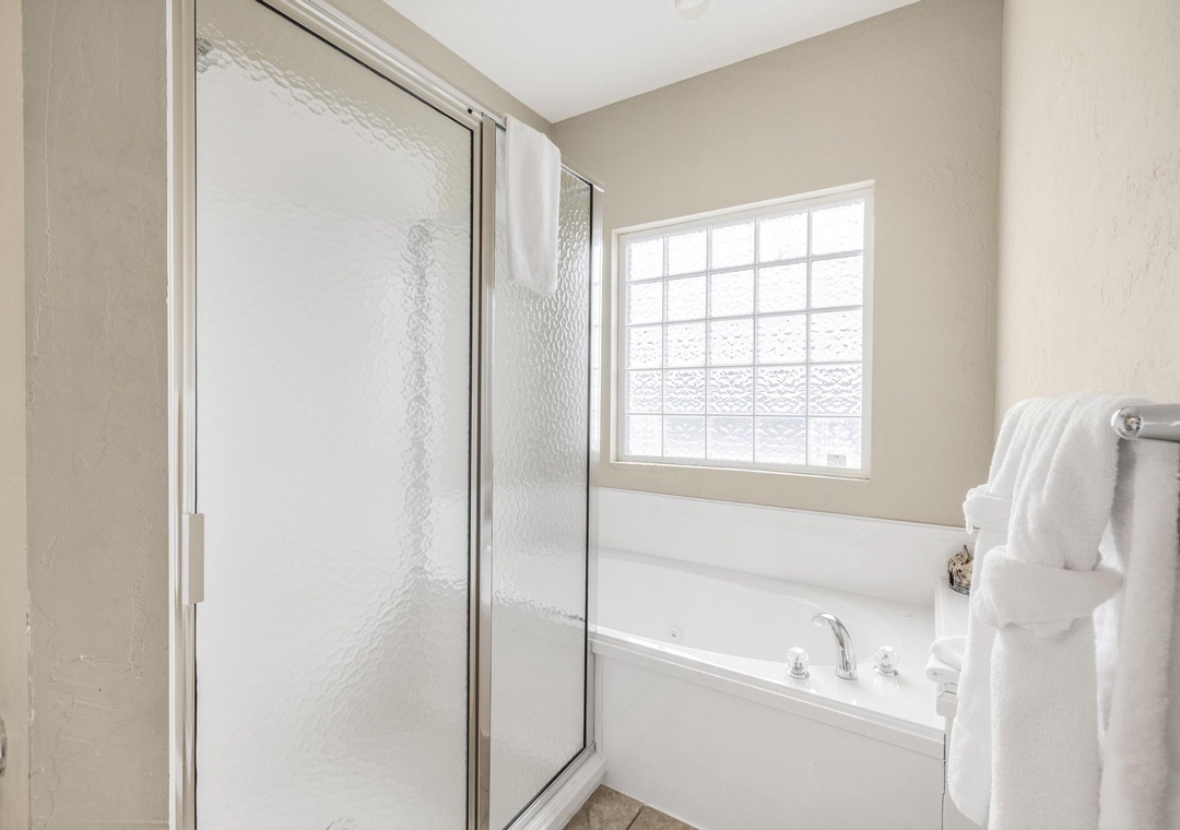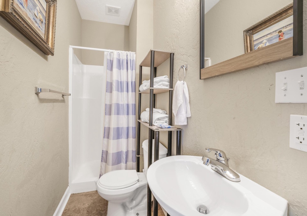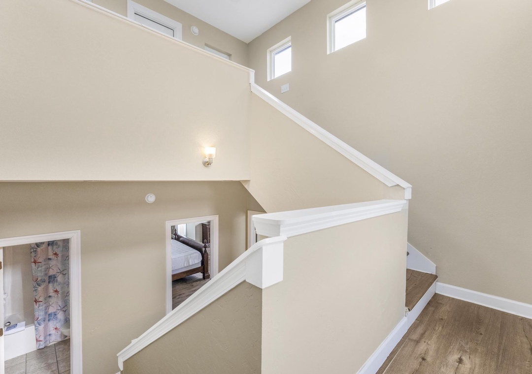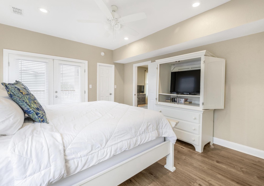 The two primary suites have king beds with ensuite bathrooms featuring jetted tubs and walk-in showers. The additional bedrooms have a variety of sleeping options. Bedroom three has a twin daybed, bedroom four has a queen bed, bedroom five has three twin-over-twin bunk beds and bedroom six has a queen bed. There are also two guest bathrooms; one with a walk-in shower and the other has a tub/shower combo.