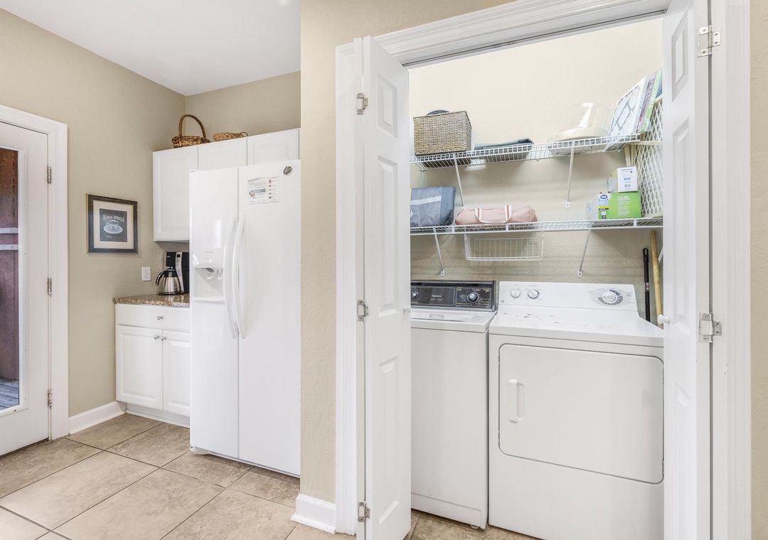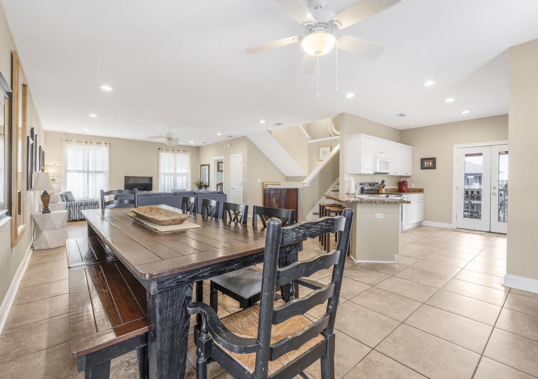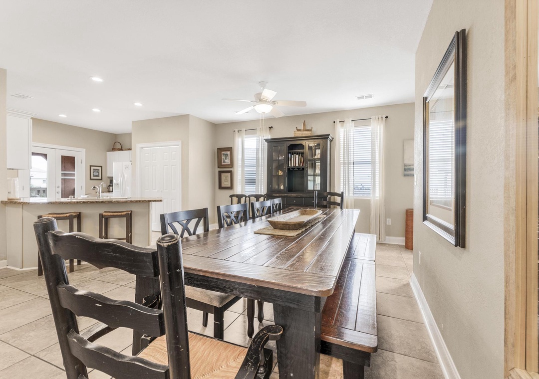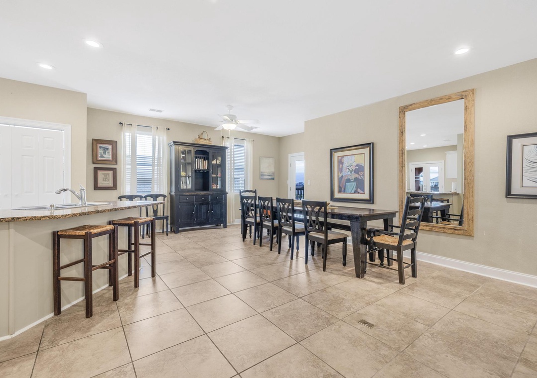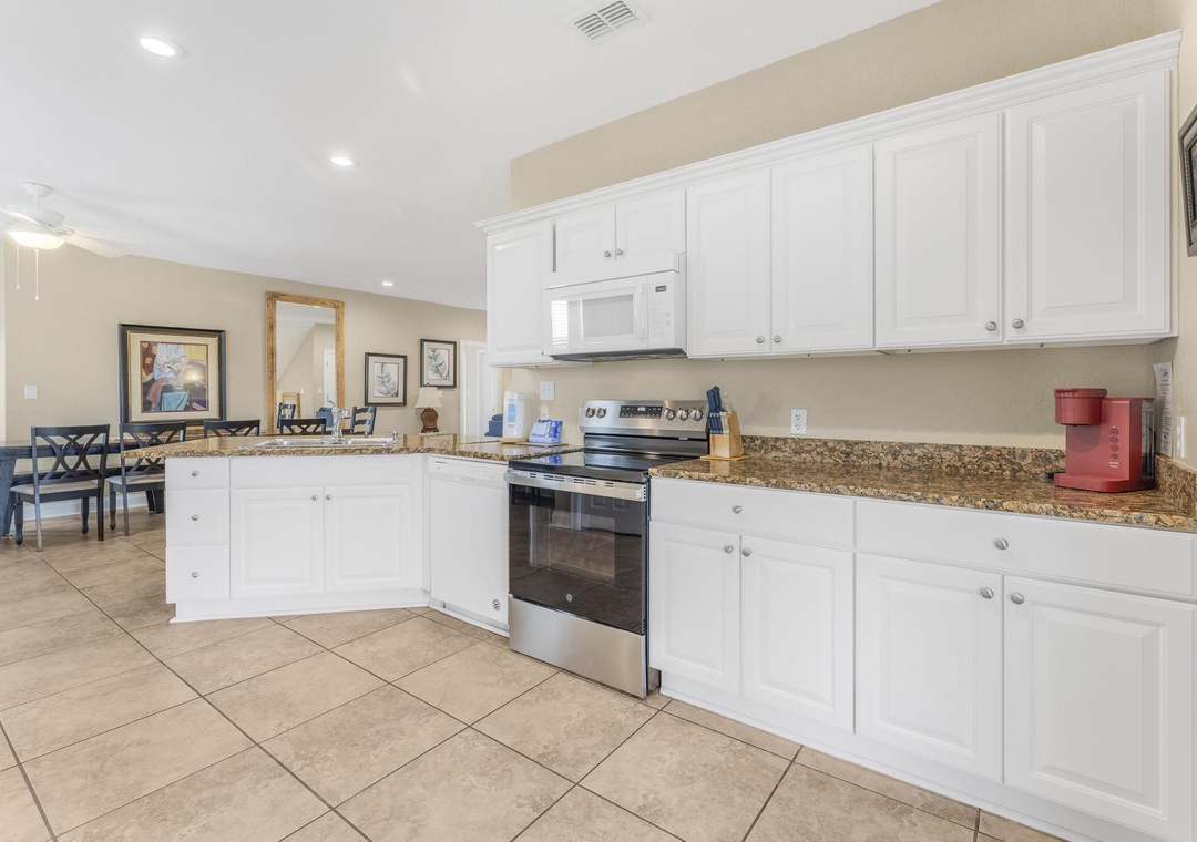 This six-bedroom, four-bathroom home has an open layout, so it feels spacious and inviting. The dining room table offers seating for six with additional seats at the breakfast bar. Also, on the main floor you will find a washer and dryer for your convenience.