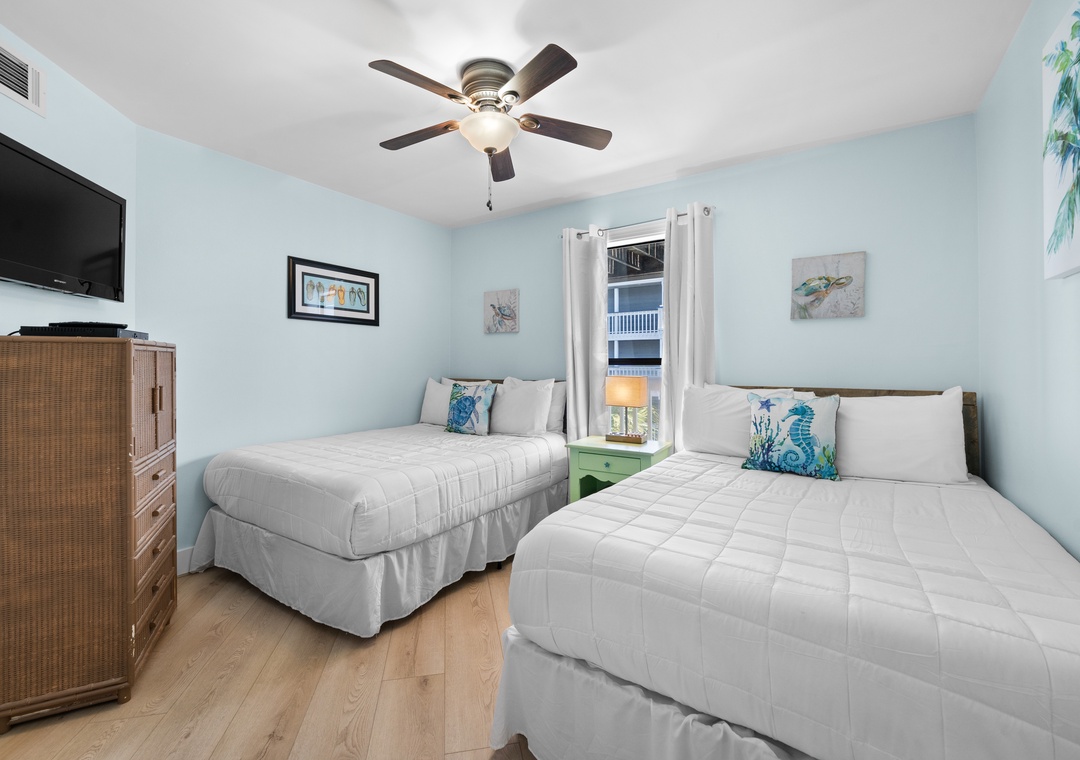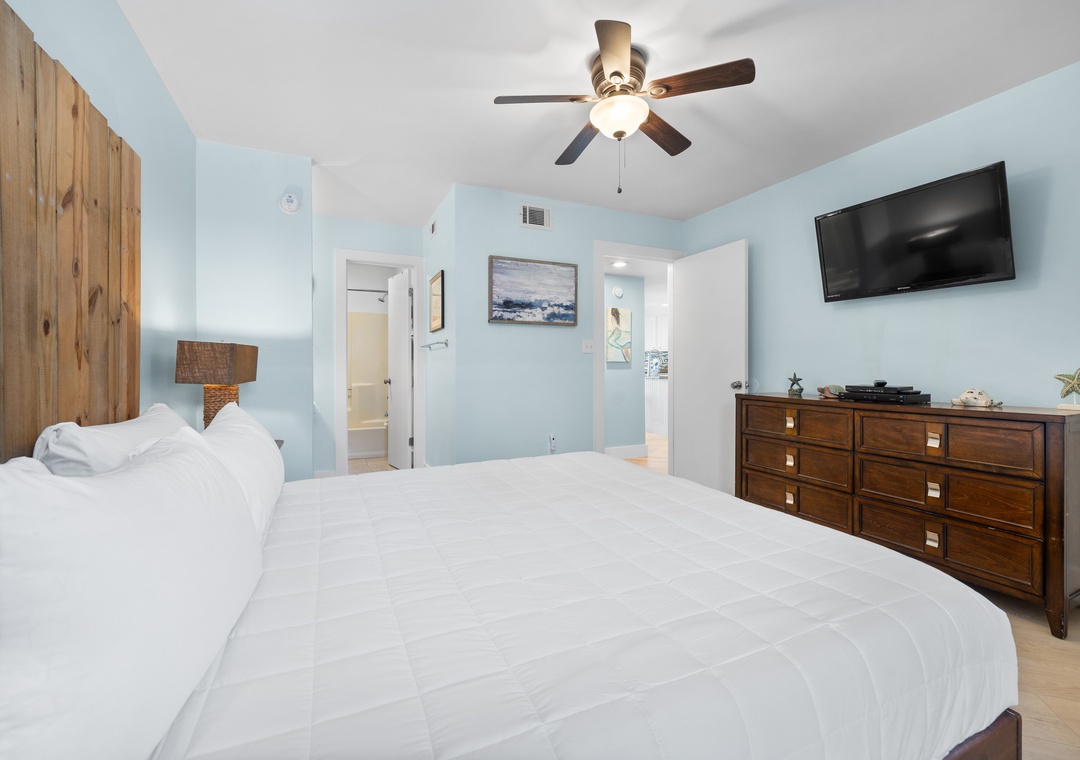 The primary bedroom features a plush King-sized bed, private balcony access, and an en suite bathroom with a shower/tub combo. The second bedroom offers two Full-sized beds, providing ample space for family or friends. The living room includes a flat-screen TV and a sofa sleeper for additional guests.