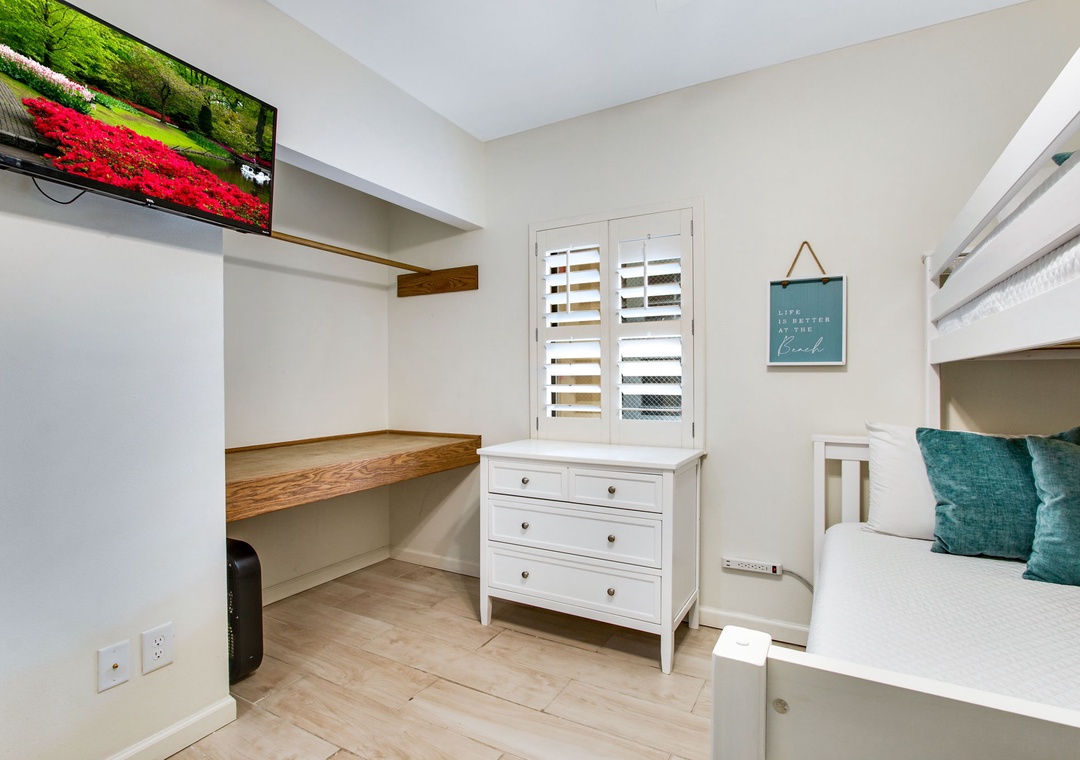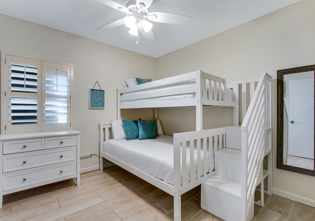 The main bedroom features a king bed with a flat screen TV and access to the patio. The ensuite main bathroom features a large vanity with a shower/tub combo. The second bedroom features a queen bed with a flat screen TV, and the second bathroom has a shower/tub combo. The third bedroom features a bunk bed with a twin bed over a double-size bed, accompanied by a flat-screen TV.