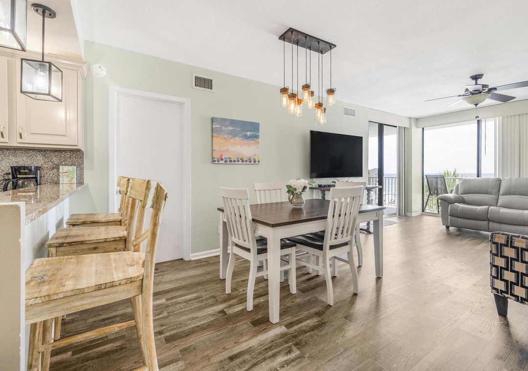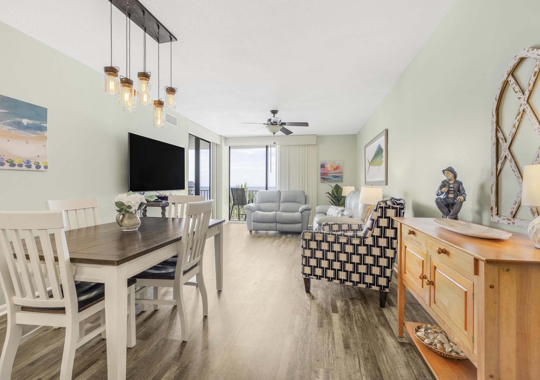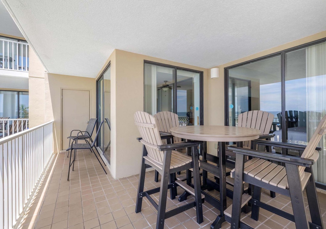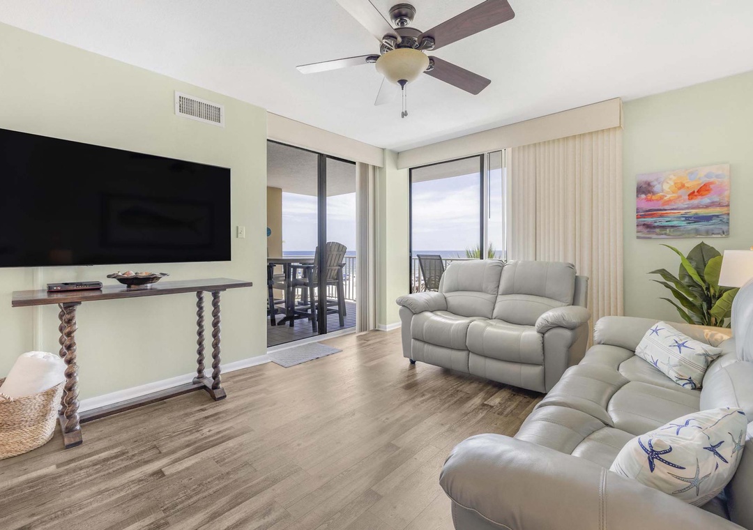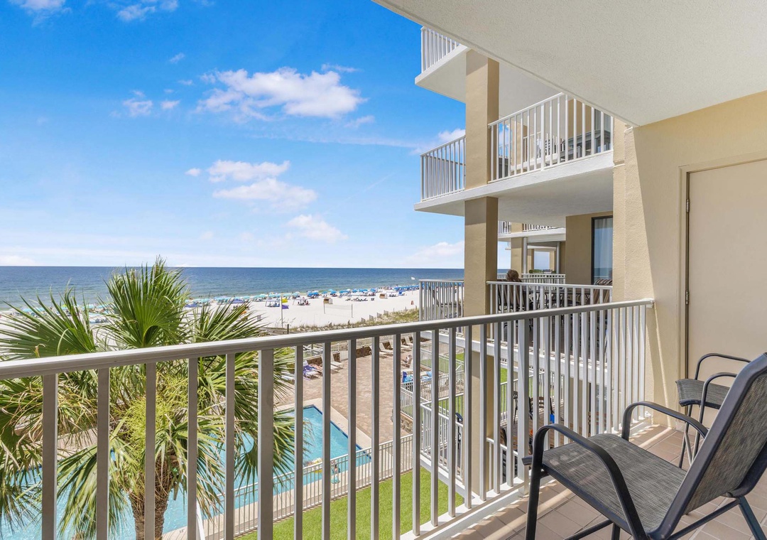 Welcome to Romar Place 302, a stunning 3-bedroom, 2-bath beachfront condo that delivers comfort, convenience, and unbeatable Gulf views from a private, spacious balcony. This bright and inviting retreat features a fully stocked kitchen with stainless steel appliances, a cozy living area with a large flat-screen TV, and a convenient in-unit washer and dryer. The primary suite includes a king bed, flat-screen TV, balcony access, and a private ensuite with walk-in shower. Two guest bedrooms each offer queen beds and flat-screen TVs, with one having direct access to the shared full bathroom. Guests can enjoy both indoor and outdoor pools, a hot tub, fitness center, and immediate beach access, making this the perfect destination for your next coastal escape.