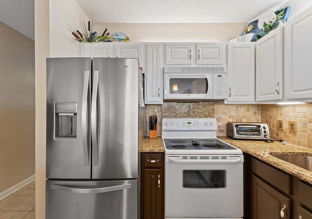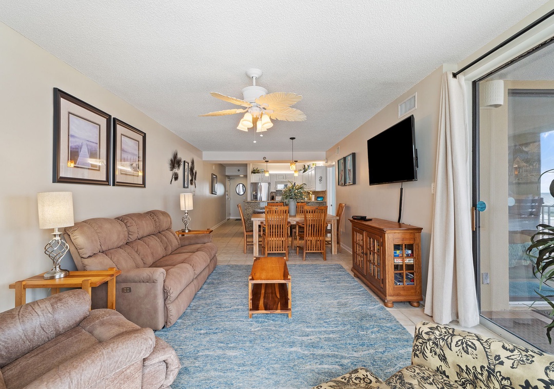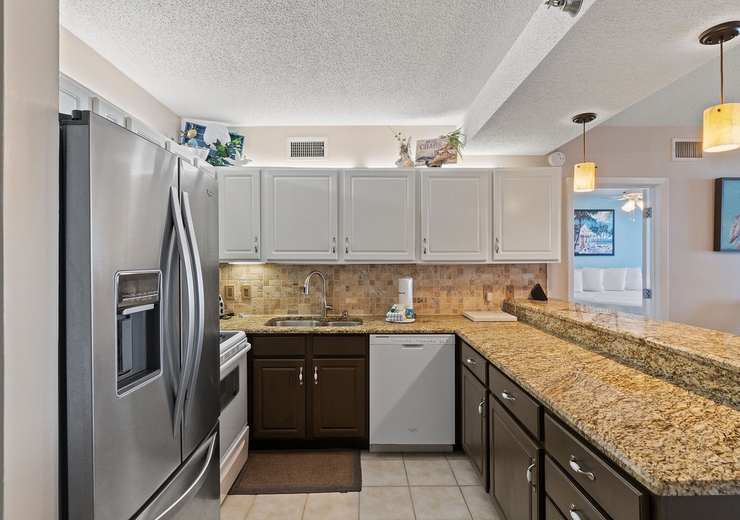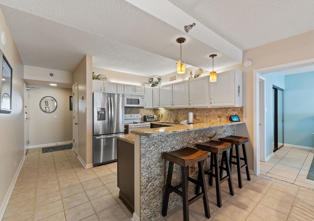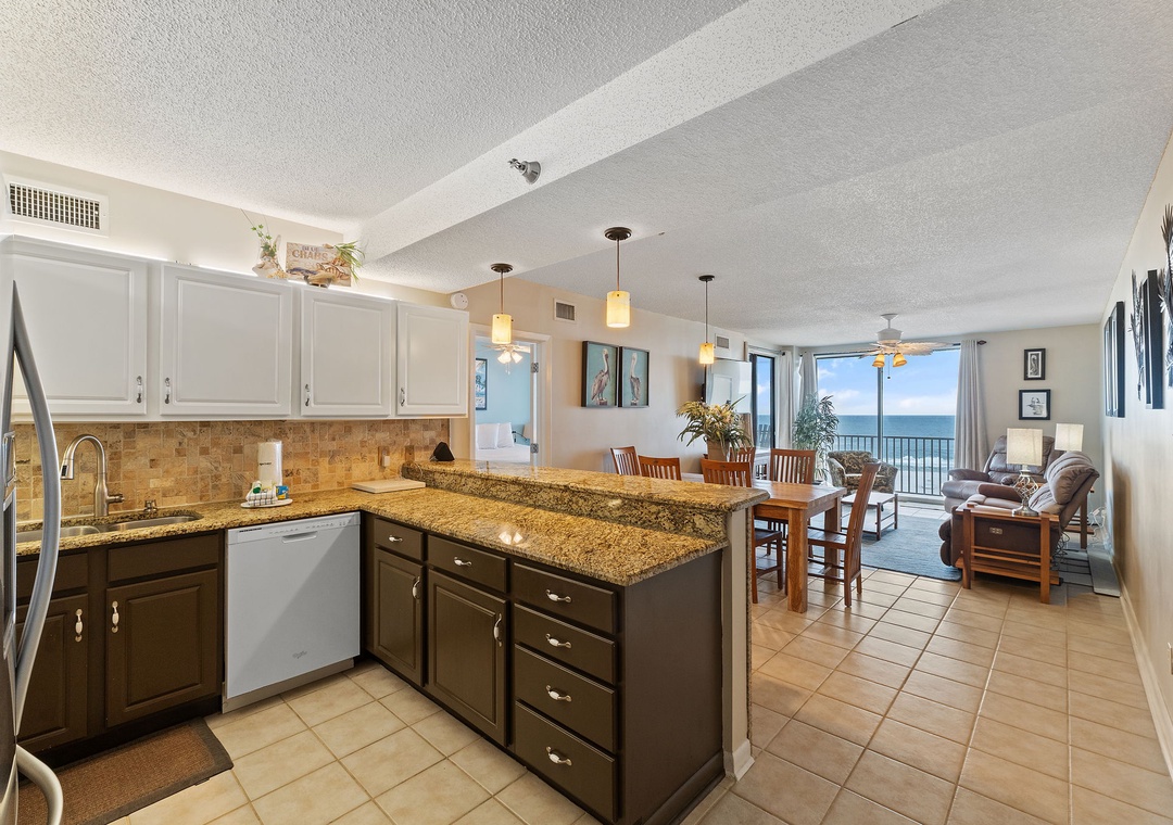 Step inside this open-concept living space in a three-bedroom condo with breathtaking views of the white sugar sands! The well-equipped kitchen features granite countertops and is stocked with pots, pans, and utensils. Gather around the six-person dining table with additional seating for three at the kitchen bar while enjoying a homecooked meal. The comfortable living space has a flat-screen TV for relaxation after a day on the beach, or step outside onto your private balcony. This unit is equipped with a washer and dryer.