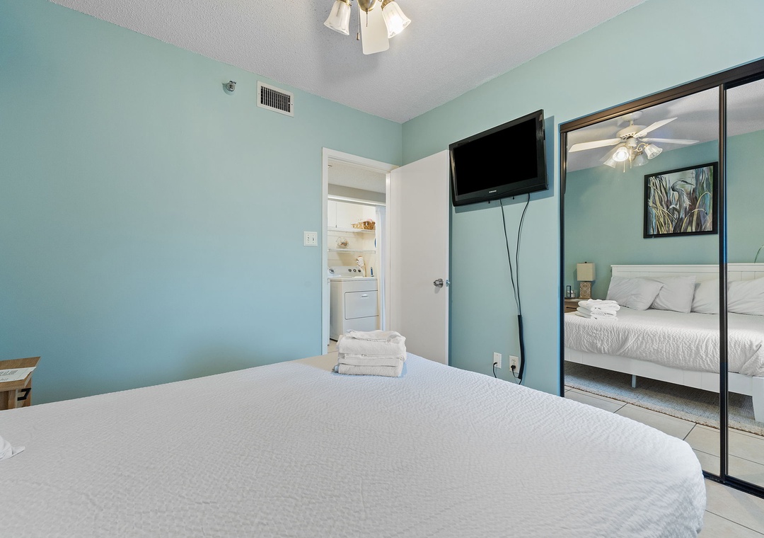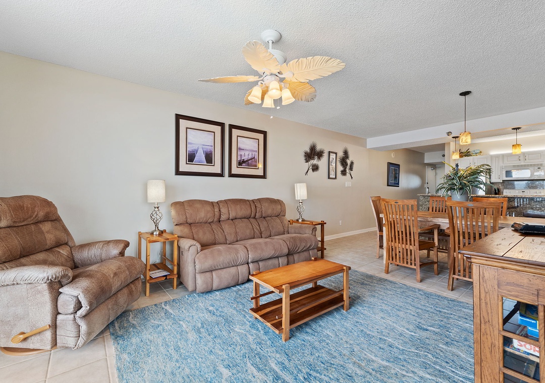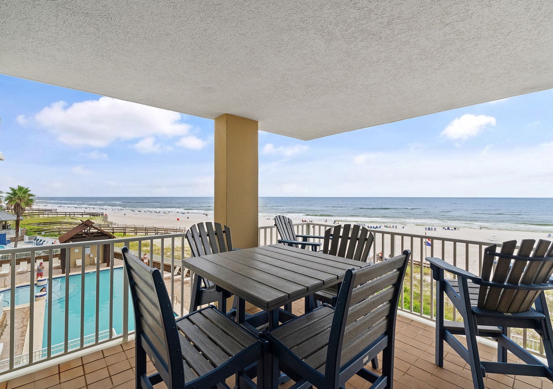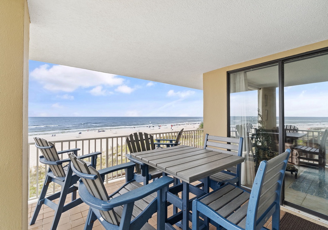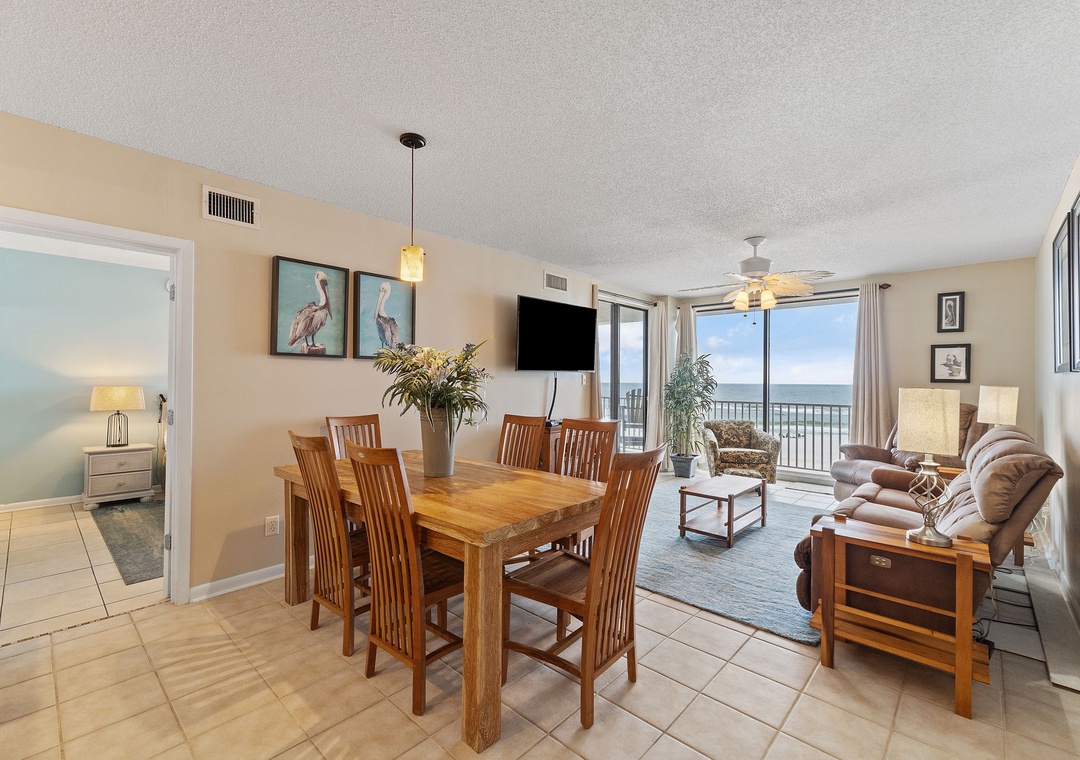 Step inside this open-concept living space in a three-bedroom condo with breathtaking views of the white sugar sands! The well-equipped kitchen features granite countertops and is stocked with pots, pans, and utensils. Gather around the six-person dining table with additional seating for three at the kitchen bar while enjoying a homecooked meal. The comfortable living space has a flat-screen TV for relaxation after a day on the beach, or step outside onto your private balcony. This unit is equipped with a washer and dryer.