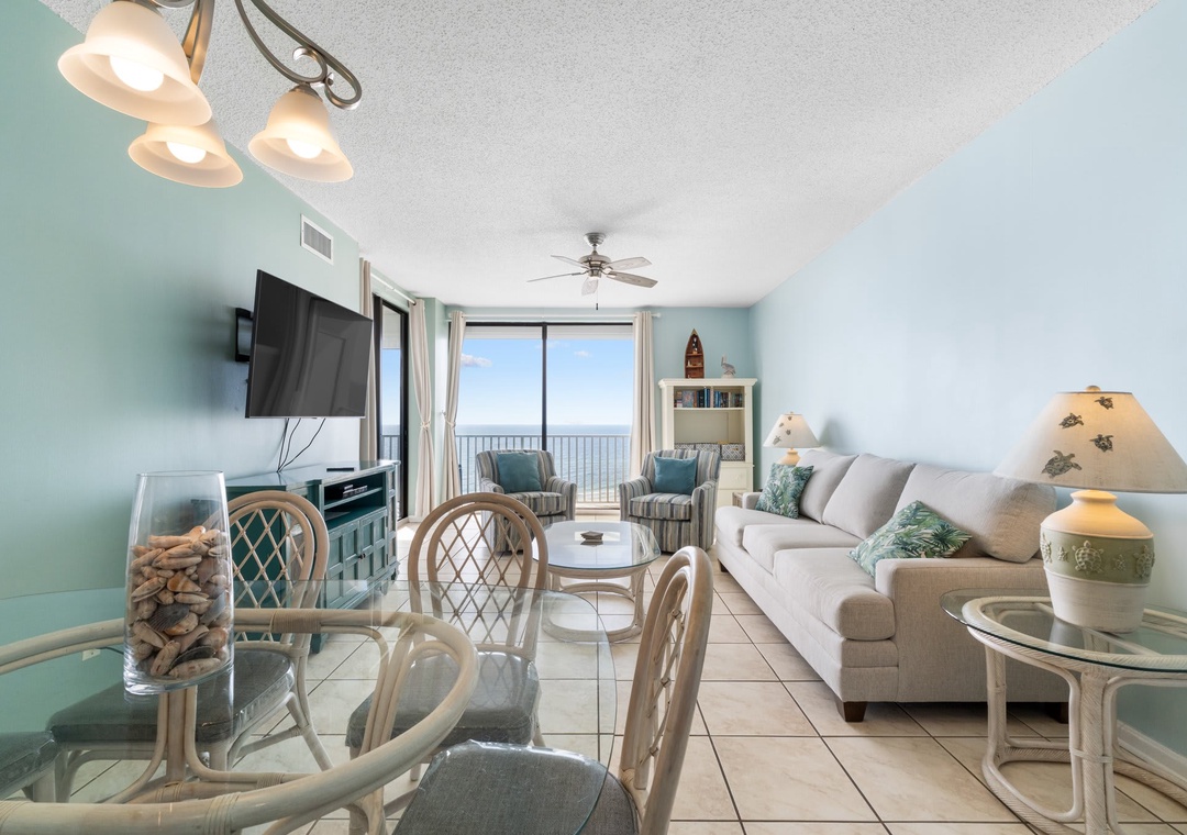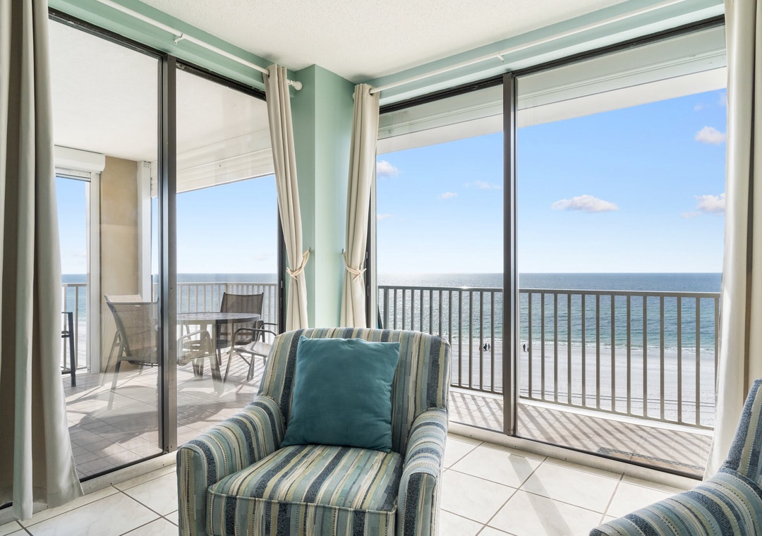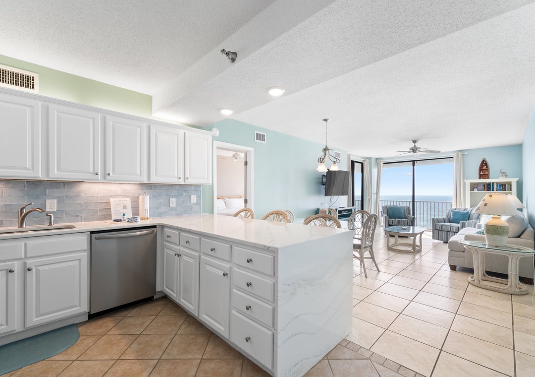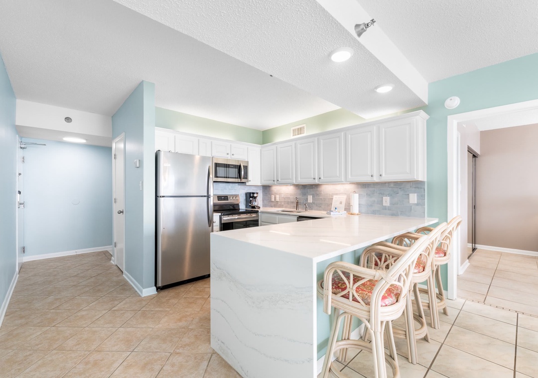 Inside this open concept space you will find light flowing in from the private balcony with incredible views of the Gulf of Mexico. The well-equipped kitchen features stainless steel appliance and is stocked with pots/pans/utensils. Step into the dining area with the dining table that comfortably seats six with additional seating for three at kitchen bar. The living space has a flat screen TV to relax after a day on the beach. This unit is equipped with a washer and dryer in the unit.
