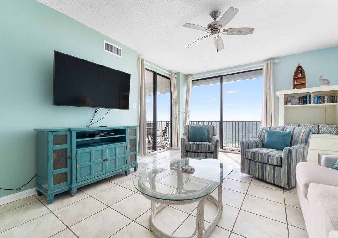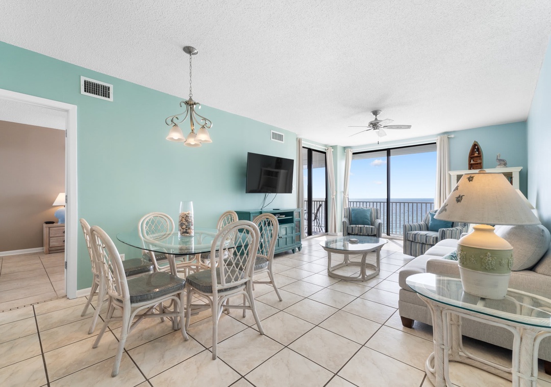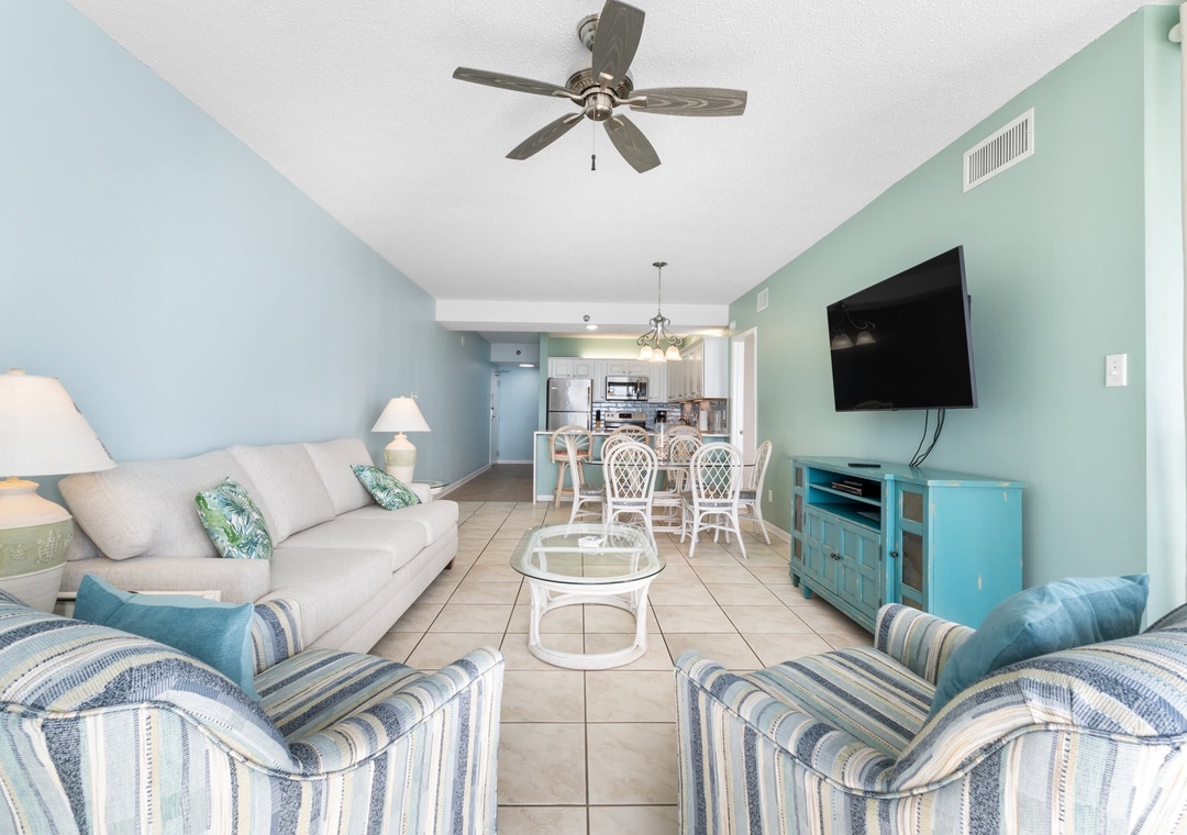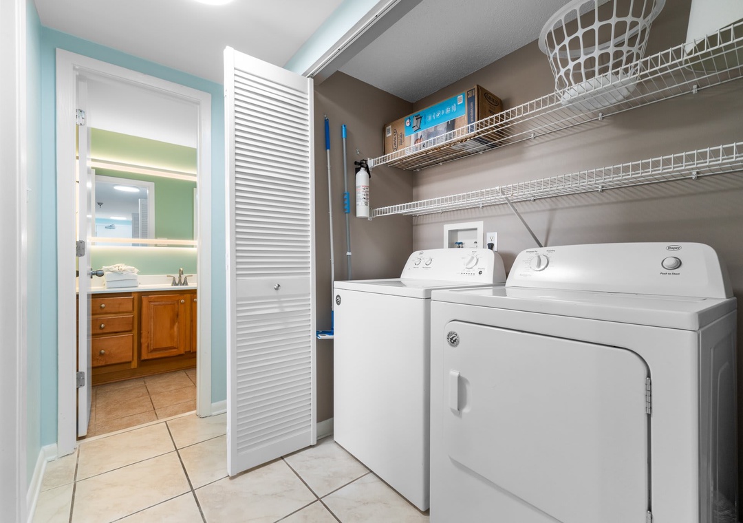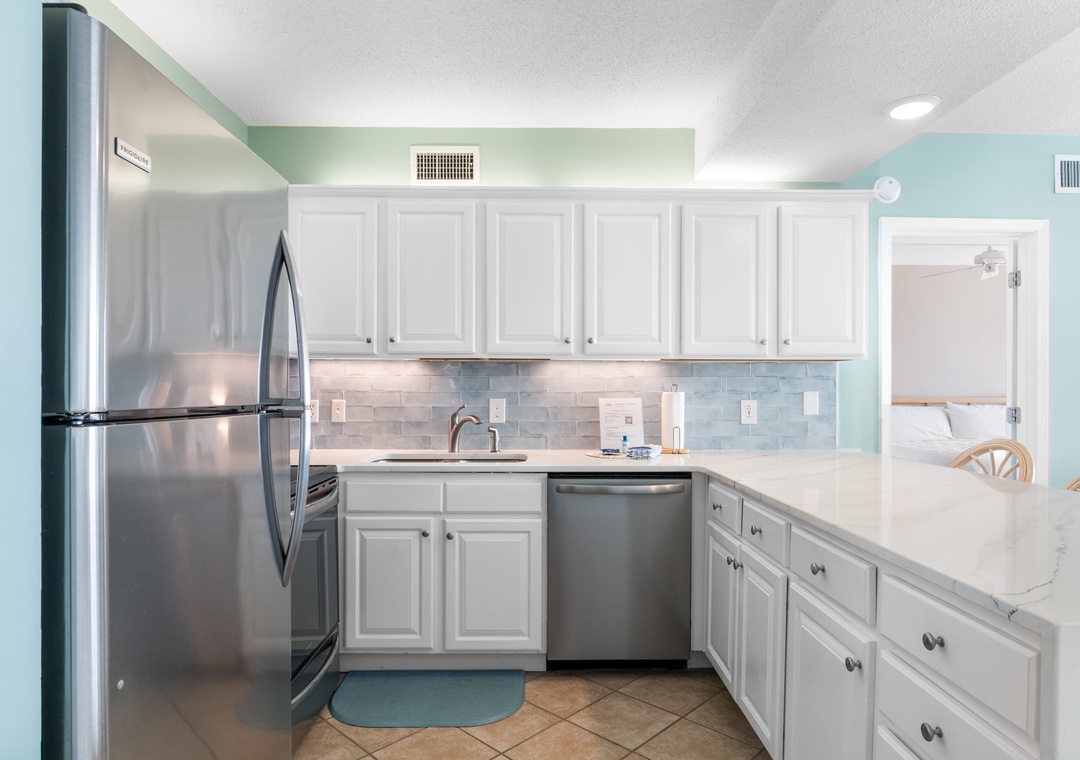 Inside this open concept space you will find light flowing in from the private balcony with incredible views of the Gulf of Mexico. The well-equipped kitchen features stainless steel appliance and is stocked with pots/pans/utensils. Step into the dining area with the dining table that comfortably seats six with additional seating for three at kitchen bar. The living space has a flat screen TV to relax after a day on the beach. This unit is equipped with a washer and dryer in the unit.