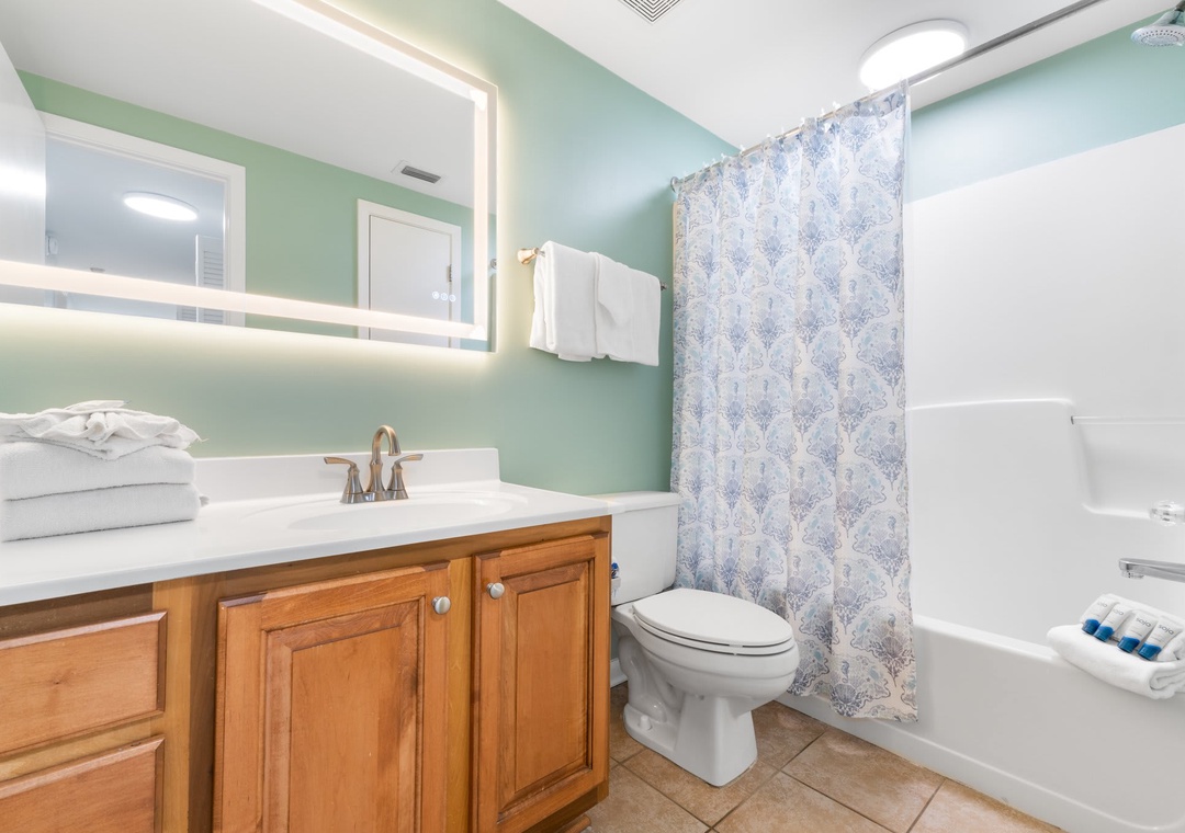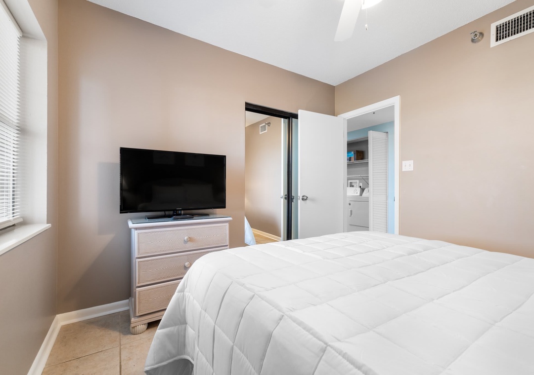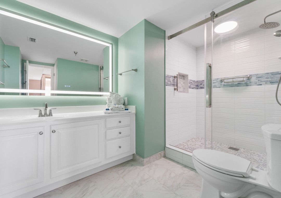 The main bedroom features a king-size bed with flat screen TV and access to the balcony. En-suite main bathroom features a large vanity with brand new walk-in shower. Second bedroom features a queen-size bed and second bathroom has a shower/tub combo. The third bedroom with two twin-size beds.