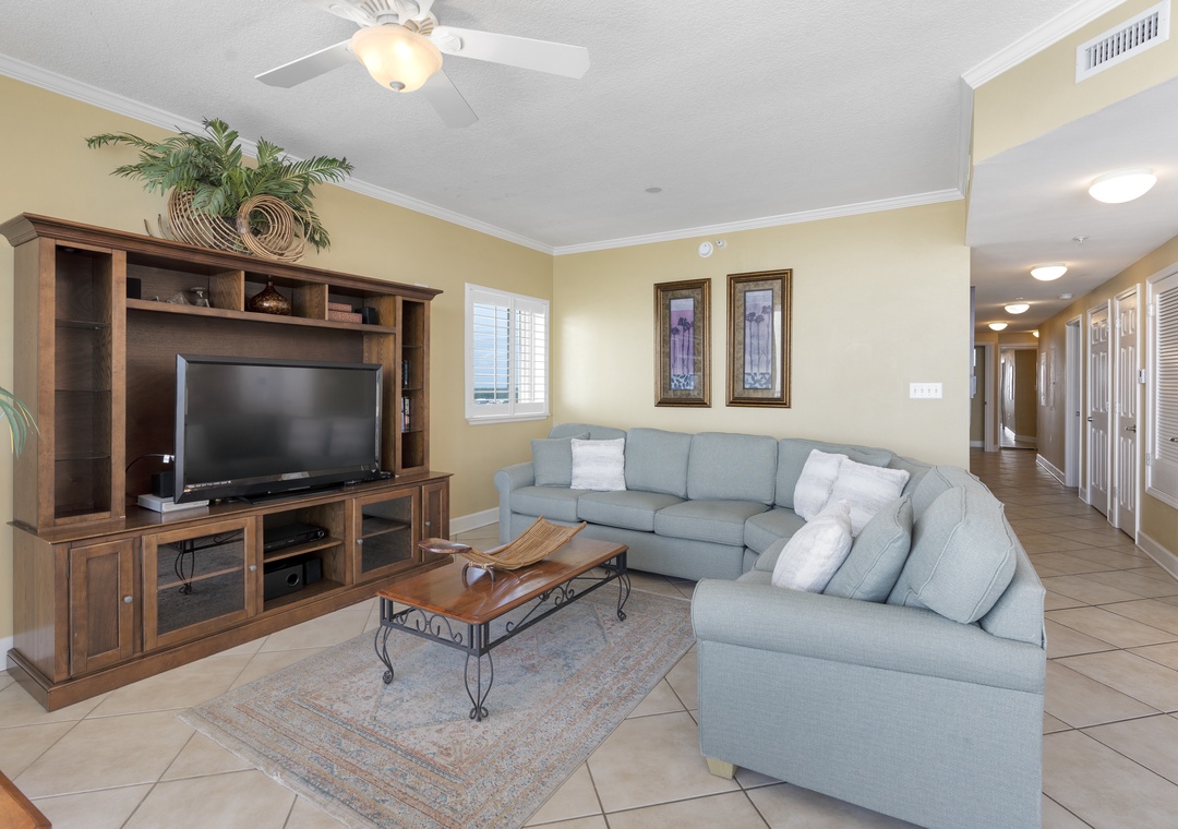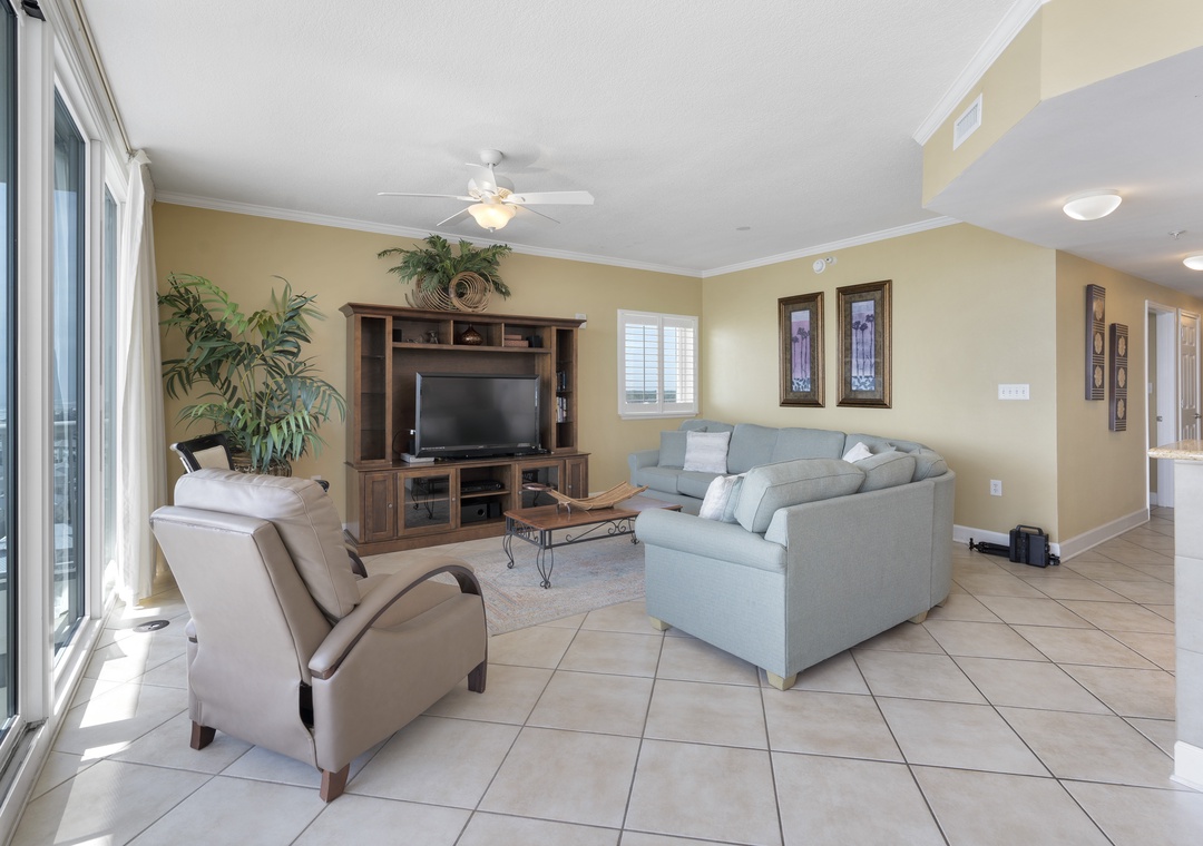 Enjoy panoramic views of both the Gulf of Mexico and Little Lagoon from multiple vantage points throughout the condo, including the floor-to-ceiling windows in the living area and bedrooms. The tile flooring throughout adds a clean, modern feel, and the spacious living room features a large flat-screen TV and a sleeper sofa for additional sleeping arrangements.