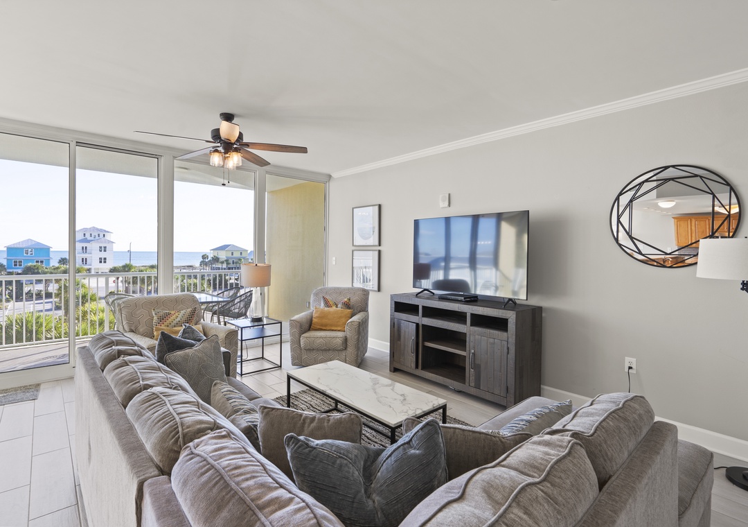 Sanibel 305 features chic tile flooring throughout, a fully equipped kitchen with granite countertops and stainless steel appliances, and a cozy living room with a sofa sleeper and large flat-screen TV.