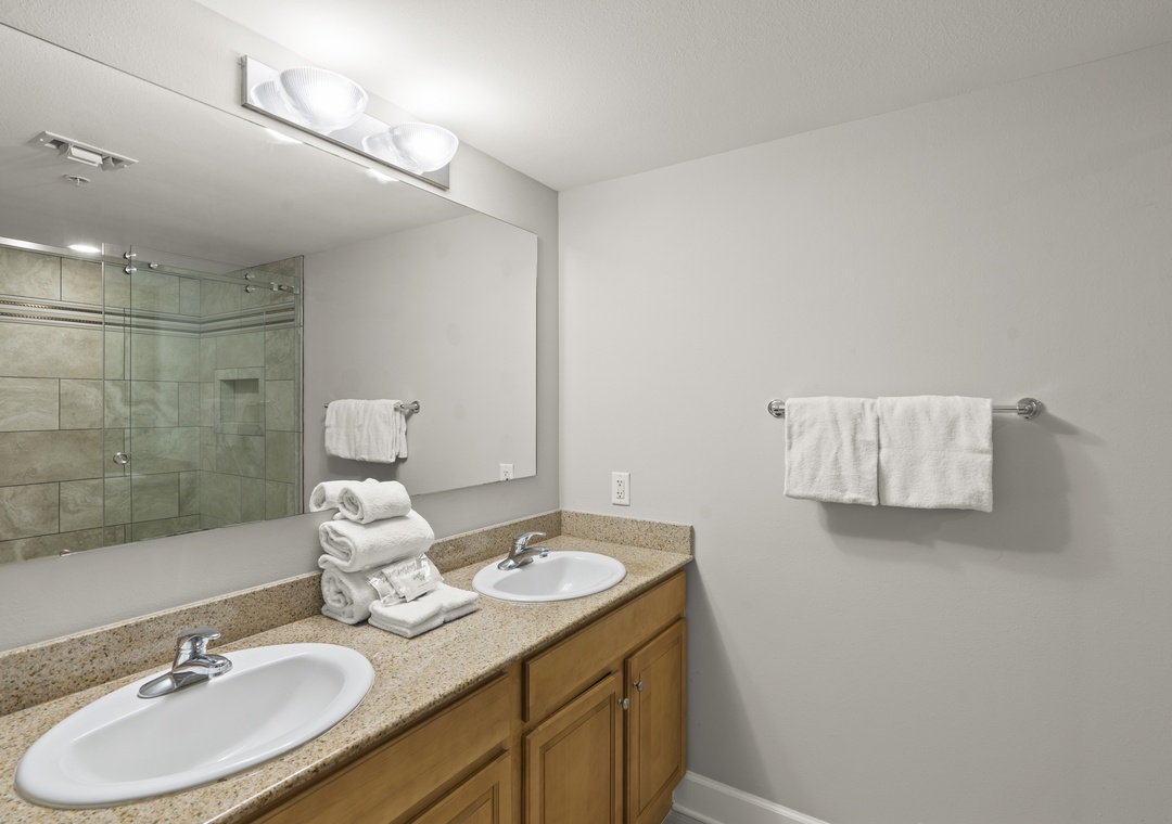 The Primary Suite features a plush King bed, flat-screen TV, and an ensuite bath with a large tiled walk-in shower. The Second Bedroom offers a Queen bed and a Twin-over-Queen bunk bed, plus a private bath and flat-screen TV—ideal for families or groups.