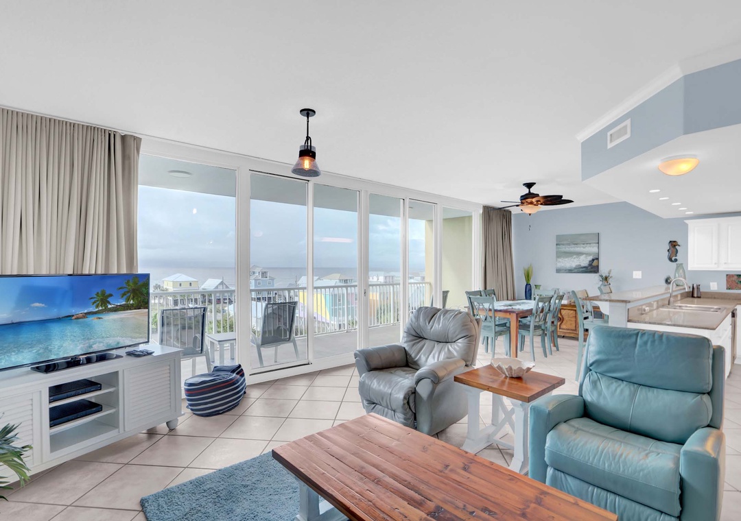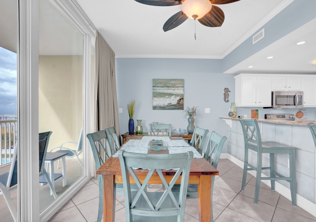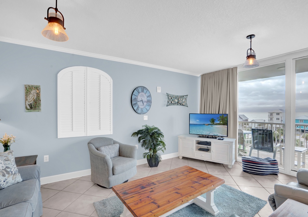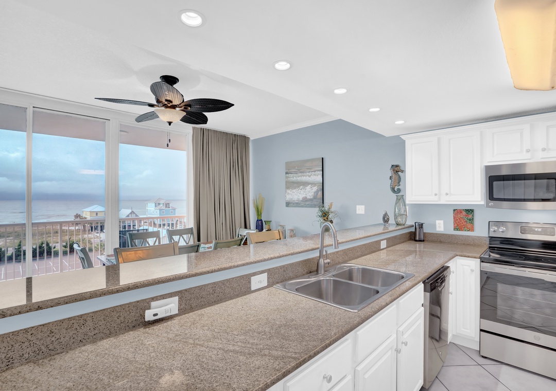Sanibel 502 features chic tile floors throughout, contributing to the sleek and airy coastal feel of the space. The fully equipped kitchen includes granite countertops, stainless steel appliances, and all the tools needed to prepare anything from quick snacks to gourmet meals. The open-concept living and dining area is bathed in natural light from the floor-to-ceiling windows, creating a bright and inviting space to gather, unwind, and enjoy the view.