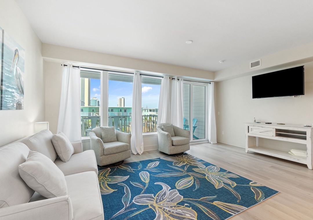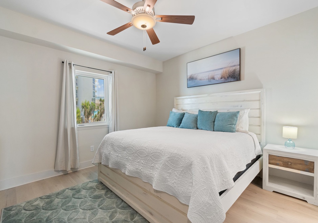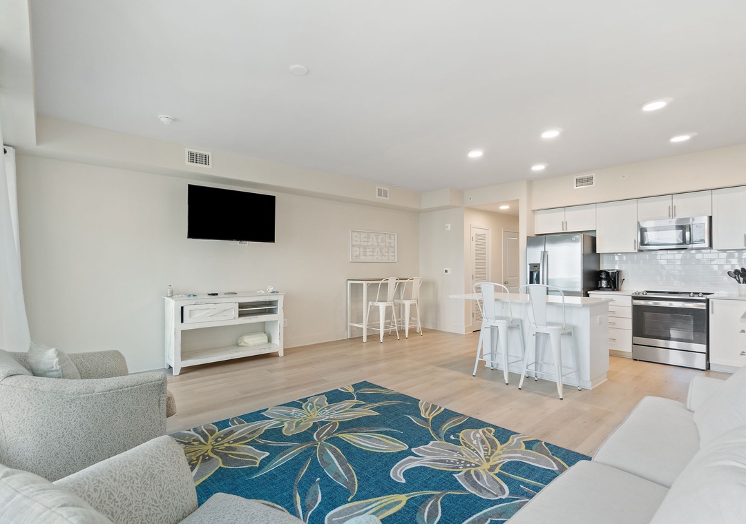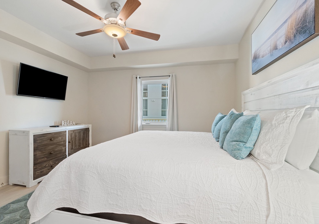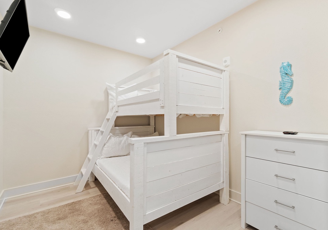 This second-floor condo features a bright and inviting layout. The master bedroom boasts a luxurious king-size bed, while the second room (media room) offers a twin-over-full bunk bed – ideal for kids or extra guests. The living area includes a sleeper sofa, ensuring plenty of space for everyone to unwind after a day at the beach.