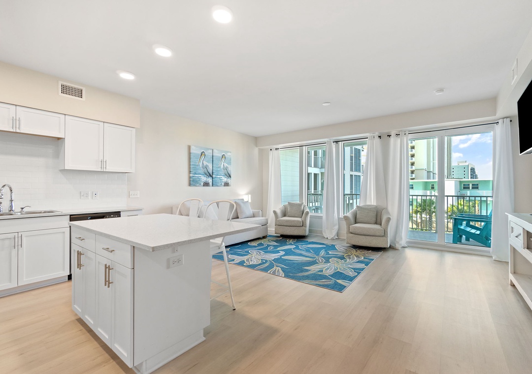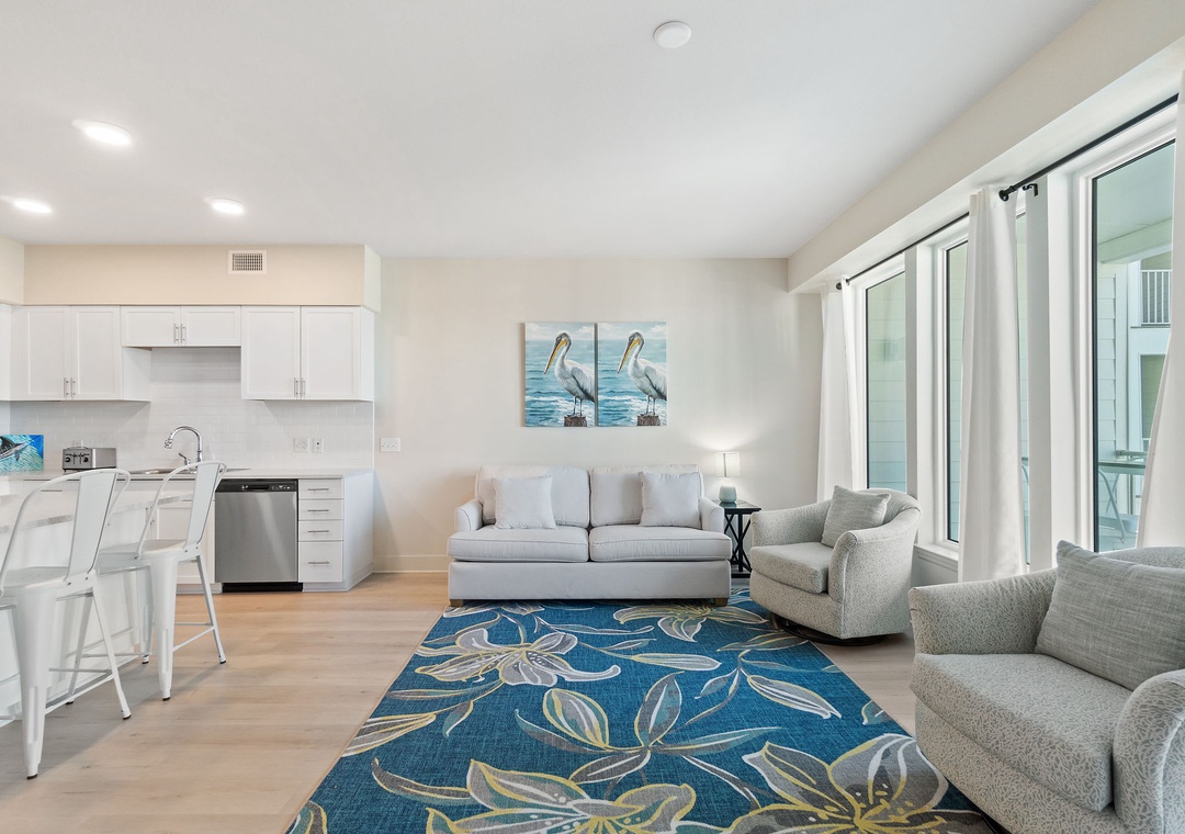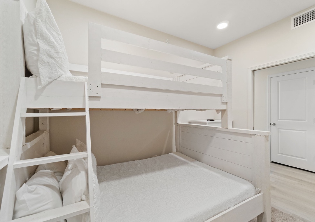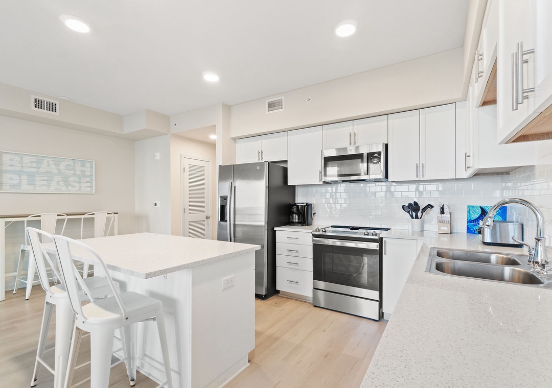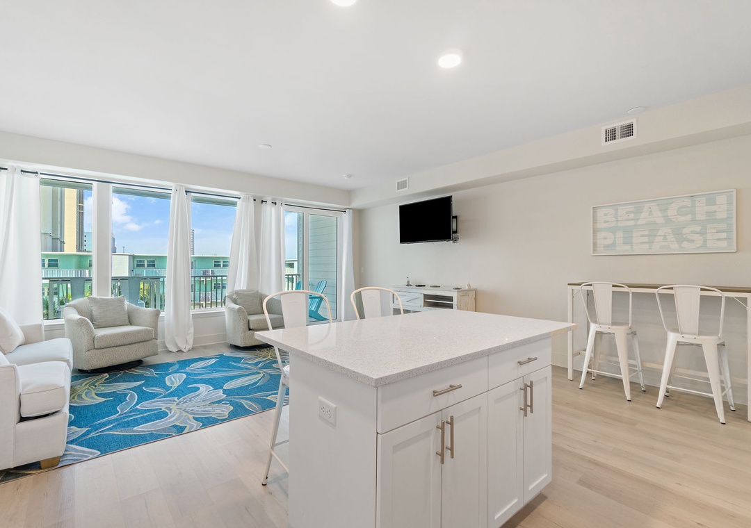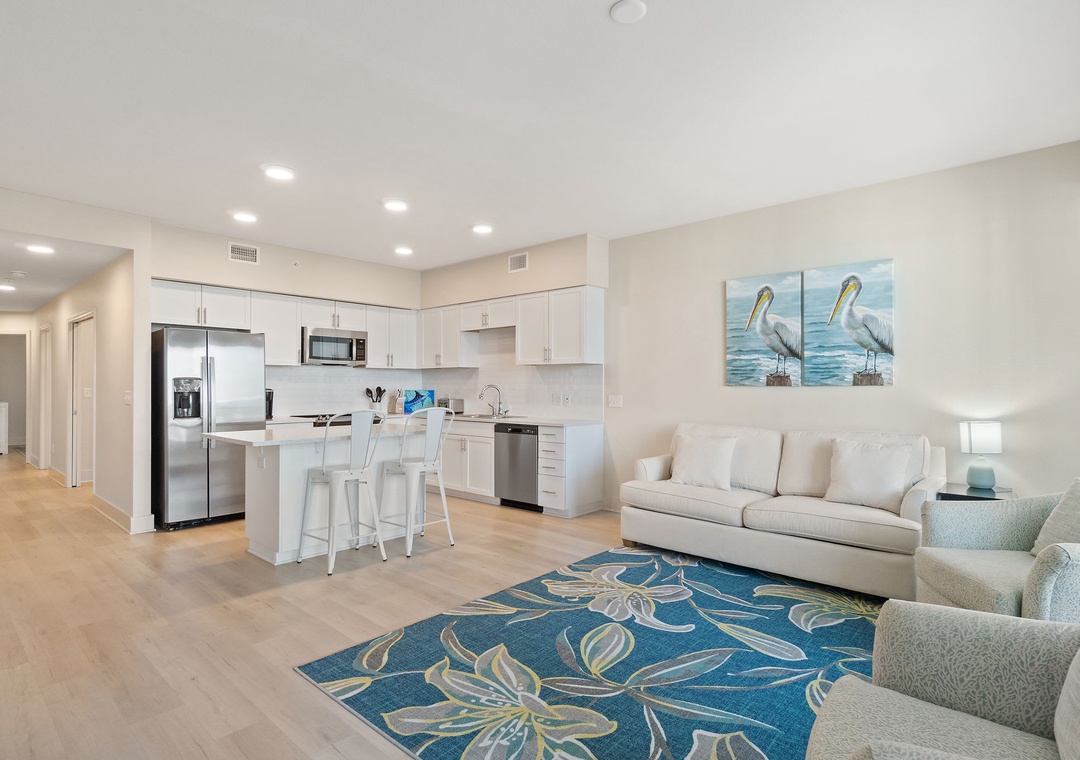 This second-floor condo features a bright and inviting layout. The master bedroom boasts a luxurious king-size bed, while the second room (media room) offers a twin-over-full bunk bed – ideal for kids or extra guests. The living area includes a sleeper sofa, ensuring plenty of space for everyone to unwind after a day at the beach.