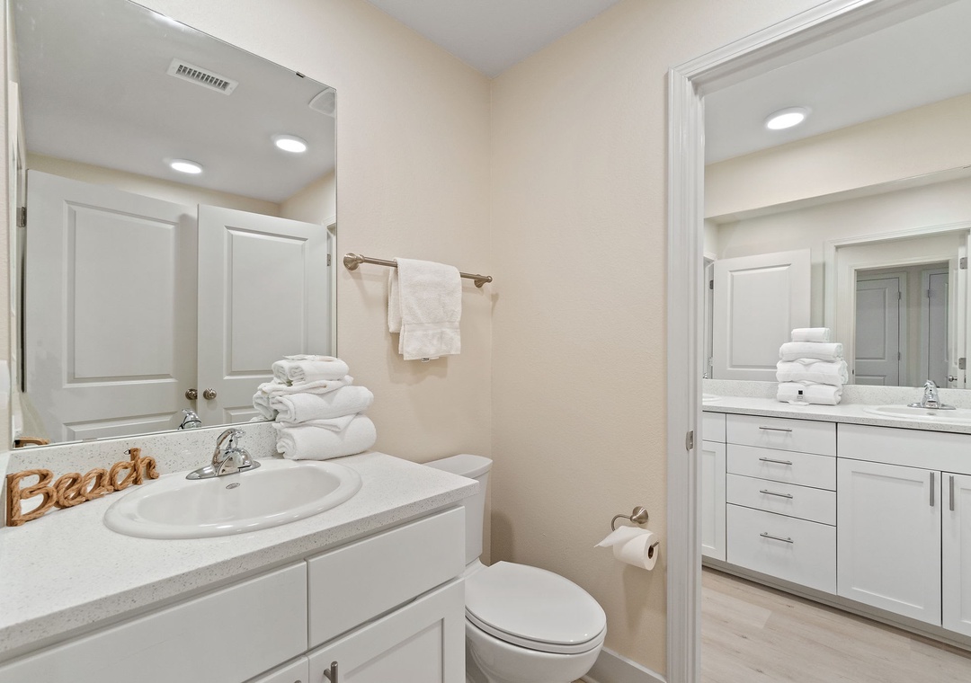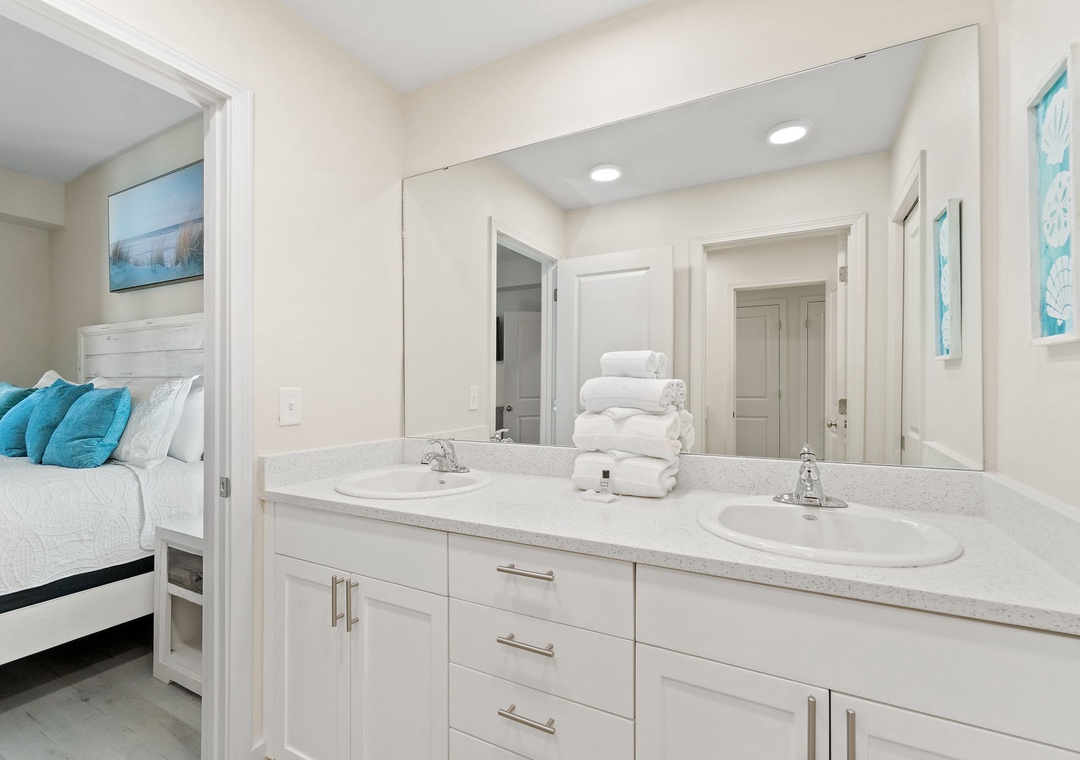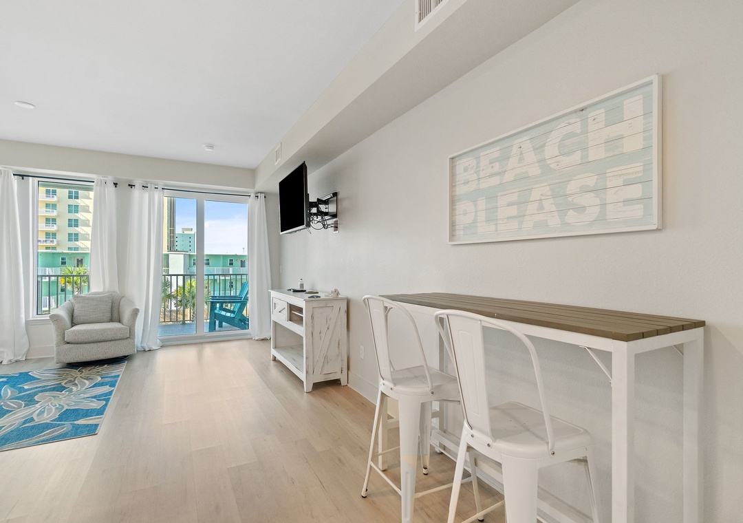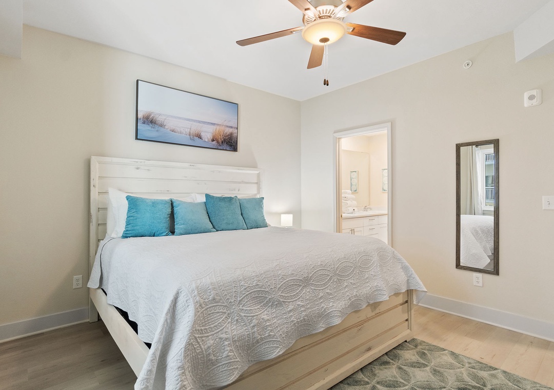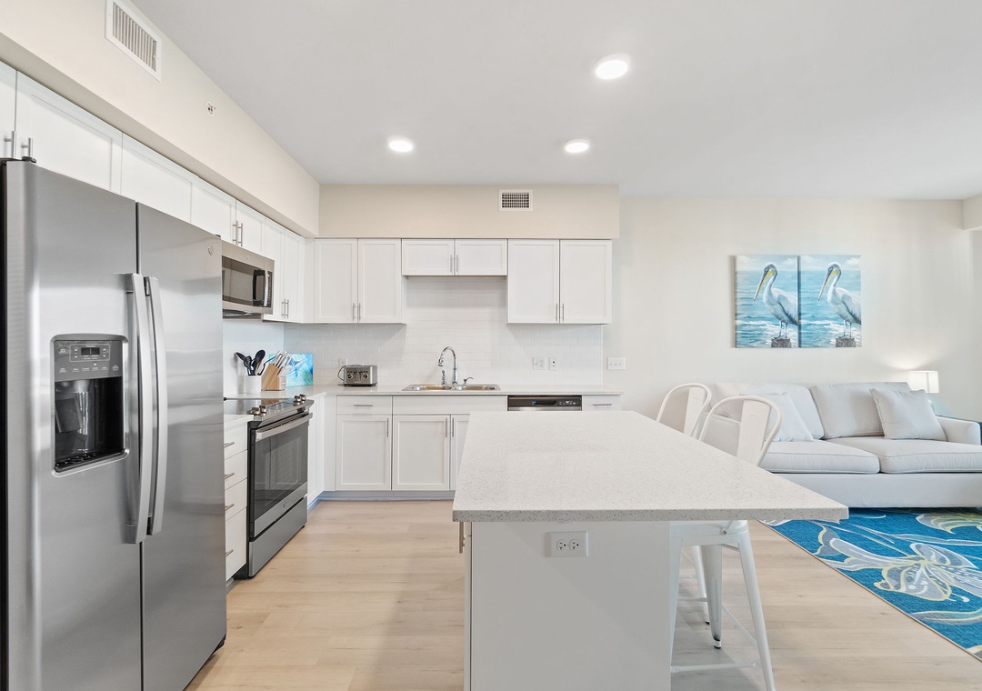 This second-floor condo features a bright and inviting layout. The master bedroom boasts a luxurious king-size bed, while the second room (media room) offers a twin-over-full bunk bed – ideal for kids or extra guests. The living area includes a sleeper sofa, ensuring plenty of space for everyone to unwind after a day at the beach.