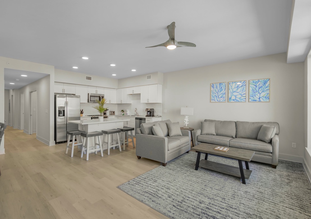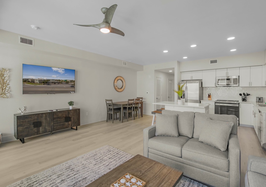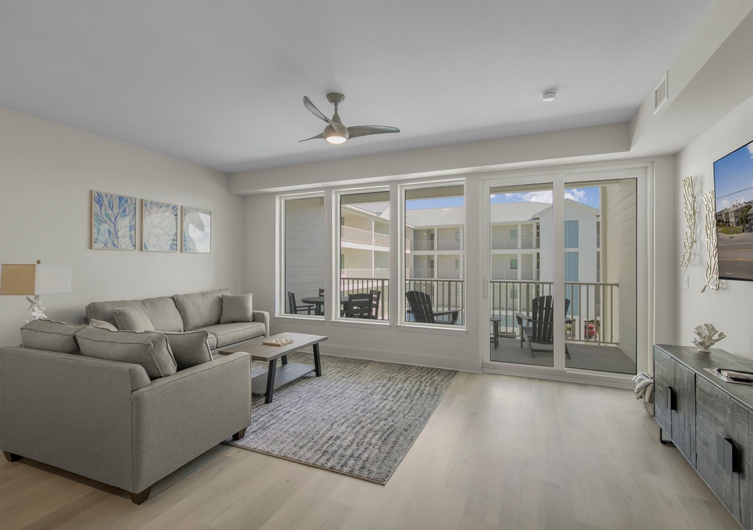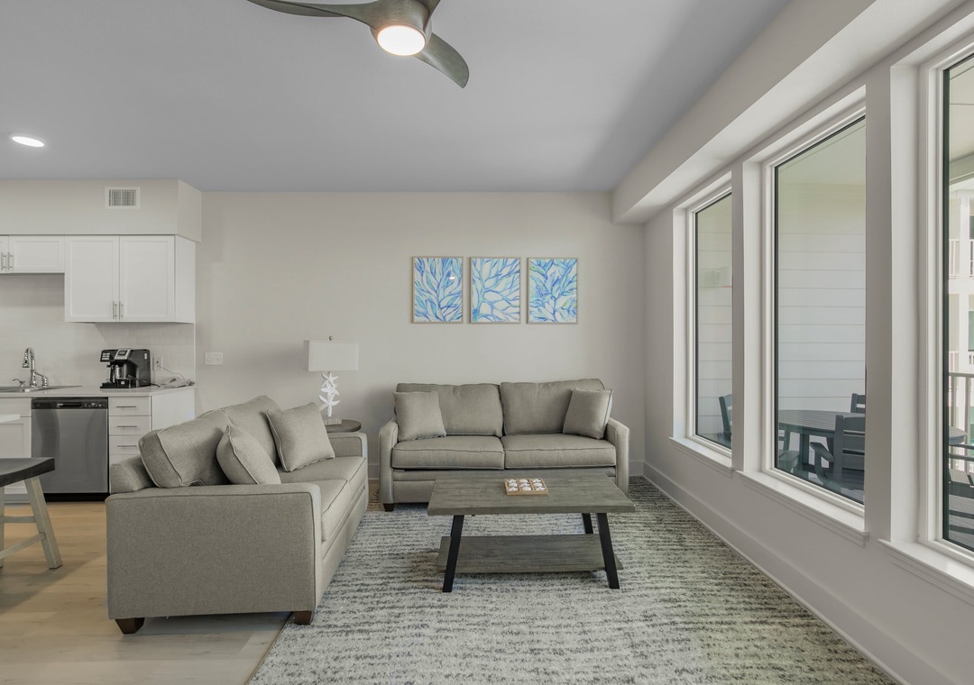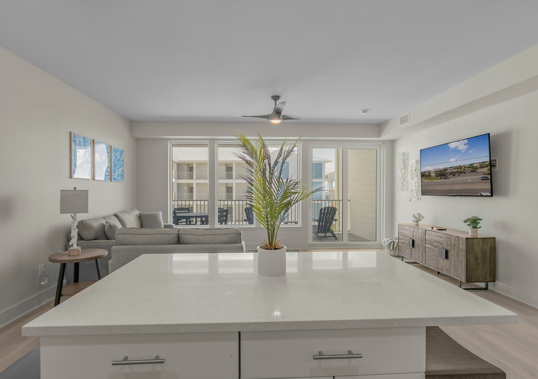 Relax in the large spacious living area with private balcony access that overlooks the sparkling Sea Glass pool. The has adirondacks for two or a dining table that seats four for outdoor entertaining. The living area has a mounted flat screen tv and sleeper sofa for additional guests. The fully stocked kitchen has all you will need for those vacay meals. There is bar seating for four at the island plus a beautiful dining table that also seats four.