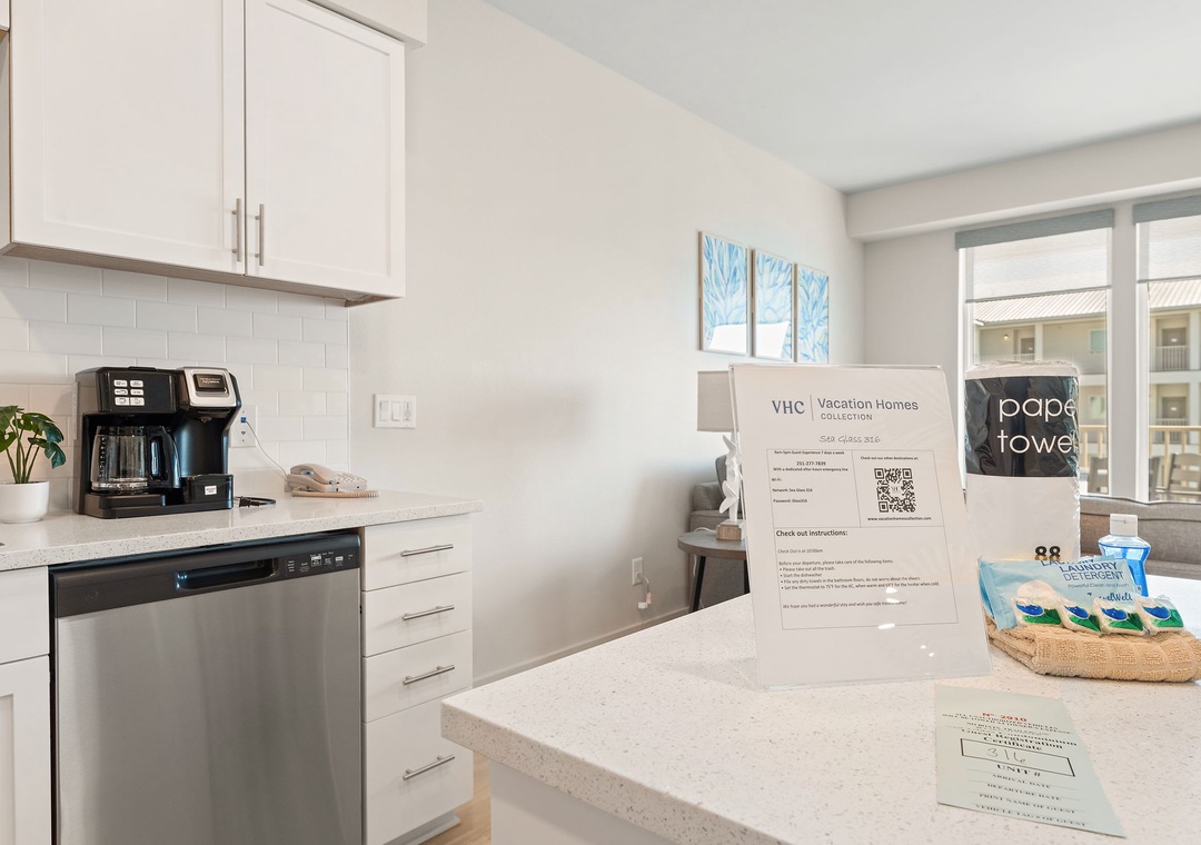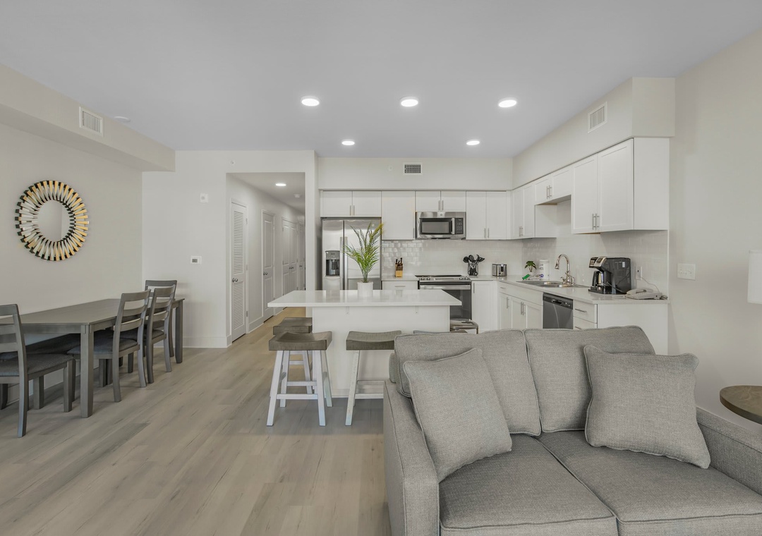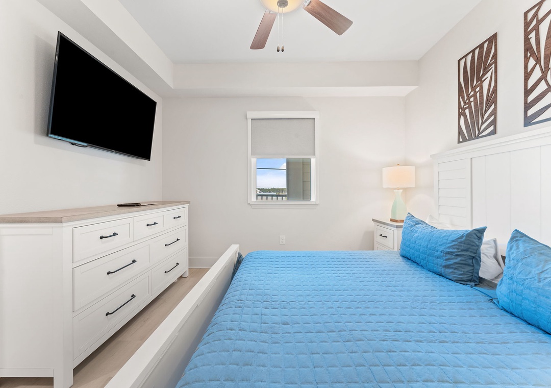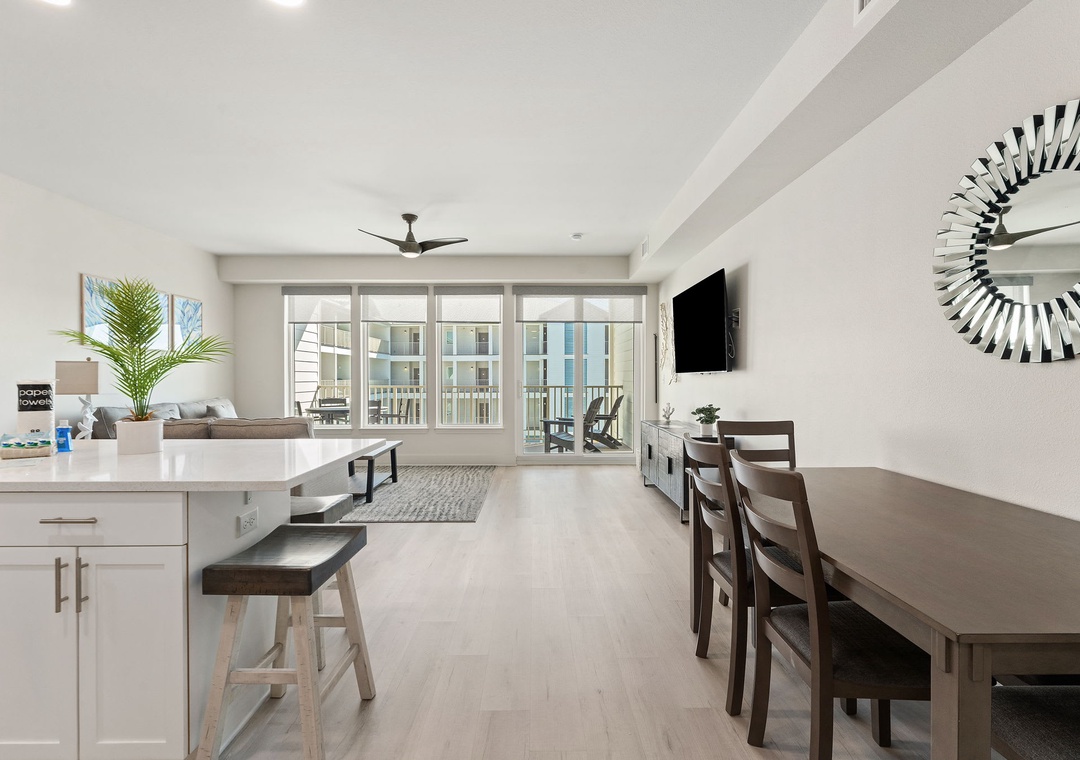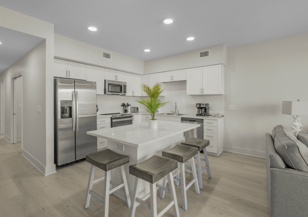 Relax in the large spacious living area with private balcony access that overlooks the sparkling Sea Glass pool. The has adirondacks for two or a dining table that seats four for outdoor entertaining. The living area has a mounted flat screen tv and sleeper sofa for additional guests. The fully stocked kitchen has all you will need for those vacay meals. There is bar seating for four at the island plus a beautiful dining table that also seats four.