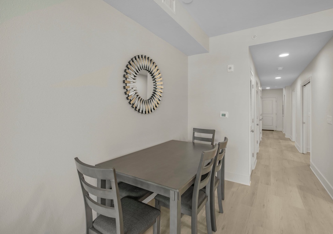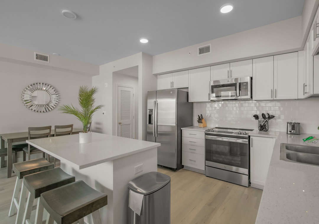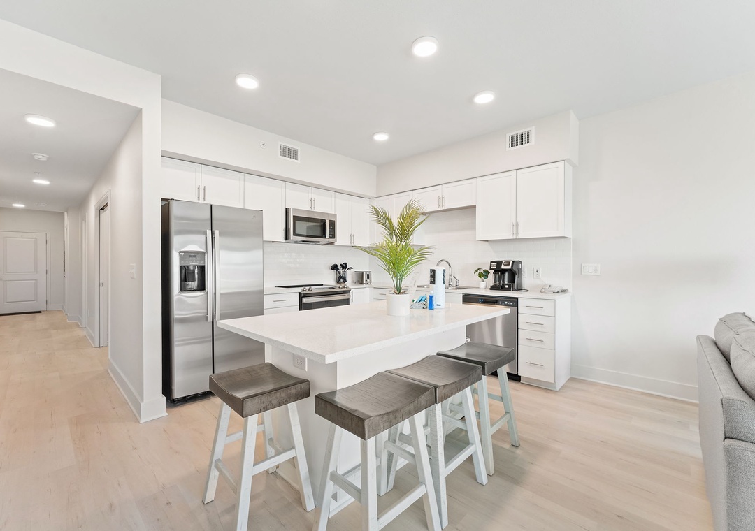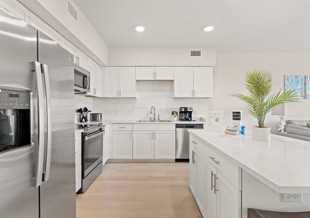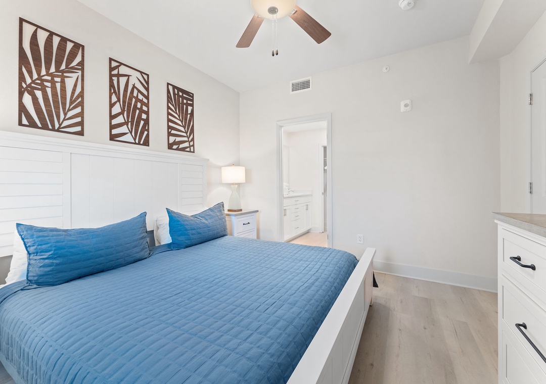 Relax in the large spacious living area with private balcony access that overlooks the sparkling Sea Glass pool. The has adirondacks for two or a dining table that seats four for outdoor entertaining. The living area has a mounted flat screen tv and sleeper sofa for additional guests. The fully stocked kitchen has all you will need for those vacay meals. There is bar seating for four at the island plus a beautiful dining table that also seats four.