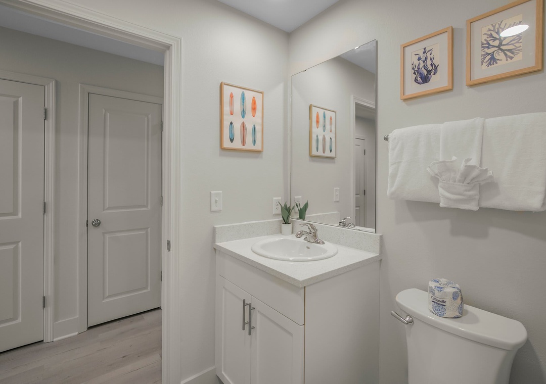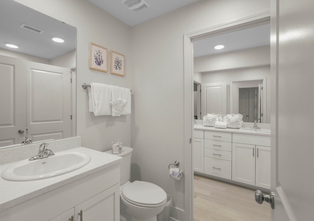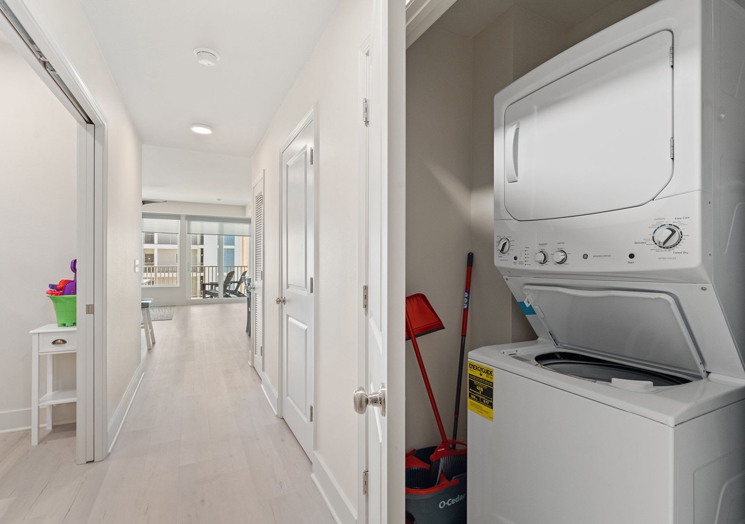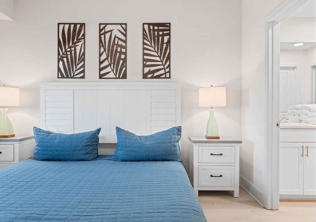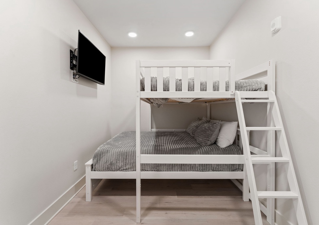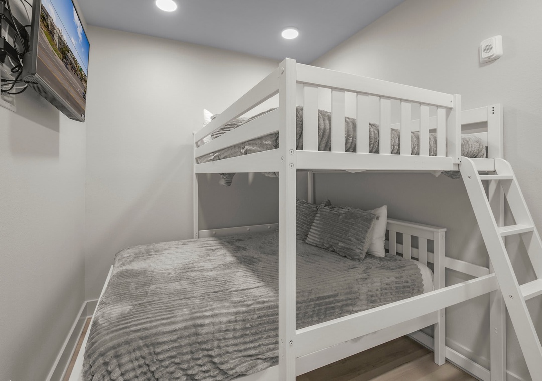Down the hall there is a king in the first bedroom along with a mounted flat screen tv. The en-suite bathroom features a tub/shower combo. The second bedroom has a full over full bunk bed as well as a mounted flat screen tv. In the halllway you will find an additional half bath as well as a washer and dryer for your convenience.