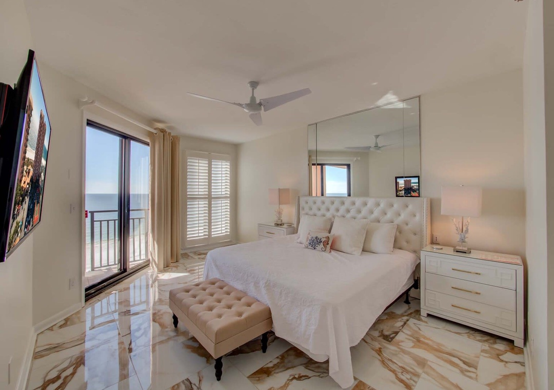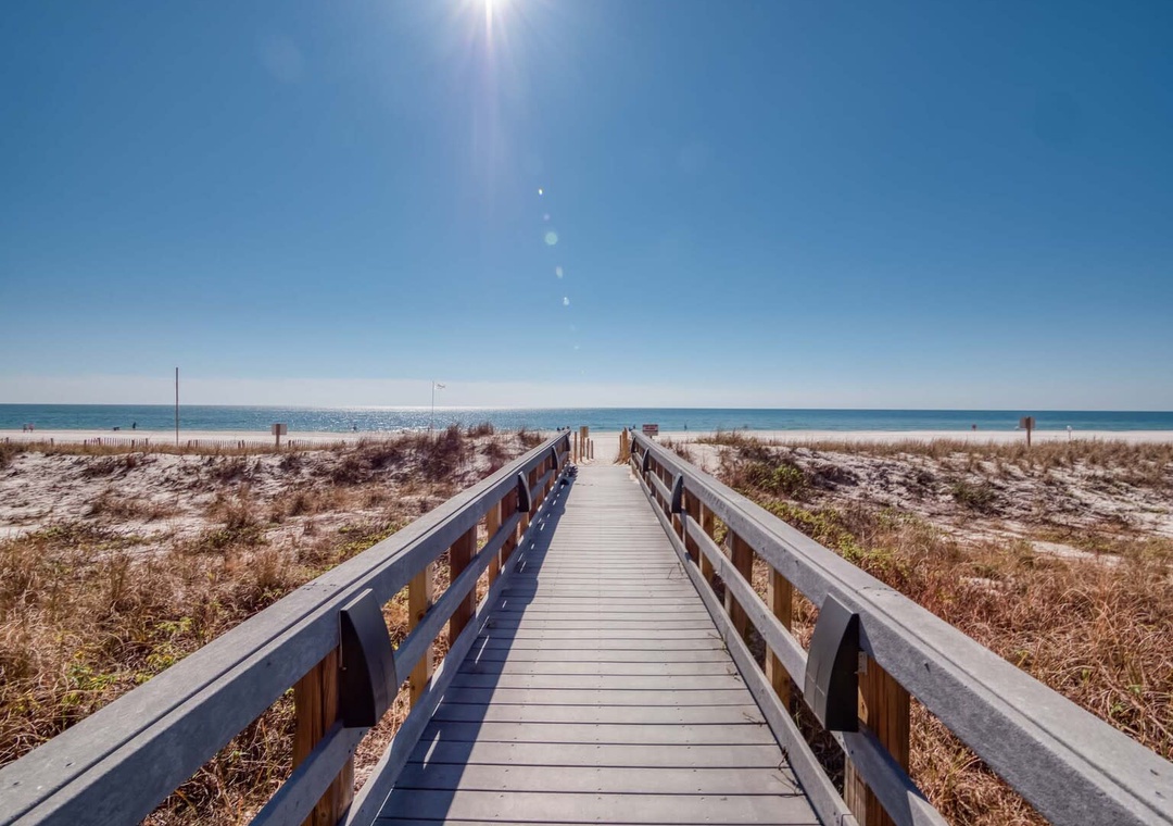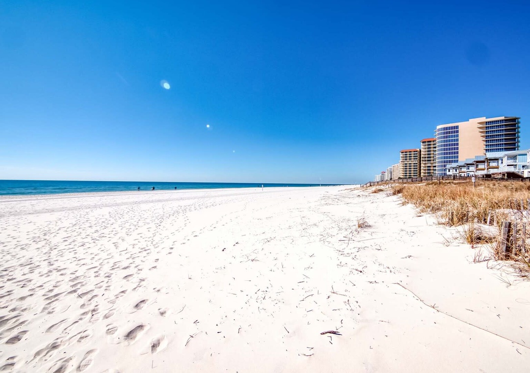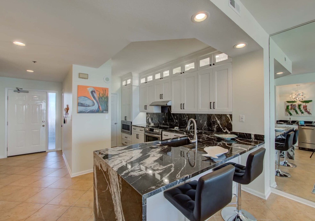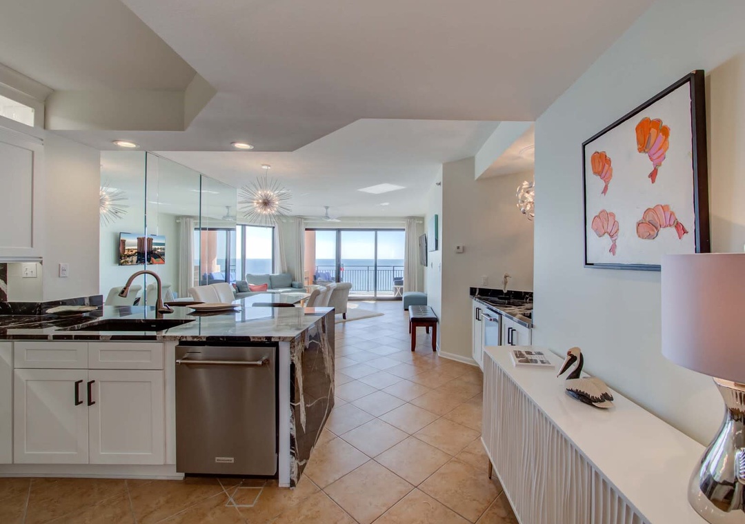Upon entering this exquisitely modern condo take in the recently renovated kitchen with beautiful countertops and stainless-steel appliances. This well-equipped kitchen has everything needed to create a spectacular homecooked meal. Washer and dryer are located in the pantry off of the kitchen for your convenience. The open concept layout features a dining area with four seats and additional seating for two at the kitchen bar. Relax in the comfortable living area after a long day at the beach with a flat screen TV and sleeper sofa. Enjoy a beautiful Alabama sunset on the private terrace right off of the living area. The stunning main bedroom features a king-size bed with access to the balcony. The en-suite bathroom has a double vanity with large soaking tub and walk-in shower. The spacious second bedroom has a queen-size bed and flat screen tv. The second bathroom has a tub/shower combo.