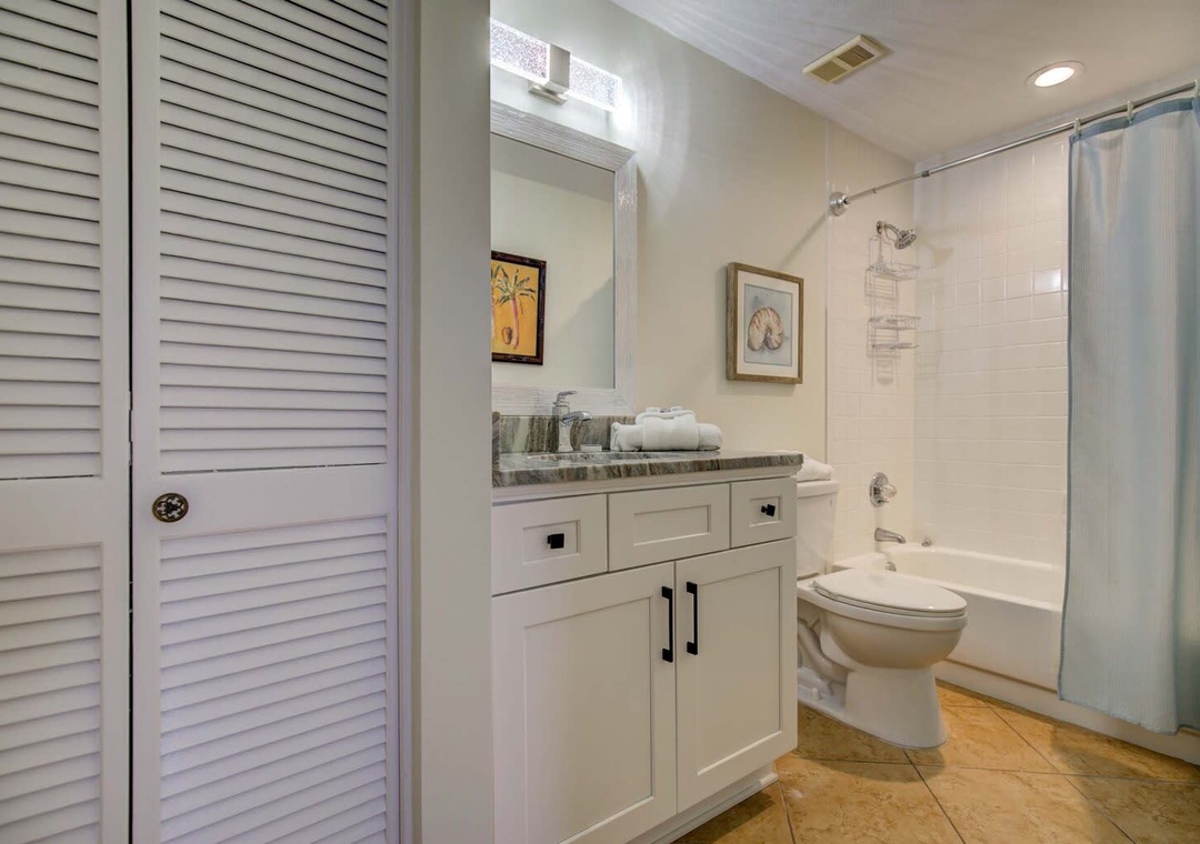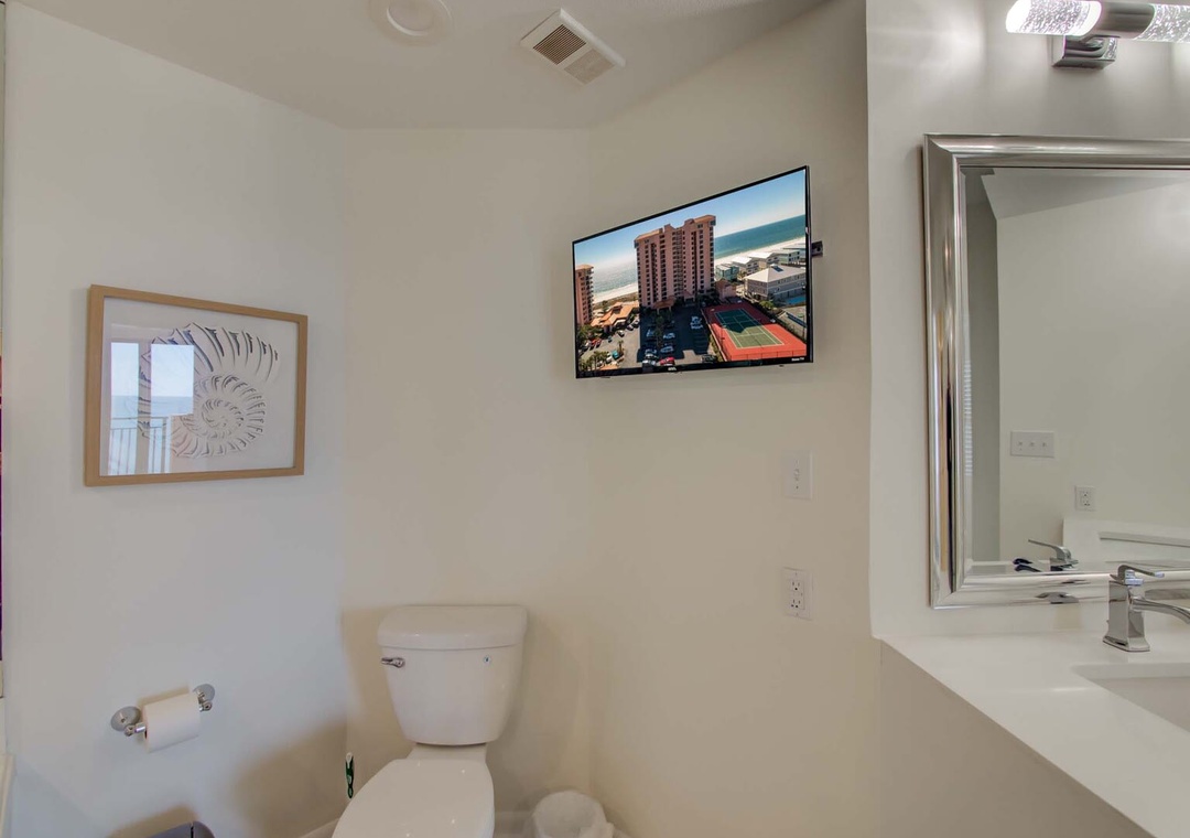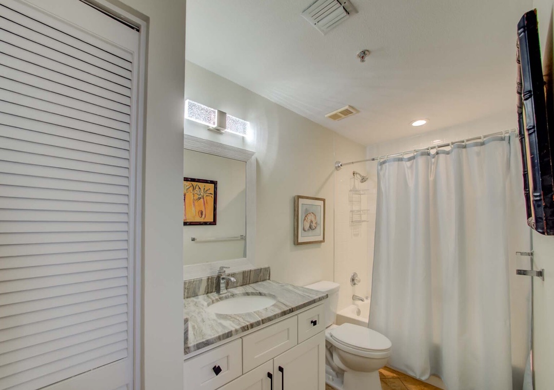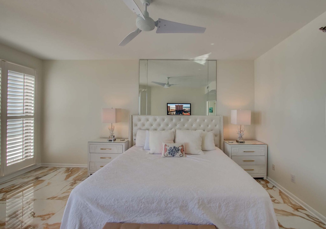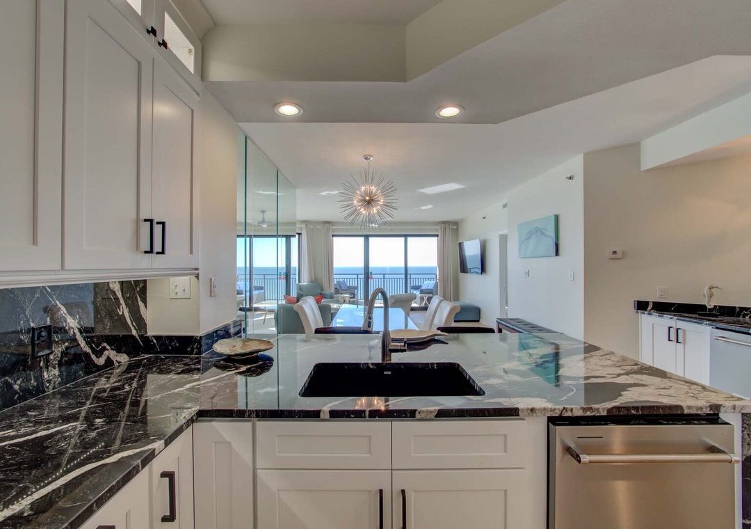 Upon entering this exquisitely modern condo take in the recently renovated kitchen with beautiful countertops and stainless-steel appliances. This well-equipped kitchen has everything needed to create a spectacular homecooked meal. Washer and dryer are located in the pantry off of the kitchen for your convenience. The open concept layout features a dining area with four seats and additional seating for two at the kitchen bar. Relax in the comfortable living area after a long day at the beach with a flat screen TV and sleeper sofa. Enjoy a beautiful Alabama sunset on the private terrace right off of the living area. The stunning main bedroom features a king-size bed with access to the balcony. The en-suite bathroom has a double vanity with large soaking tub and walk-in shower. The spacious second bedroom has a queen-size bed and flat screen tv. The second bathroom has a tub/shower combo.