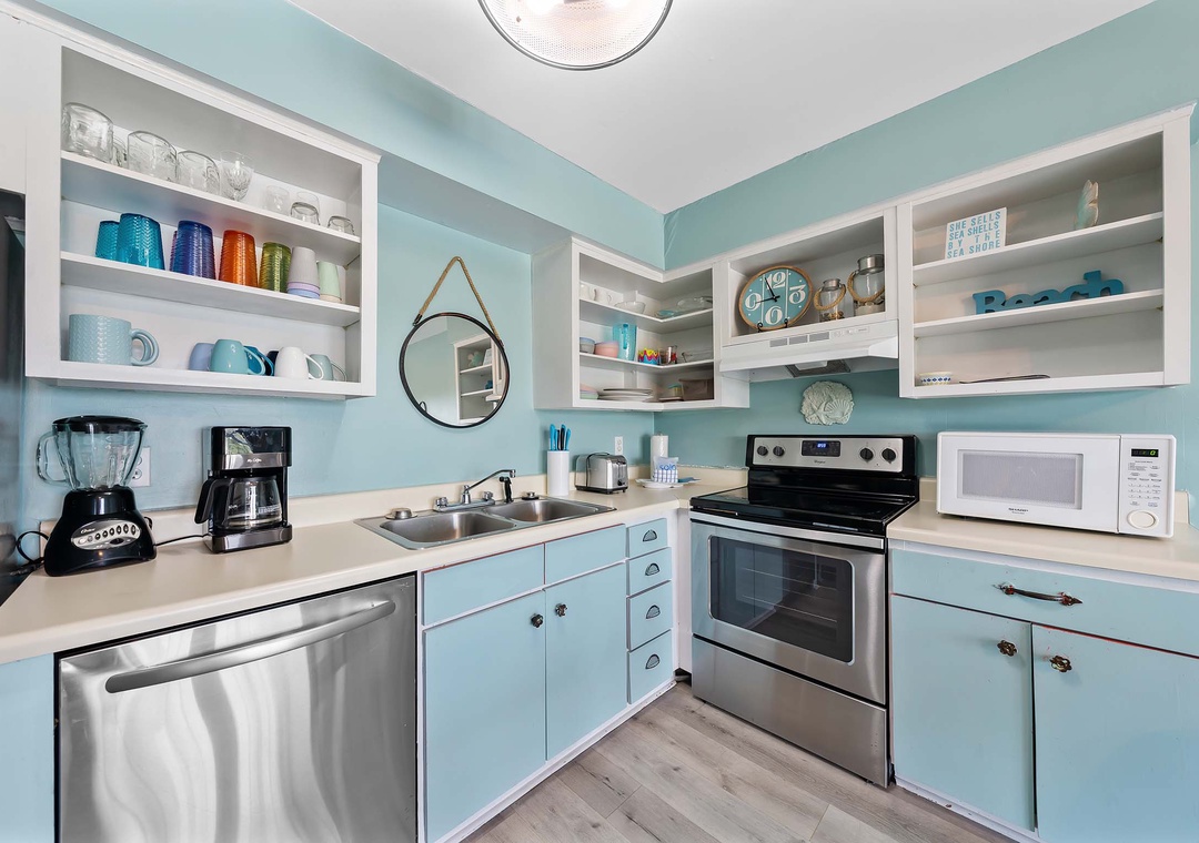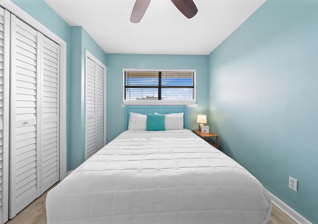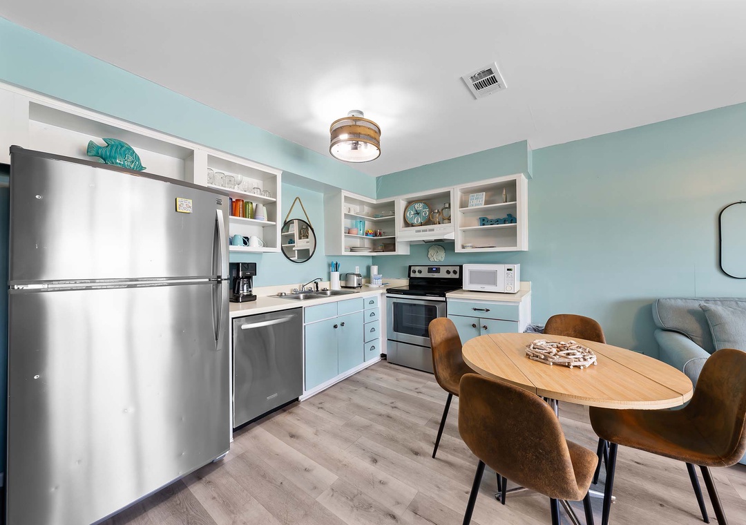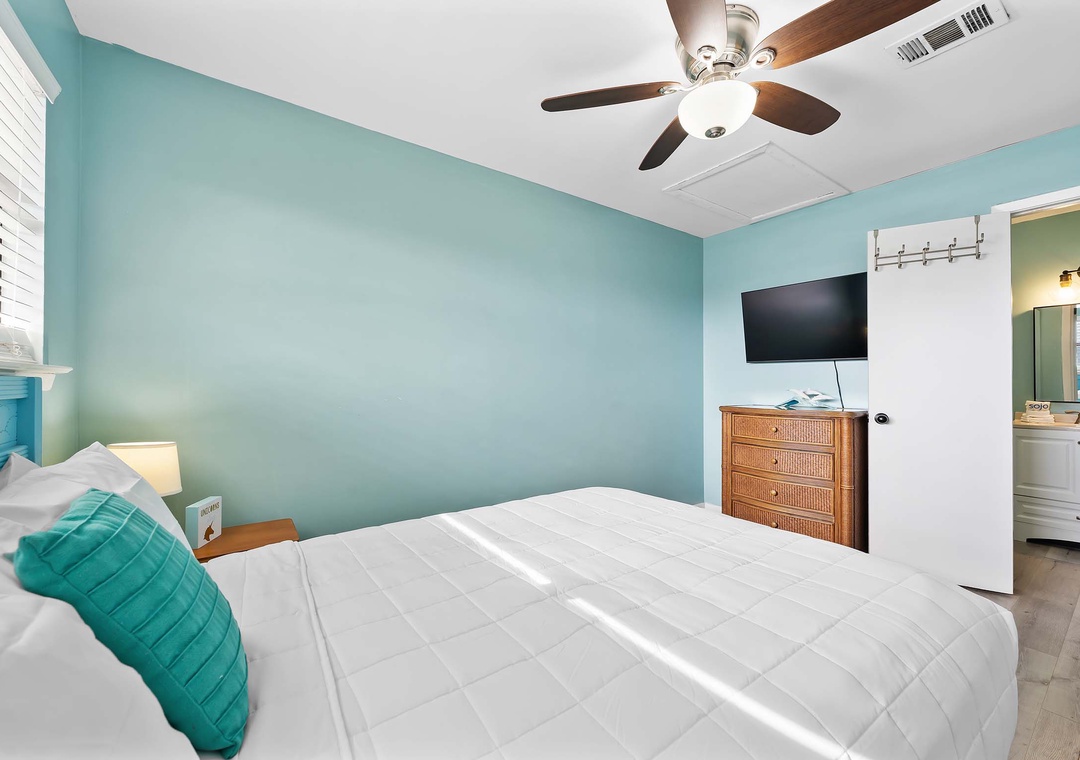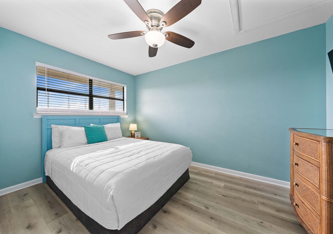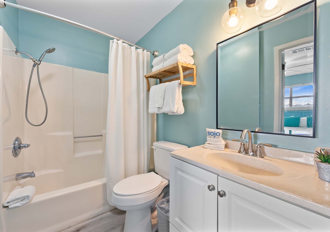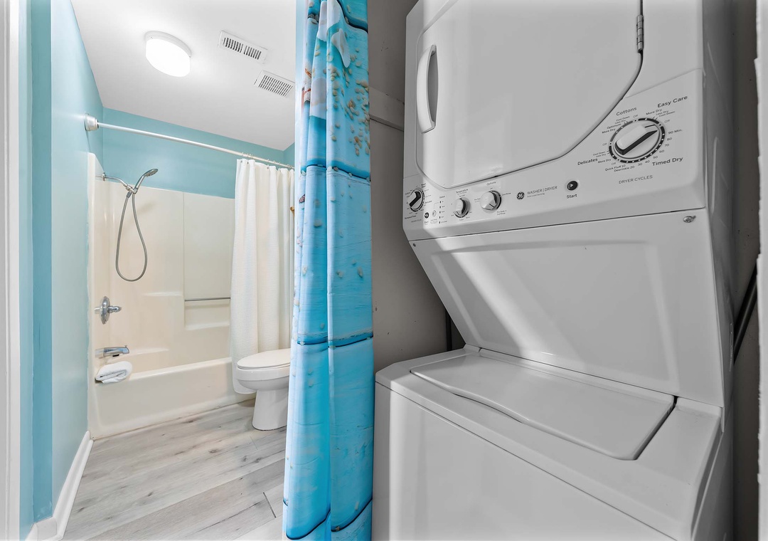 The Primary bedroom features a comfortable Queen-size bed and private entry to the shared bathroom, which has been upgraded with a beautiful marble-tiled walk-in shower for a touch of luxury. The fully stocked kitchen includes stainless steel appliances, granite countertops, and everything you need to prepare meals during your stay. A coffee maker and Keurig are available to jumpstart your mornings. A stackable washer and dryer in the hallway make it easy to refresh your beachwear.